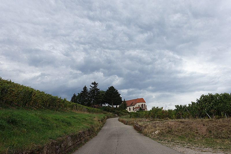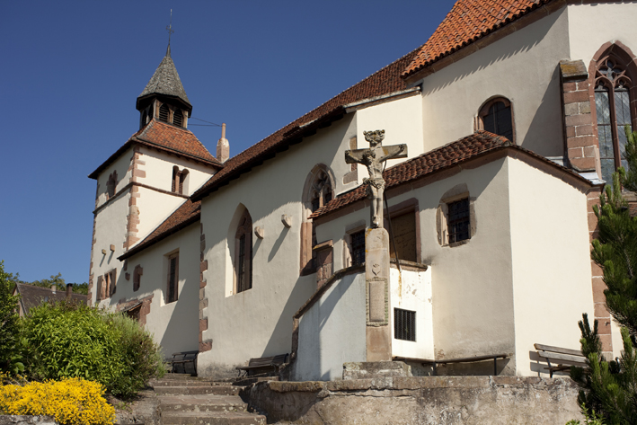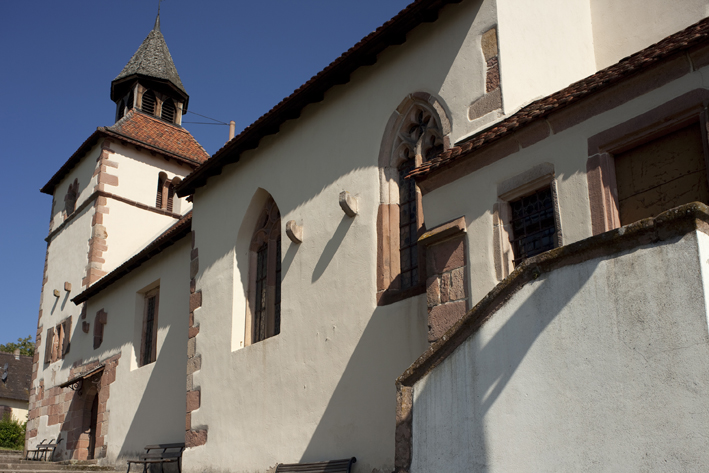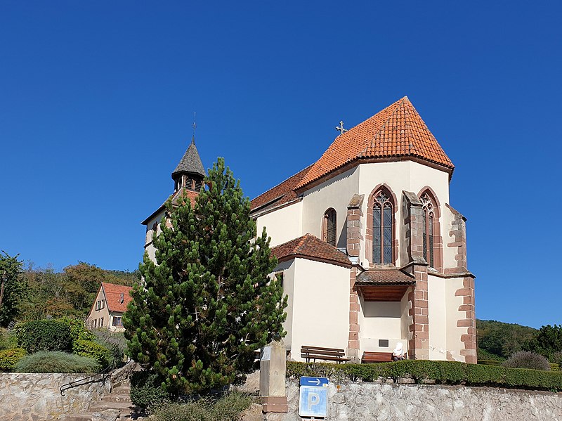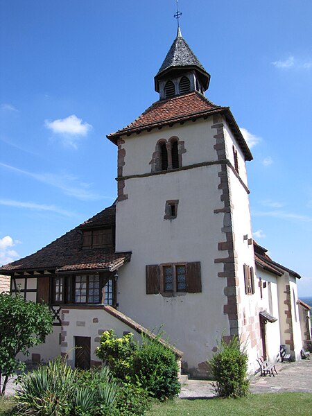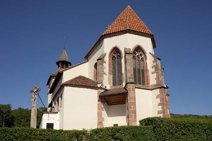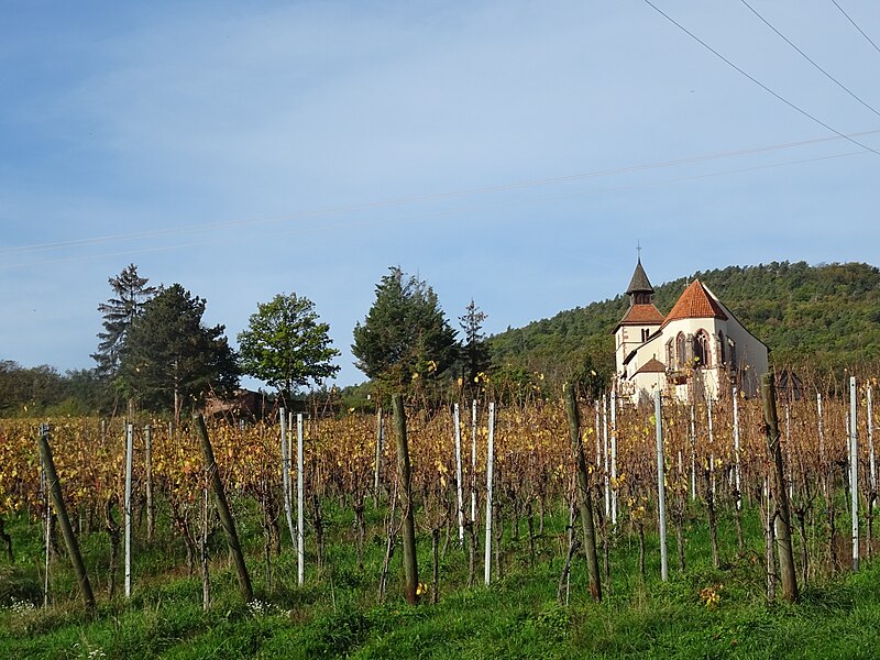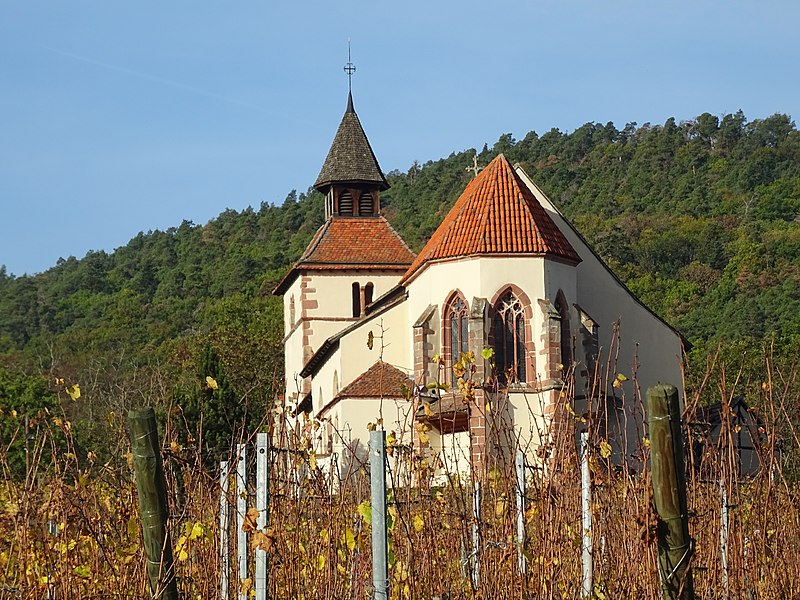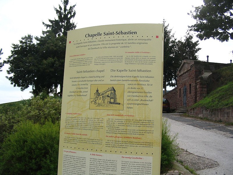 La chapelle Saint-Sébastien, située à Dambach-la-Ville dans le Bas-Rhin, est une chapelle de pèlerinage classée monument historique par arrêté du 24 mai 1921. Partiellement endommagée pendant la Seconde Guerre mondiale, elle rassemble des éléments architecturaux de plusieurs époques. Les parties les plus anciennes — la tour-clocher, l'ossuaire et une portion de la nef — remontent probablement au XIIe siècle; le chœur a été reconstruit au début du XIVe siècle, la nef remaniée aux XVe et XVIIe siècles et la sacristie ajoutée en 1685. Le logement du gardien a été reconstruit en 1963. Perchée sur les hauteurs du vignoble du Frankstein, à flanc de coteau, la chapelle domine Dambach-la-Ville et la région entre Sélestat au sud et la colline d'Epfig au nord. La vue s'étend à l'est sur le Kayserstuhl et la Forêt‑Noire; par temps clair, la flèche de la cathédrale de Strasbourg est parfois visible. La chapelle est l'ancienne église paroissiale du village disparu d'Oberkirch et apparaît pour la première fois dans un document daté de 1285. L'élévation de Dambach au rang de ville épiscopale en 1340, la construction de ses fortifications entre 1328 et 1340 et l'édification d'une nouvelle grande église entraînèrent le déclin d'Oberkirch. L'ordonnance de l'évêque Jean II de Lichtenberg en 1356, qui imposa que tous les offices se tiennent à l'église Saint‑Étienne de Dambach, précipita la disparition du village, tandis que Saint‑Sébastien conserva sa fonction de lieu de pèlerinage. La chapelle fut donnée la même année aux chanoines augustins de Dachstein, transférée à la cathédrale de Strasbourg en 1359, puis cédée au milieu du XVe siècle aux Hospices civils de Strasbourg. En 1480 le pape Innocent VIII supprima les deux vicariats d'Oberkirch et d'Altenwiller. Confisquée pendant la Révolution française, elle fut vendue aux enchères en 1792 après des tensions liées au refus de serment du curé Zaepffel et de son vicaire. Les habitants, partisans du curé, achetèrent collectivement la chapelle pour 1420 livres; trente‑deux donateurs assumèrent alors son administration et leurs descendants forment aujourd'hui la Confrérie Saint‑Sébastien, association de droit local alsacien‑mosellan responsable de sa conservation. Après la Seconde Guerre mondiale, la chapelle, endommagée par des faits de guerre et en mauvais état, a été restaurée grâce à des financements des Monuments historiques, du conseil général, de la commune et de la population; elle a été rendue aux fidèles et aux visiteurs le lundi de Pâques 1962. La chapelle présente un mélange de styles : un clocher roman, une nef et un chevet gothiques, une sacristie de la Renaissance et un maître‑autel baroque. La tour‑clocher, la partie la plus ancienne, est massive, carrée et probablement du XIIe siècle; son assise sans ouverture originelle suggère une fonction défensive. L'étage des cloches comporte quatre fenêtres bigéminées à arcades en plein cintre et la tour est coiffée d'un toit pyramidal tronqué, d'un couronnement carré en bois et d'un clocheton octogonal surmonté d'une croix. Un bâtiment central à toit en bâtière relie la tour au chevet et abrite la nef; le mur sud comporte une porte romane à côté de la tour, une grande fenêtre rectangulaire du XVIIe siècle au vitrage en cul‑de‑bouteille et deux fenêtres gothiques du XVe siècle. À l'est, la sacristie de style Renaissance, datée du XVIIe siècle, est accessible par un escalier extérieur, et la façade nord présente deux fenêtres gothiques pendantes et une fenêtre romane « dormante ». Le chevet gothique du début du XIVe siècle, décalé par rapport à la nef, est renforcé par quatre contreforts étagés qui encadrent trois baies vitrées, et son pignon offre une croix florencée en granite. La niche entre deux contreforts abritait autrefois un groupe sculpté en bois représentant Jésus au Mont des Oliviers, aujourd'hui disparu, et la partie nord du pignon de la nef renferme une cave voûtée ancienne servant d'ossuaire, dont l'origine reste incertaine. Au droit de la sacristie se dresse un Christ en croix daté de 1687, appelé localement la « Croix miraculeuse », dont l'expression est décrite comme mêlant douleur et miséricorde. La nef mesure 16,5 m de long, a une largeur comprise entre 9,5 et 10,5 m, est couverte d'un plafond plat en bois à poutres apparentes et comprend une tribune au fond; son mur avant s'ouvre sur un grand arc ogival en grès rose excentré vers le sud. Le chœur, reconstruit au début du XIVe siècle, est voûté en croisées d'ogives et porte une clé de voûte polychrome représentant le visage du Christ; les vitraux des trois baies arrière sont en grande partie masqués par le maître‑autel. Le maître‑autel baroque, pièce maîtresse de la chapelle, est finement sculpté, repose sur une pierre d'autel romane, porte une statue du martyre de saint Sébastien et illustre la Trinité verticalement et la Sainte Famille horizontalement; il a été réalisé entre 1690 et 1692 par les frères Philippe et Clément Winterhalter et l'ébéniste Johannes Eusebius Beyer. La statuaire comprend une Vierge à l'Enfant en bois datée de la fin du XVe siècle dont la copie exposée a été réalisée avec le concours du musée Unterlinden de Colmar, une statue reliquaire de saint Sébastien en bois polychrome du XVIe siècle sur l'autel latéral droit, des représentations de saint Urbain (XVIIe siècle) et de saint Nicolas (XVIIIe siècle) ainsi que deux statues du XVIIIe siècle représentant saint Michel terrassant le dragon et saint Urbain. Les murs latéraux de la nef sont ornés d'une série de six bras de lumière en bois, de style des XVIIe et XVIIIe siècles. La Confrérie Saint‑Sébastien, propriétaire de la chapelle et de ses abords, assure son entretien et sa gestion; héritière des trente‑deux donateurs de 1792, elle s'es