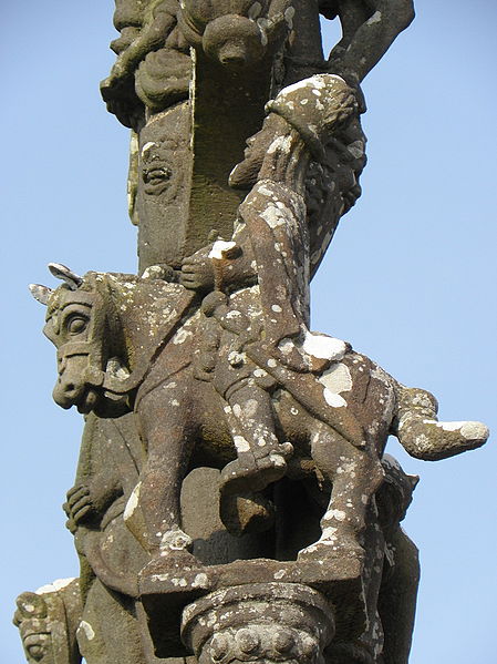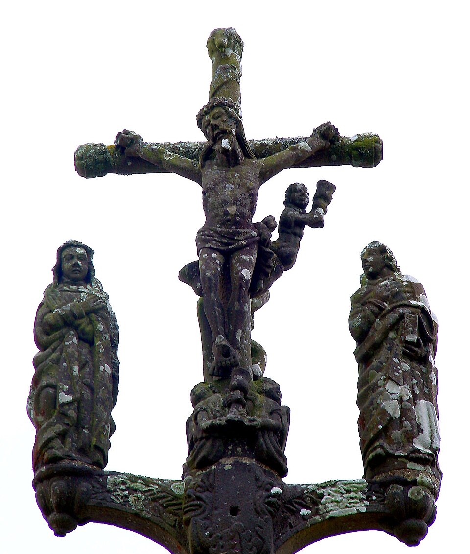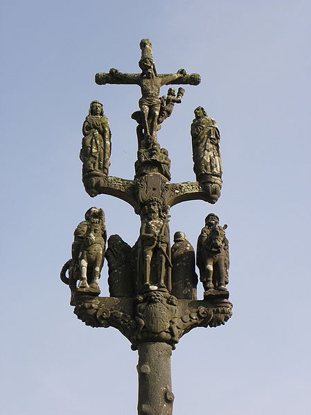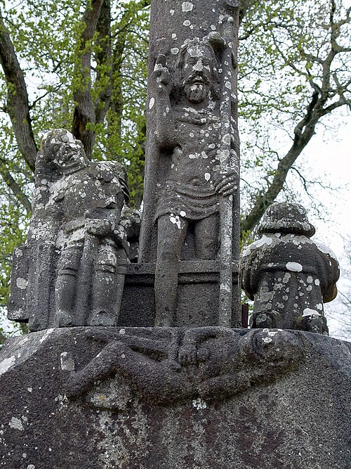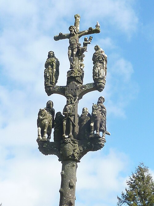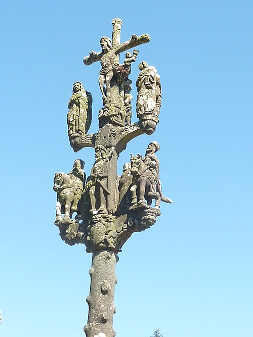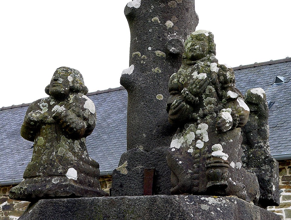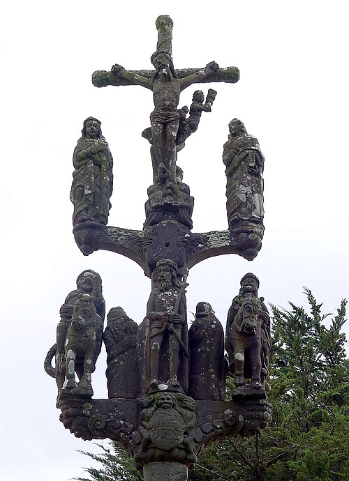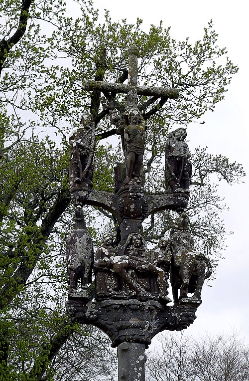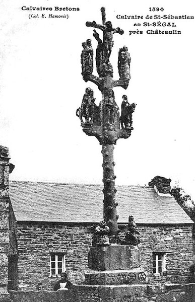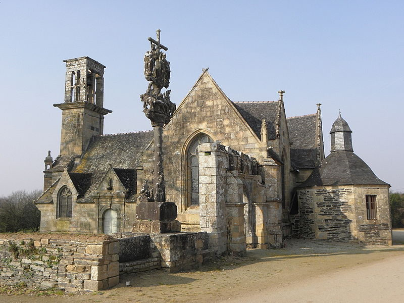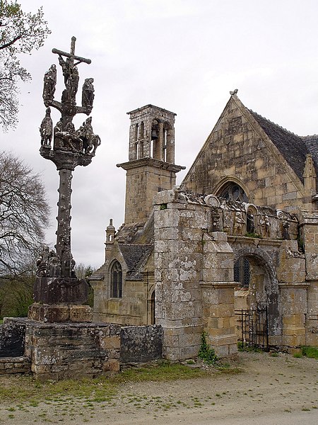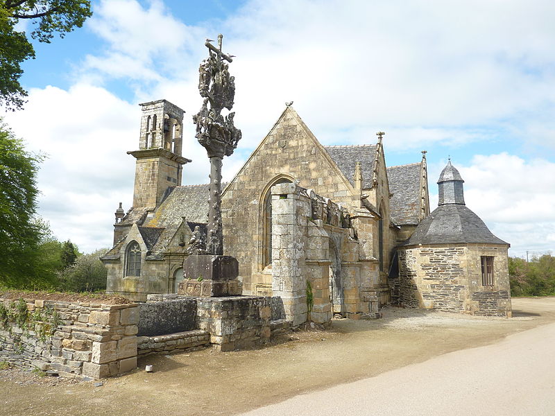 La chapelle Saint-Sébastien, érigée au XVe siècle pour conjurer la peste, occupe le centre d'un enclos dépourvu des équipements paroissiaux habituels : pas d'ossuaire, ni de cimetière, ni de fonts baptismaux. De plan en croix latine, elle a conservé la nef, le chœur à chevet plat et le bras sud du transept de l'édifice primitif ; le bras nord et le bas-côté nord ont été reconstruits au XVIe siècle, le bas-côté sud et le clocher-mur datent du XVIIe siècle, et la sacristie octogonale a été ajoutée au XVIIIe siècle. La sobriété de l'architecture contraste avec la richesse de la décoration du chœur, dominée par une poutre de gloire sculptée. L'édifice est composite : transept, chœur, grandes arcades et calvaire remontent aux deuxième et troisième quarts du XVIe siècle ; la nef a été remaniée en 1685-1686, le clocher-porche élevé en 1694 et la sacristie datée de 1742 ; de nombreuses inscriptions y sont encore visibles.