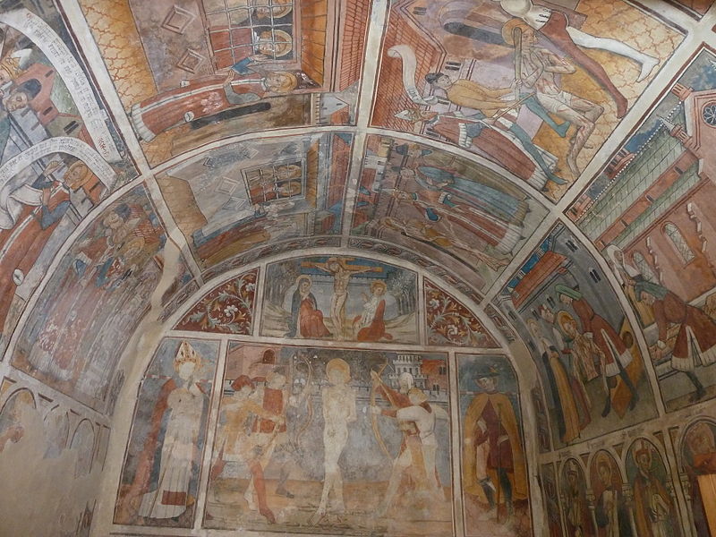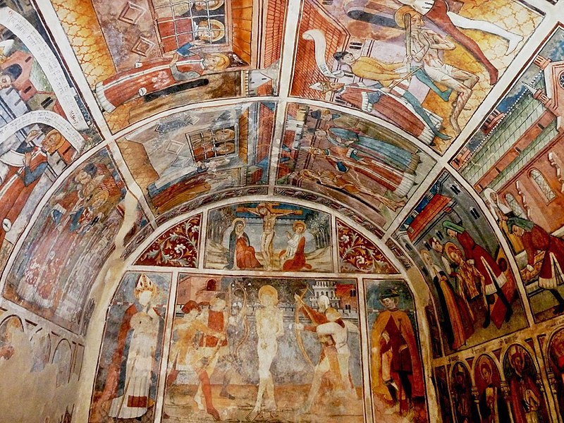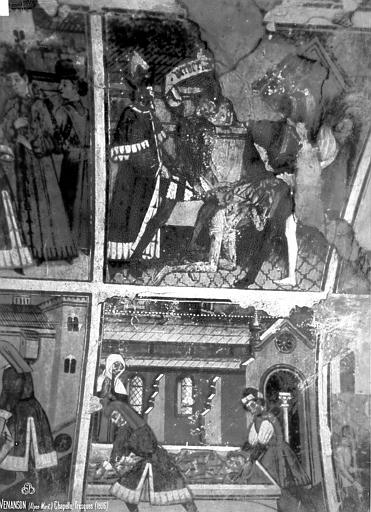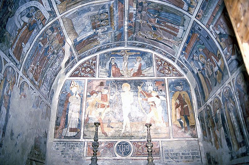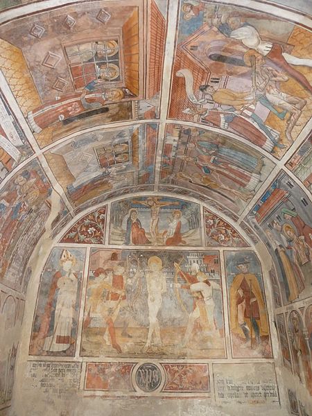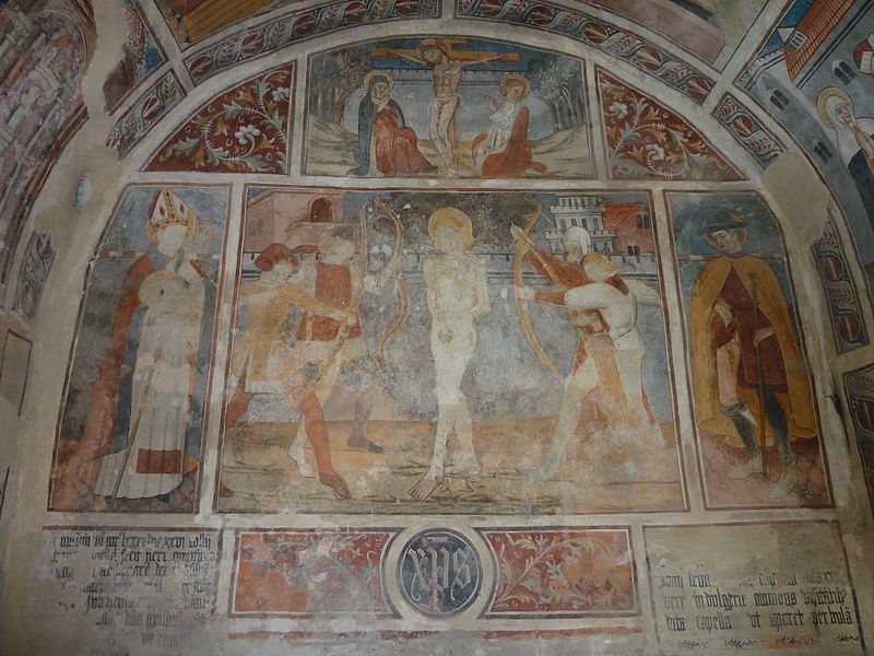 La chapelle Saint-Sébastien, dite Sainte-Claire, est située à l'entrée du village de Venanson, dans les Alpes-Maritimes. Elle appartient à une série de petites chapelles érigées aux abords des villages pour assurer la protection des habitants contre la peste. Fondée par la communauté villageoise en 1481, elle est classée au titre des monuments historiques depuis le 26 mai 2000. De plan rectangulaire avec chevet plat, voûte en berceau plein cintre et toiture à deux pans, la chapelle présente un intérêt majeur parmi les chapelles peintes de l’arrière-pays niçois. L’ensemble intérieur — murs du chevet, voûte et murs latéraux — est entièrement décoré de peintures murales à la détrempe attribuées à Jean (Giovanni) Baleison, que le peintre a datées du 26 juillet 1481. Ces fresques forment un cycle complet et comptent parmi les réalisations les plus abouties de l’art niçois. Elles constituent également un témoignage de la vie à la fin du XVe siècle, par les représentations architecturales, les vêtements et les objets du quotidien. Sur le mur de fond, le Christ en croix est figuré entre la Vierge et saint Jean, tandis qu’en dessous se trouve la scène du martyre de saint Sébastien, encadrée par saint Grat et saint Roch. Sous la voûte, douze scènes racontent le martyre de saint Sébastien à l’époque de Dioclétien. Sur le mur gauche, les registres supérieurs montrent des épisodes de la vie de Sébastien — son adoubement par Dioclétien, sa visite et sa bénédiction des frères Marc et Marcellin, et la supplique de leurs épouses — puis des scènes de son enseignement auprès de femmes agenouillées, avec notamment sainte Zoé, et son confrontation à Dioclétien qui lui ordonne d’abjurer et d’adorer les idoles. La partie inférieure du mur gauche représente des objets de la vie quotidienne, une frise des saints protecteurs (sainte Appoline, sainte Barbe, saint Blaise, saint Laurent) et une fresque, très effacée, des sept péchés capitaux. Sur le mur droit, les panneaux supérieurs montrent Sébastien rendant ses flèches à Dioclétien, son supplice par bâtonnement et le jet de son corps dans une fosse en présence de sainte Lucine ; les registres inférieurs décrivent le retrait du corps par sainte Lucine, son inhumation et une scène d’épidémie ou de miracle. La partie basse du mur droit réunit les saints protecteurs de la communauté — saint Nicolas, saint Bernard des Alpes, saint Maur, sainte Catherine, sainte Marguerite et sainte Claire — ainsi que la représentation de la Bonne et de la Mauvaise Prière et une frise des vertus (Humilité, Chasteté, Charité, Fraternité, Tempérance, Patience, Vigilance). La chapelle, par sa couverture picturale et la richesse de son iconographie, demeure un témoignage précieux de la dévotion et des préoccupations collectives de la fin du XVe siècle.