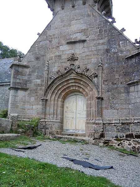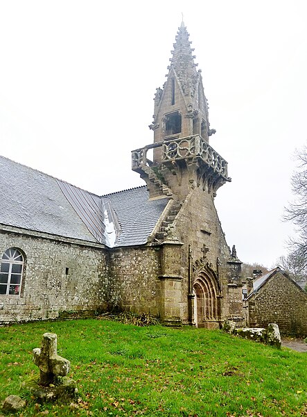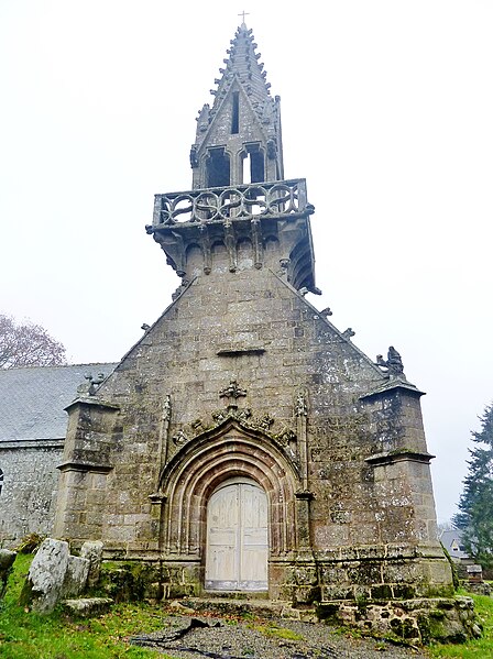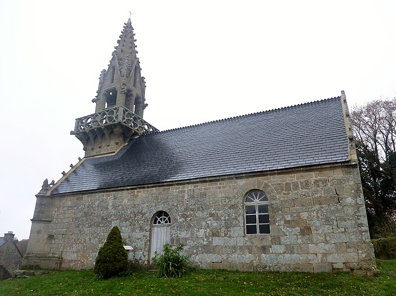 La chapelle Saint-Yves, située à Lignol (Morbihan), est une église catholique dont l'origine fait l'objet de légendes la rattachant aux Templiers ; elle paraît cependant avoir été édifiée par les Hospitaliers, qui tenaient à la fin du XVe siècle un hôpital à Saint-Yves dont il ne reste rien. L'édifice présente un plan en T résultant de la réunion de deux chapelles rectangulaires communicantes par une large arcature dans le mur nord : la chapelle primitive, dédiée à la Sainte-Trinité, remonte à la fin du XVe siècle, et une chapelle seigneuriale appartenant aux seigneurs du Coscro y fut accolée au XVIe siècle. Le bâtiment a connu des remaniements : certaines baies ont été refaites aux XVIIe ou XVIIIe siècles, les murs gouttereaux de la seconde chapelle ont été remaniés au XVIIe, et au XIXe siècle la chapelle a été rallongée et ses fenêtres refaites en plein cintre. Le pignon de la nef est surmonté d'un clocher ajouré, très ouvragé et de style gothique flamboyant, qui s'inspire de celui de Notre-Dame de Kernascléden ; de légers corbelets supportent son chemin de ronde, protégé par une fine balustrade de granit à jour, la chambre des cloches est ponctuée de piliers à têtes de dragon et couronnée d'une flèche de granite ornée de crochets. La façade comporte une grande porte ogivale flanquée de contreforts. L'intérieur conserve des sablières et des entraits sculptés représentant personnages fabuleux et animaux fantastiques. La statuaire, principalement datée du XVIe siècle, comprend des figures de saint Yves, de la Sainte-Trinité, un saint Méen en pierre, sainte Marguerite, une Vierge à l'Enfant, saint Diboen et un évêque anonyme. Des photographies montrent l'ensemble extérieur, le portail flamboyant, le pignon et l'intérieur, et des notices en ligne (Clochers de France, Observatoire du patrimoine religieux, Inventaire Bretagne, base Mérimée) figurent parmi les références documentaires.