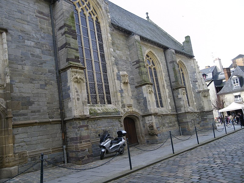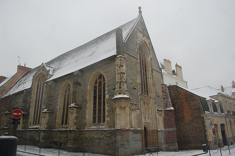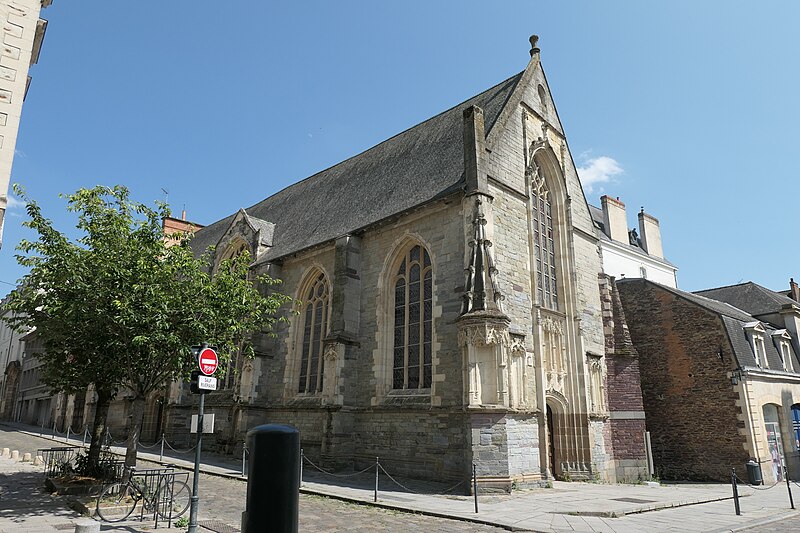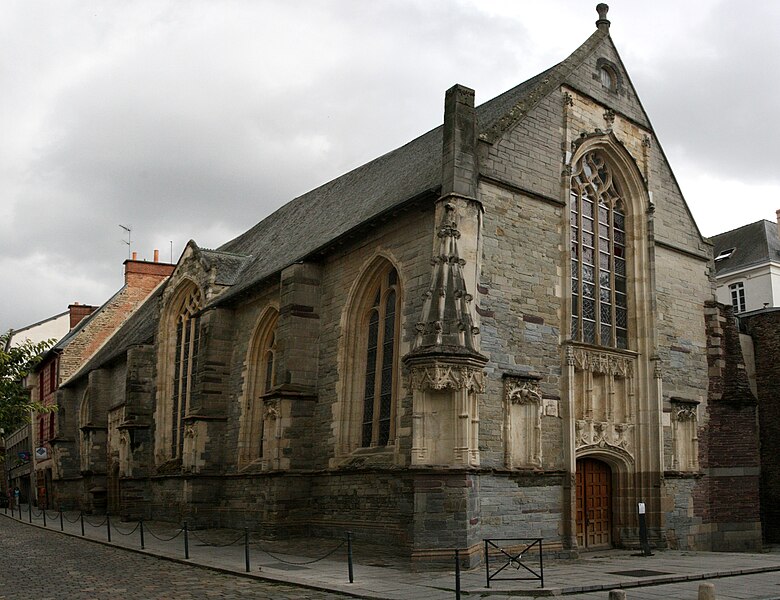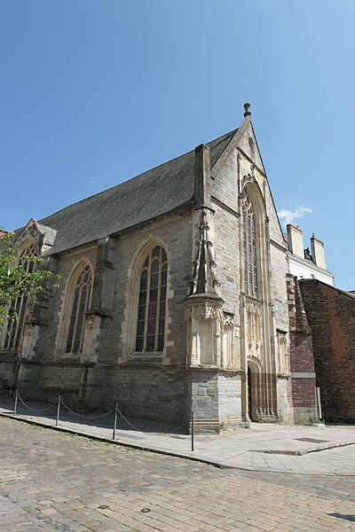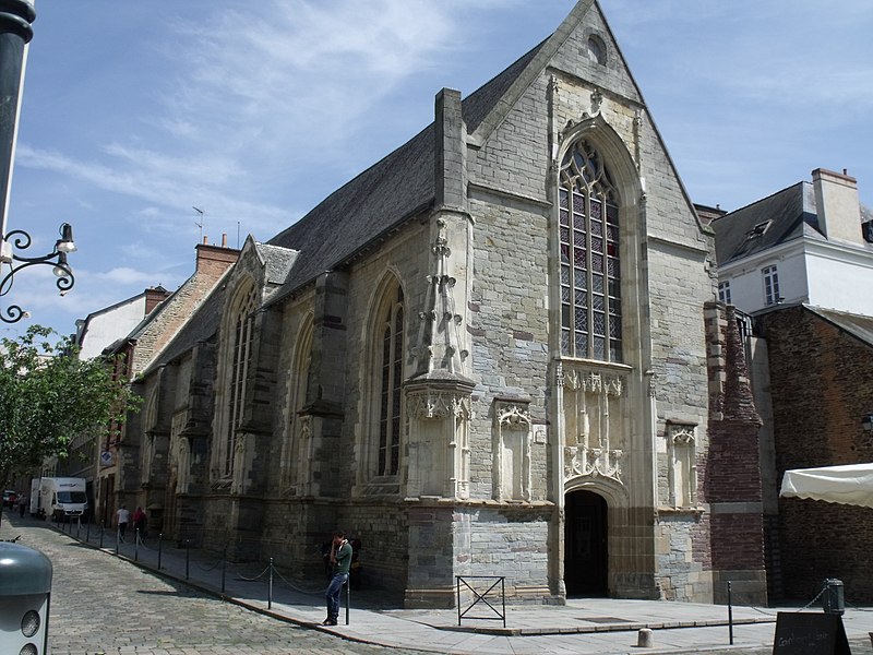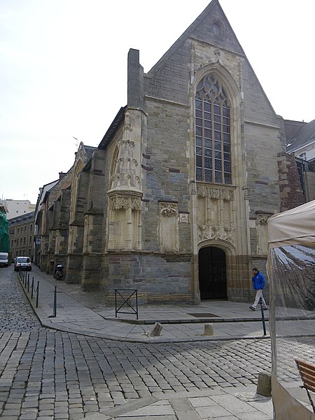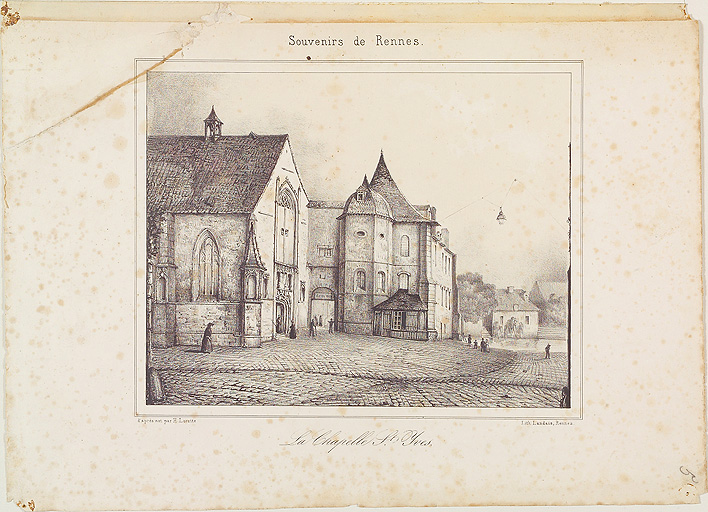 La chapelle Saint-Yves de Rennes conserve le souvenir du mariage d'Anne de Bretagne et de Charles VIII et constitue le dernier témoignage d'un vaste ensemble hospitalier établi au bord de la Vilaine. L'origine de l'hôpital remonte à 1358, lorsque le chanoine Eudon Le Bouteiller transforma son manoir en maison-Dieu dédiée à la Vierge. Situé dans la paroisse Saint-Étienne, l'établissement fut d'abord géré par deux chapelains choisis par le prieur de l'abbaye Saint-Melaine et par deux bourgeois, puis, à mesure des donations, par trois prévôts et un prêtre nommés par la Communauté de Ville et le Chapitre cathédral. Placé sous l'invocation de saint Yves, l'hôpital et sa chapelle furent reconstruits, la chapelle actuelle remplaçant un édifice du XIVe siècle et édifiée en 1494 selon le dossier de Véronique Orain. L'établissement connut plusieurs étapes d'évolution : il fut réuni à l'hôpital Sainte-Anne en 1557, comptait en 1583 quatre-vingt-deux lits répartis entre ancienne et nouvelle salle et chambres de femmes, fut agrandi en 1628 par de nouvelles salles à l'ouest de la cour et accueillait en 1630 deux cent vingt pauvres. En 1728, il servit également de grenier à blé et de caves à cidre pour les hôpitaux de Rennes. Les plans et vues successifs — une première représentation de 1616, un plan de 1685 le montrant adossé au rempart de la première enceinte, un plan détaillé de 1726 décrivant la cour accessible depuis la rue, un corps de bâtiment à l'ouest avec un passage enjambant une rampe vers la rivière, un cimetière et des jardins, puis un plan de 1877 signalant des destructions liées à la rectification des quais — restitue l'organisation du site. Les religieuses Augustines de la Miséricorde assurèrent le service des malades de 1644 à la Révolution, revinrent en 1804 et participèrent au déménagement de l'hôpital, activité qui cessa en 1896. L'hôpital fut transféré au nouvel Hôtel-Dieu au milieu du XIXe siècle, opération datée en source de 1858, et les bâtiments classiques furent progressivement détruits au fur et à mesure de l'aménagement du quai Duguay-Trouin. De 1754 à 1790, la chapelle abrita le Chapitre cathédral après l'interdiction de la cathédrale Saint-Pierre. Après le déménagement de l'Hôtel-Dieu, la chapelle fut transformée en quincaillerie. Elle a été classée au titre des monuments historiques le 10 mars 1945, rachetée par la ville en 1981, puis restaurée et aménagée pour accueillir l'office de tourisme de Rennes Métropole jusqu'en 2019 ; des vitraux créés par Gérard Lardeur y furent posés en 1997. En 2025, la ville a mis la chapelle en vente via un appel d'offres sans usages prédéterminés, ouverte aux projets compatibles avec la mise en valeur du lieu. Sur le plan architectural, l'édifice présente une nef rectangulaire voûtée dont le mur nord conserve des vestiges de l'appareil du XIVe siècle, des sablières gravées du XVe siècle et, à la façade sur la rue Le Bouteiller, une porte d'entrée à arc surbaissé surmontée de trois niches aujourd'hui vides. La façade sur la rue Saint-Yves comporte quatre fenêtres, dont une très grande, et une porte basse également surmontée de niches. L'inventaire de 1793 mentionne un retable de 1673 réalisé par François Gillet et un buffet d'orgue démoli le 9 novembre 1800. Enfin, l'ensemble des bâtiments entourant la chapelle a été transformé à l'occasion de l'installation de l'office de tourisme pour servir de bureaux et d'espace d'accueil, la nef accueillant un parcours éducatif sur l'histoire et l'architecture de Rennes.