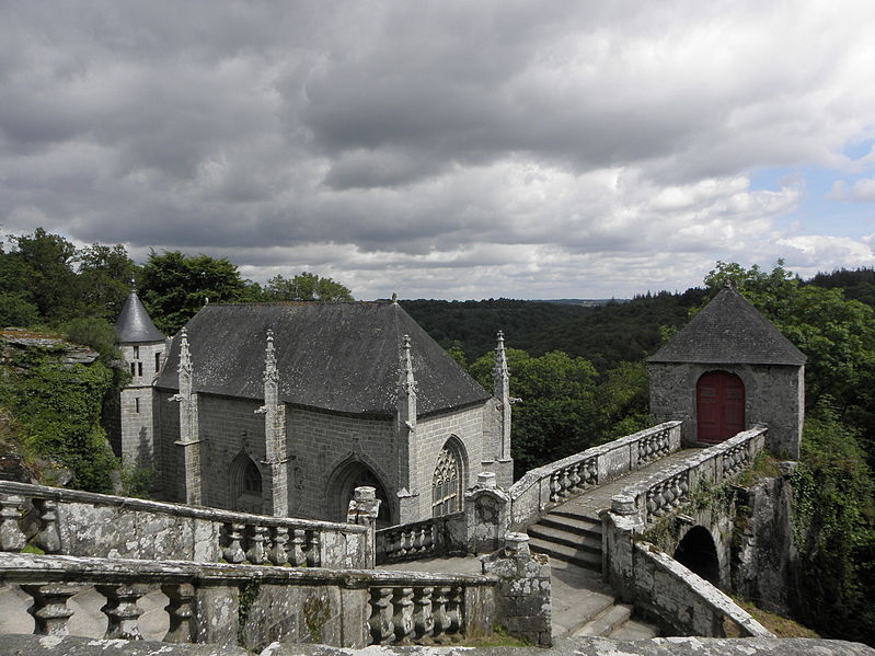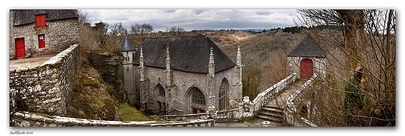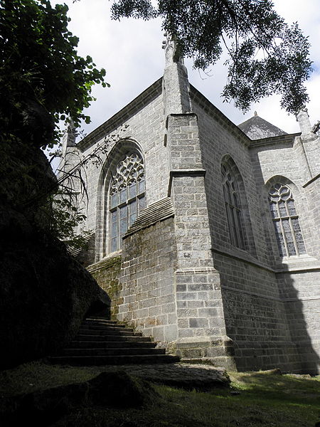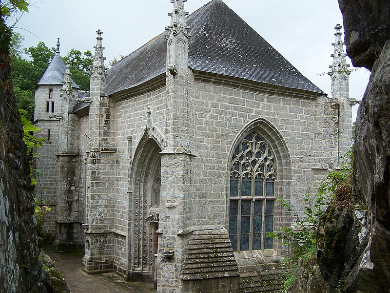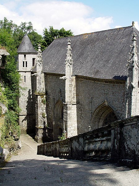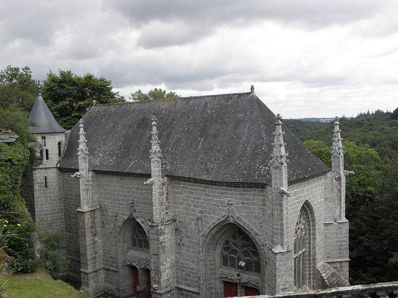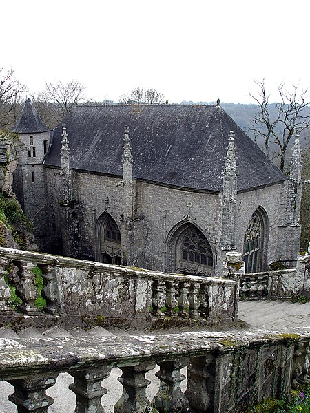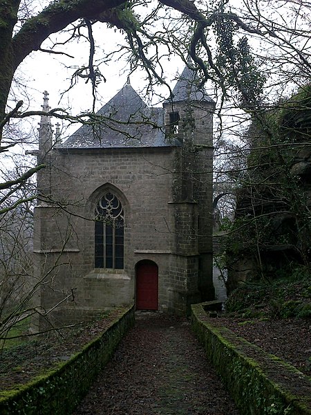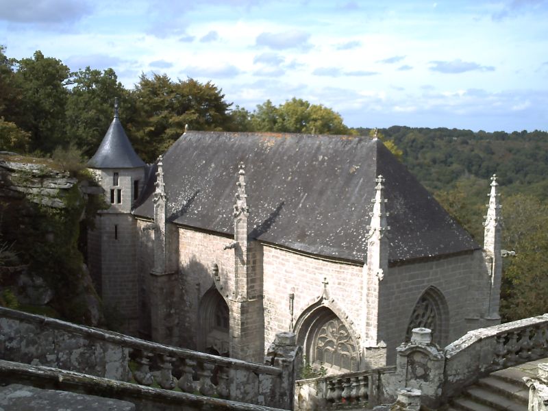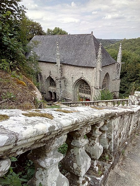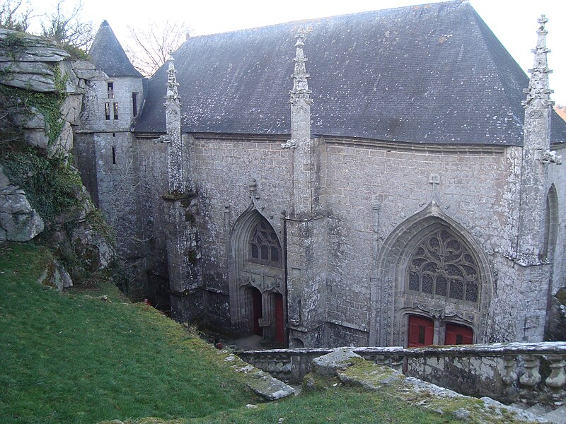 La chapelle Sainte-Barbe et la maison du garde se dressent sur la commune du Faouët (Morbihan), à 1,5 km au nord‑est du bourg, sur une plateforme à flanc de la falaise du Roc’h ar Marc’h Bran, en surplomb de la rivière Ellé. Le site, étape d’un des chemins bretons vers Saint‑Jacques‑de‑Compostelle, a été aménagé pour faciliter processions et pèlerinages, avec une vaste esplanade servant de placître et un monumental escalier. Selon la tradition, la chapelle résulte du vœu de Jean de Toulbodou, qui, ayant échappé à la chute d’un rocher, fit édifier un lieu de culte dédié à sainte Barbe ; la fondation est attestée par un acte daté du 6 juillet 1489. Une inscription gothique sur une console du mur du bras sud confirme le début des travaux le 6 juillet 1489, tandis qu’une clé de voûte du bras nord porte l’inscription indiquant l’achèvement de la voûte en 1512. La famille de Bouteville apparaît de façon omniprésente dans le décor et a joué un rôle déterminant dans la construction et le patronage de la chapelle. La chapelle a peu été modifiée depuis le XVIe siècle; la charpente a été entièrement refaite au XVIIIe siècle (inscription 1749 ; une mention signale aussi la date 1740) et le fronton de la porte du clocher porte la date 1743. L’église a été incendiée en 1917 ; le porche sud et la tour furent épargnés. L’ensemble du site a été mis en scène à la fin du XVIIe siècle et au début du XVIIIe siècle : un grand escalier monumental est daté de 1700 et attribué par inscription à Mathurin Le Meur, attribution que d’autres sources associent à Sébastien Le Meur. Un ossuaire supposé, probablement plutôt une boutique liée au pèlerinage, fut aménagé au bas des escaliers ; une fontaine votive en contrebas date de 1708. La chapelle est inscrite au titre des monuments historiques depuis 1906 et la maison du garde fait l’objet d’une inscription distincte depuis 1928. L’accès s’effectue par un escalier à quatre volées en plan cruciforme, orné de balustres de style Louis XIII ; une passerelle et une arcade desservent l’oratoire Saint‑Michel, installé sur un éperon rocheux. Le bâtiment, de style gothique flamboyant, se réduit à une travée unique et à une abside à trois pans ; en raison de la topographie, il n’est pas orienté selon l’axe Ouest‑Est mais selon un axe Sud‑Est/Nord‑Ouest, avec entrée principale au sud‑ouest. Les voûtes d’ogives, en pierre, sont épaulées par des contreforts surmontés de pinacles et de gargouilles ; la chapelle est voûtée en pierre alors que les petites chapelles de la même époque étaient souvent couvertes en bois. L’abside, close par une grille de communion en fer forgé du XVIIIe siècle, abrite sous l’autel le gisant de sainte Barbe. La façade du clocher, réduite à une tourelle, présente des meurtrières et une niche supérieure où se trouve une statue moderne de la sainte ; la porte du clocher porte un fronton daté 1743 et la façade occidentale présente deux portails composés de portes jumelées surmontées de tympans ajourés. Quatre verrières du premier quart du XVIe siècle racontent des épisodes de la vie et de la mort de sainte Barbe, dont une scène entourée de foudre, ainsi que la Transfiguration, l’Ascension et la Pentecôte. L’ornementation interne et les vitraux portent de nombreux blasons rappelant l’implication de la noblesse locale : Bouteville, Toulbodou et des familles alliées sont représentées dans la sculpture, la peinture et les vitraux. La chapelle conserve également de nombreuses statues en bois sculpté, des ex‑voto maritimes, une tribune seigneuriale et un retable en bois. Près de la chapelle, la maison de garde du XVIIe siècle, à étage carré et tour d’escalier circulaire, fut anciennement un pavillon de chasse et a abrité des gardiens depuis 1910 ; à proximité se trouve le campanile qui protège la cloche des pèlerins, fondue à Nantes en 1808 par le fondeur Chatel (inscription) ; la cloche de 440 kg, fendue, a été restaurée en 2009. Un enclos près du campanile abrite le tombeau de Claude René Bellanger (1768‑1845), entouré d’une grille et surmonté d’une dalle d’ardoise. La fontaine Sainte‑Barbe, accessible à environ 400 mètres en contrebas le long d’un chemin forestier, est un bassin daté de 1708 abritant une statue mutilée de la sainte et entouré d’un enclos à bancs ; la tradition lui attribue des vertus protectrices contre la foudre et des usages oraculaires pour le mariage. Le plateau qui domine la chapelle accueille au printemps des asphodèles d’Arrondeau, espèce rare et protégée en Bretagne. La chapelle reste le lieu d’un pardon célébré le dernier dimanche de juin et le 4 décembre, jour de sainte Barbe, mais la fréquentation a décliné, menaçant la pérennité de certaines manifestations autrefois très suivies. L’ensemble du site, sa topographie et son mobilier ont inspiré de nombreux artistes et font l’objet de recherches et de restaurations successives depuis le XIXe siècle.