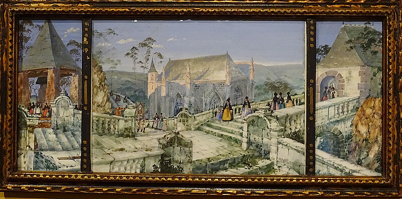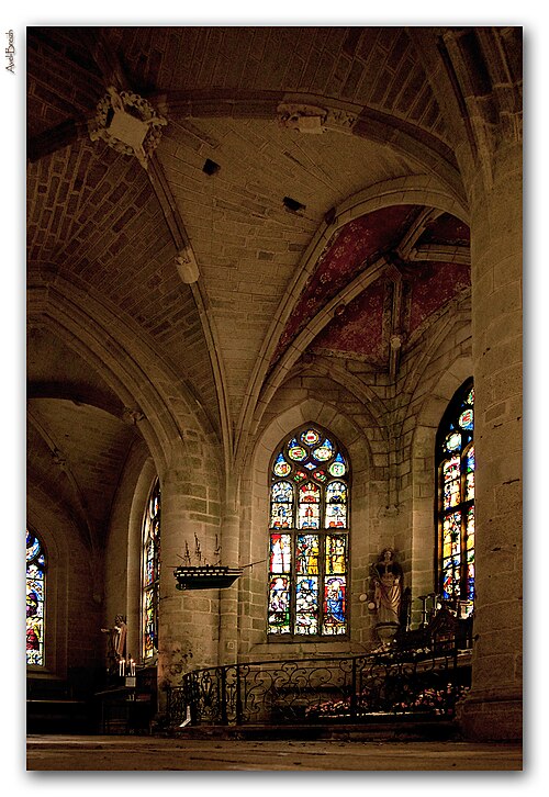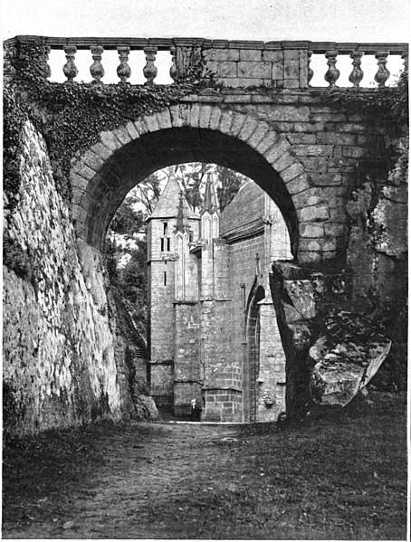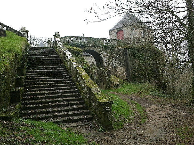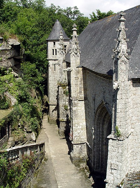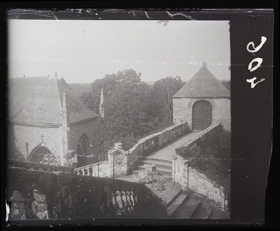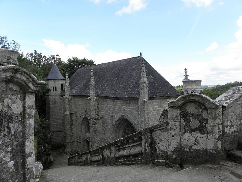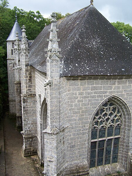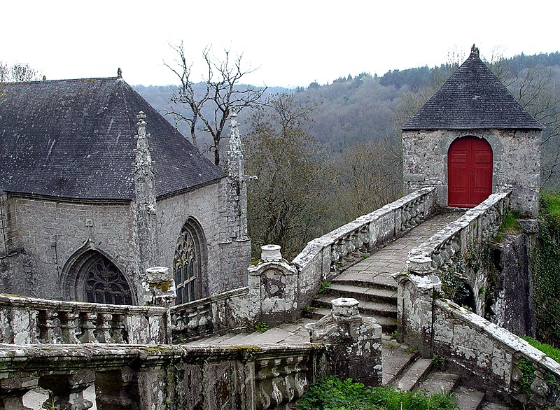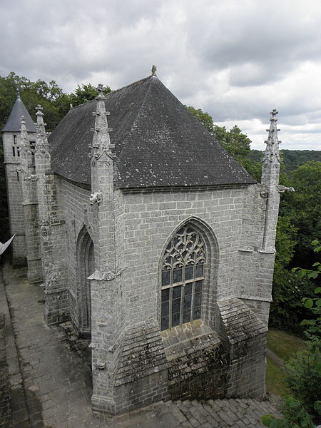 La chapelle Sainte-Barbe et la maison du garde se dressent sur la commune du Faouët (Morbihan), à 1,5 km au nord‑est du bourg, sur une plateforme à flanc de la falaise du Roc’h ar Marc’h Bran, en surplomb de la rivière Ellé. Le site, étape d’un des chemins bretons vers Saint‑Jacques‑de‑Compostelle, a été aménagé pour faciliter processions et pèlerinages, avec une vaste esplanade servant de placître et un monumental escalier. Selon la tradition, la chapelle résulte du vœu de Jean de Toulbodou, qui, ayant échappé à la chute d’un rocher, fit édifier un lieu de culte dédié à sainte Barbe ; la fondation est attestée par un acte daté du 6 juillet 1489. Une inscription gothique sur une console du mur du bras sud confirme le début des travaux le 6 juillet 1489, tandis qu’une clé de voûte du bras nord porte l’inscription indiquant l’achèvement de la voûte en 1512. La famille de Bouteville apparaît de façon omniprésente dans le décor et a joué un rôle déterminant dans la construction et le patronage de la chapelle. La chapelle a peu été modifiée depuis le XVIe siècle; la charpente a été entièrement refaite au XVIIIe siècle (inscription 1749 ; une mention signale aussi la date 1740) et le fronton de la porte du clocher porte la date 1743. L’église a été incendiée en 1917 ; le porche sud et la tour furent épargnés. L’ensemble du site a été mis en scène à la fin du XVIIe siècle et au début du XVIIIe siècle : un grand escalier monumental est daté de 1700 et attribué par inscription à Mathurin Le Meur, attribution que d’autres sources associent à Sébastien Le Meur. Un ossuaire supposé, probablement plutôt une boutique liée au pèlerinage, fut aménagé au bas des escaliers ; une fontaine votive en contrebas date de 1708. La chapelle est inscrite au titre des monuments historiques depuis 1906 et la maison du garde fait l’objet d’une inscription distincte depuis 1928. L’accès s’effectue par un escalier à quatre volées en plan cruciforme, orné de balustres de style Louis XIII ; une passerelle et une arcade desservent l’oratoire Saint‑Michel, installé sur un éperon rocheux. Le bâtiment, de style gothique flamboyant, se réduit à une travée unique et à une abside à trois pans ; en raison de la topographie, il n’est pas orienté selon l’axe Ouest‑Est mais selon un axe Sud‑Est/Nord‑Ouest, avec entrée principale au sud‑ouest. Les voûtes d’ogives, en pierre, sont épaulées par des contreforts surmontés de pinacles et de gargouilles ; la chapelle est voûtée en pierre alors que les petites chapelles de la même époque étaient souvent couvertes en bois. L’abside, close par une grille de communion en fer forgé du XVIIIe siècle, abrite sous l’autel le gisant de sainte Barbe. La façade du clocher, réduite à une tourelle, présente des meurtrières et une niche supérieure où se trouve une statue moderne de la sainte ; la porte du clocher porte un fronton daté 1743 et la façade occidentale présente deux portails composés de portes jumelées surmontées de tympans ajourés. Quatre verrières du premier quart du XVIe siècle racontent des épisodes de la vie et de la mort de sainte Barbe, dont une scène entourée de foudre, ainsi que la Transfiguration, l’Ascension et la Pentecôte. L’ornementation interne et les vitraux portent de nombreux blasons rappelant l’implication de la noblesse locale : Bouteville, Toulbodou et des familles alliées sont représentées dans la sculpture, la peinture et les vitraux. La chapelle conserve également de nombreuses statues en bois sculpté, des ex‑voto maritimes, une tribune seigneuriale et un retable en bois. Près de la chapelle, la maison de garde du XVIIe siècle, à étage carré et tour d’escalier circulaire, fut anciennement un pavillon de chasse et a abrité des gardiens depuis 1910 ; à proximité se trouve le campanile qui protège la cloche des pèlerins, fondue à Nantes en 1808 par le fondeur Chatel (inscription) ; la cloche de 440 kg, fendue, a été restaurée en 2009. Un enclos près du campanile abrite le tombeau de Claude René Bellanger (1768‑1845), entouré d’une grille et surmonté d’une dalle d’ardoise. La fontaine Sainte‑Barbe, accessible à environ 400 mètres en contrebas le long d’un chemin forestier, est un bassin daté de 1708 abritant une statue mutilée de la sainte et entouré d’un enclos à bancs ; la tradition lui attribue des vertus protectrices contre la foudre et des usages oraculaires pour le mariage. Le plateau qui domine la chapelle accueille au printemps des asphodèles d’Arrondeau, espèce rare et protégée en Bretagne. La chapelle reste le lieu d’un pardon célébré le dernier dimanche de juin et le 4 décembre, jour de sainte Barbe, mais la fréquentation a décliné, menaçant la pérennité de certaines manifestations autrefois très suivies. L’ensemble du site, sa topographie et son mobilier ont inspiré de nombreux artistes et font l’objet de recherches et de restaurations successives depuis le XIXe siècle.