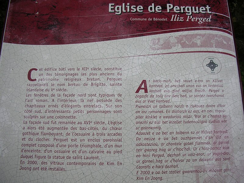 La chapelle Sainte-Brigitte de Perguet se trouve rue de Kernitron à Bénodet (Finistère, Bretagne). Côté nord, elle conserve l'aspect roman de la nef, daté de la fin du XIIe siècle. Le côté sud a été transformé au XVIe siècle par l'adjonction d'un transept, d'un ossuaire et d'un porche. Le campanile porte une date inscrite — le texte mentionne successivement 1595 et 1395 — ainsi que les inscriptions « Jan Christien » (prieur de Daoulas) et « curé Caradec » (le curé de l'époque). La chapelle, ainsi que le mur de clôture et ses entrées, est inscrite au titre des monuments historiques. Une étude détaillée a été publiée par Pierre Lescot dans la revue locale Foën Izella n°59 (novembre 2021).