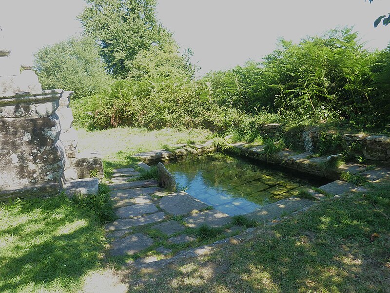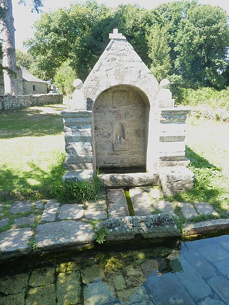 La visite commence par la pierre de direction située à environ 200 mètres à l’ouest, en bordure de la route, qui porte plusieurs inscriptions et la mention « Chemin du ciel et de 1763 ». L’enclos s’ouvre près de la route au nord‑ouest ; en contournant la chapelle on remarque que le vitrail oriental est obstrué par une maçonnerie. La fontaine Sainte‑Catherine montre un fond de bassin où des dalles de granit et de schiste se côtoient ; elle renferme une niche avec une petite statue de la sainte et des marques gravées : 16 et 61 séparés par un écu en bas, 1861 en haut et 1824 à droite. Le mur de l’enclos est interrompu sept fois par des passages obstrués par des plaques verticales ; l’un d’eux, au sud, est accessible par un escalier de sept marches que certains auteurs mettent en relation avec l’ouvrage de Raymond Lulle.