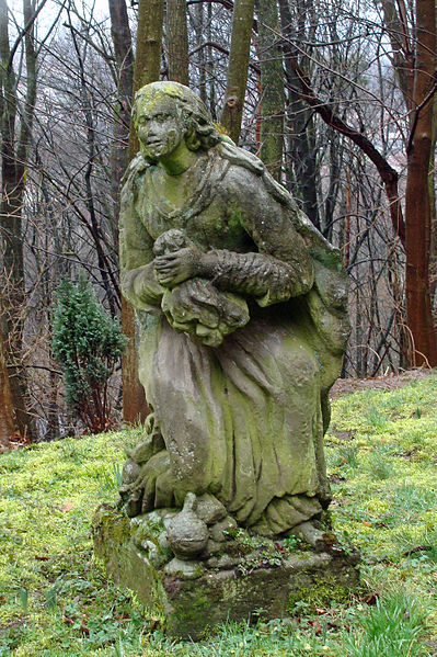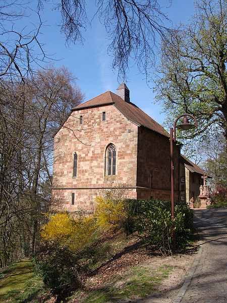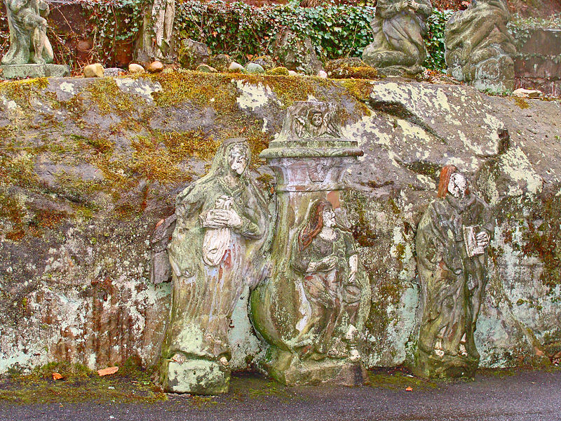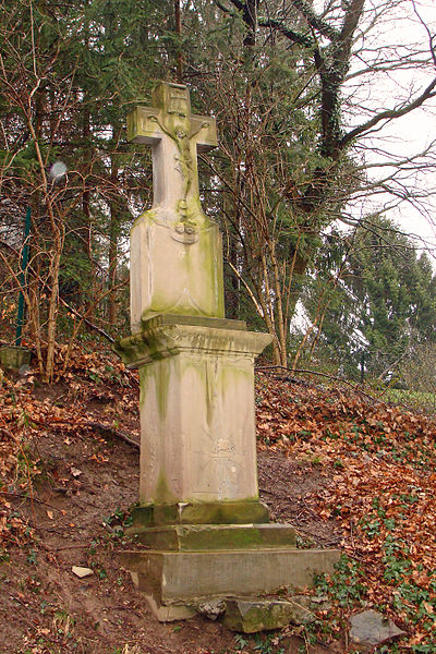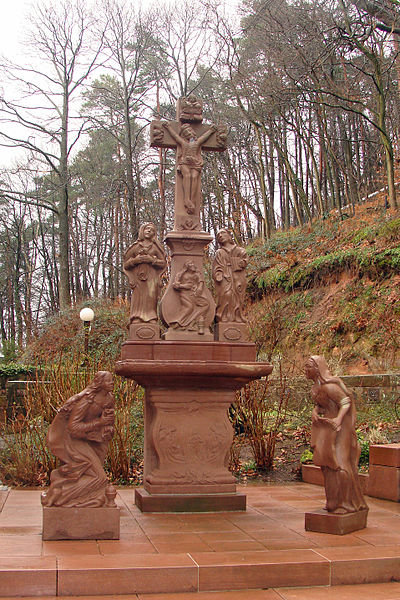 Autour de la chapelle se dressent plusieurs groupes sculptés relevant de différentes époques, parmi lesquels un calvaire taillé dans le rocher, un calvaire d'entrée, une croix de chemin et une sculpture de Marie-Madeleine. La tradition rapporte qu'Alice de Werd, dite Alice de Forbach, fille de Theodorich von Werd, provoqua une rivalité qui conduisit les seigneurs de Siersburg et de Felsberg à un duel ; prise de remords et découvrant qu'elle aimait le seigneur de Siersburg, elle se retira et fit élever un oratoire sur le mont Sainte-Croix, où elle fut enterrée au pied de l'autel ; sa tombe fit l'objet d'une vénération populaire, bien qu'elle n'ait jamais été canonisée.