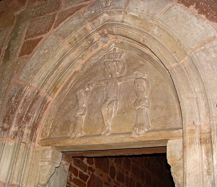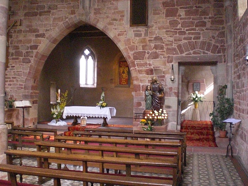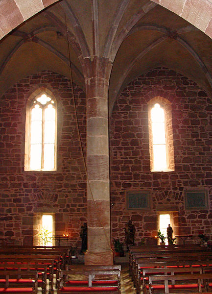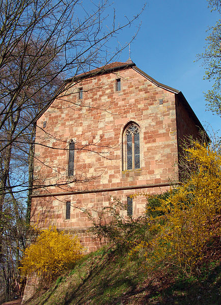 Architecturalement, la chapelle est une chapelle-halle : la nef carrée est construite en grès taillé, avec des marques d'outillage et des joints au mortier, tandis que le chœur présente une construction plus irrégulière et comporte des fenêtres gothiques dont l'une est partiellement murée. Le décalage des axes entre nef et chœur montre qu'il y eut primitivement deux bâtiments distincts : la future nef était une maison d'habitation massive et le chœur formait un corps fermé ; la nef est antérieure au chœur, ce dernier datant de la seconde moitié du XIIIe siècle. L'origine exacte de l'édifice reste obscure : il peut s'agir d'une ancienne maison forte ou d'une dépendance du château. Sous l'autel, une tombe à niche céphalique creusée dans le roc, destinée à une femme de grande taille mais frêle, a été découverte le 24 novembre 1978 et restaurée. À l'intérieur, un tympan sculpté du XIIIe siècle représente le Christ en croix.