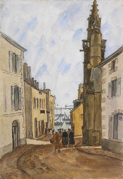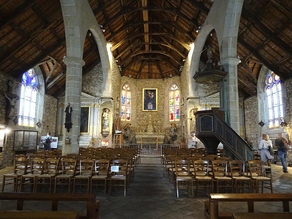 La chapelle Sainte-Hélène, située rue Anatole-France à Douarnenez (Finistère, Bretagne), est un édifice daté du début du XVIe siècle. Son clocher, de type cornouaillais, présente des gâbles à meneaux en Y qui situent sa construction vers 1520-1540. La sacristie porte la date de 1704 et le porche ouest est daté de 1755, tandis que la galerie, la balustrade et la tourelle d'escalier sont des ajouts du XVIIIe siècle. Un bas-relief en haut à gauche de la façade, probablement du XVIe siècle, représente un fou de Bassan plongeant vers un banc de sardines et trois pêcheurs dans une embarcation, témoignage de l'importance ancienne des pêches sardinières en Bretagne. L'intérieur de la sacristie comporte l'inscription « MIRE G PAILLART DOCTR ETR ». La protection au titre des monuments historiques a connu un arrêté d'inscription du clocher le 3 juin 1932, annulé par la suite, et la chapelle a été inscrite le 10 avril 2012. Les documents iconographiques rassemblent plusieurs vues extérieures — dont une de 1929 — une vue intérieure d'ensemble, une photographie de la statue de sainte Hélène et une œuvre de Robert Louis Antral intitulée La rue Monte-au-Ciel. Des informations complémentaires sont disponibles via des bases et portails spécialisés tels que Clochers de France, l'Observatoire du patrimoine religieux, l'Inventaire Bretagne et la base Mérimée. Voir aussi les notices relatives à Douarnenez, aux chapelles du Finistère et aux monuments historiques inscrits en 2012.