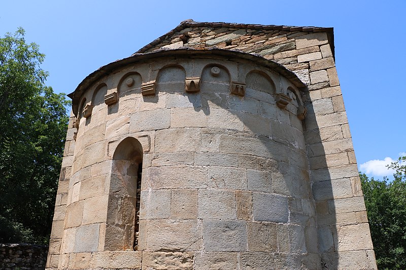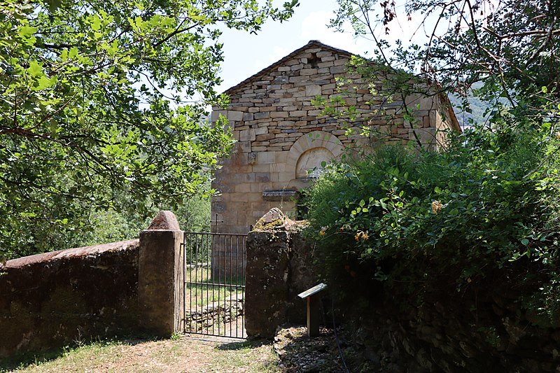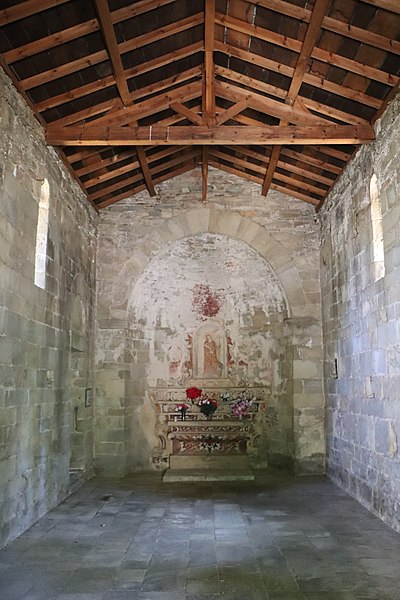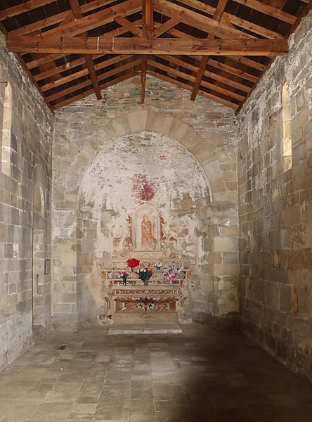 La nef unique, de plan rectangulaire, s'ouvre sur une abside semi-circulaire voûtée en cul-de-four. Sur la voûte et le mur de l'abside subsistent des peintures murales représentant le Père éternel en majesté, ainsi que les évangélistes et les apôtres. L'édifice n'est pas antérieur au XVIIe siècle ; la porte en est un exemple classique du pays.