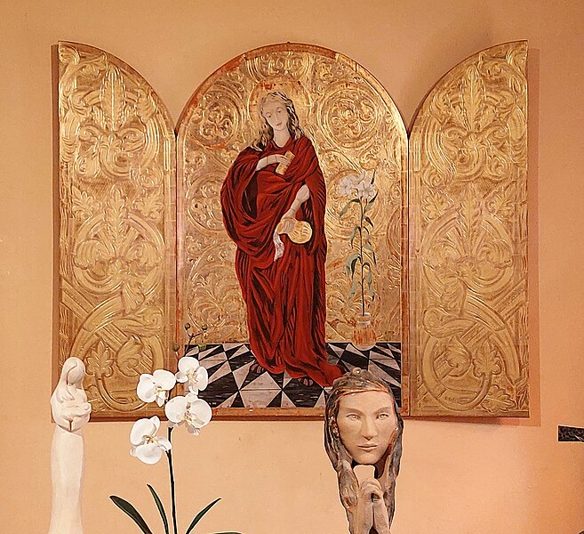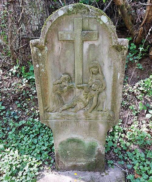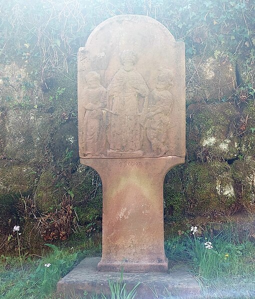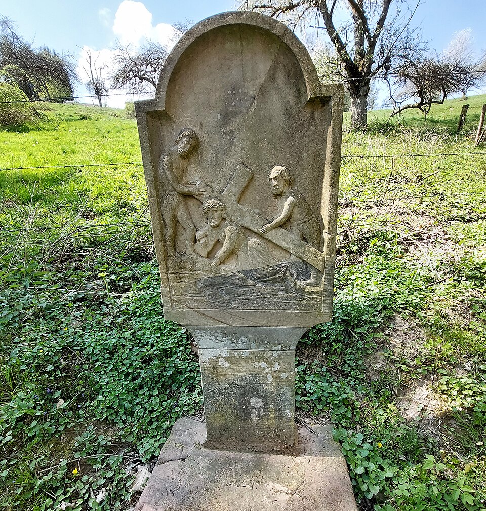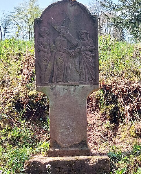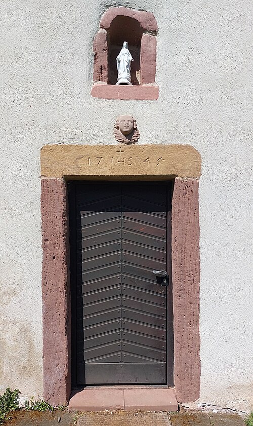 La statuaire comprend une copie récente en marbre de Carrare de la figure du retable volé en 1974, réalisée d'après une carte postale ancienne. À proximité, une grotte de Lourdes a été édifiée en blocs de grès de la forêt de Saint‑Louis‑lès‑Bitche par des habitants en 1958 pour le centenaire des apparitions ; un autel extérieur sert aux cérémonies du 1er mai et une croix commémore un vœu formulé lors des combats de la Libération en décembre 1944. Le calvaire, typique du Pays de Bitche et peut‑être surchargé d'une inscription de 1827, porte les effigies de saints protecteurs ruraux : sainte Vérène en habits de paysanne du XIXe siècle, saint Marc avec le lion et la palme, et saint Wendelin avec le chien et la houlette.