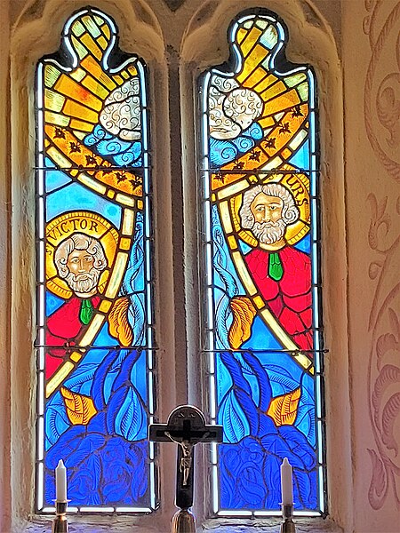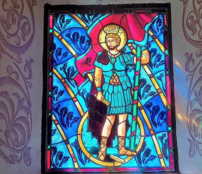 Les vitraux figuratifs anciens disparus vers 1960 ont d'abord été remplacés par des losanges multicolores, puis, plus récemment, par des vitraux figuratifs de l'artiste Sauveur Pascual. Les vitraux du pignon représentent sainte Vérène, vêtue d'un manteau rouge et tenant la cruche et le peigne, et saint Maurice, légionnaire de la Légion thébaine, identifié par l'étendard rouge et l'épée brisée. Le vitrail de la fenêtre gothique montre saint Victor et saint Ours, compagnons de la Légion thébaine, entourant un calice contenant l'Agneau pascal, renvoyant à la symbolique de l'ancien retable.
