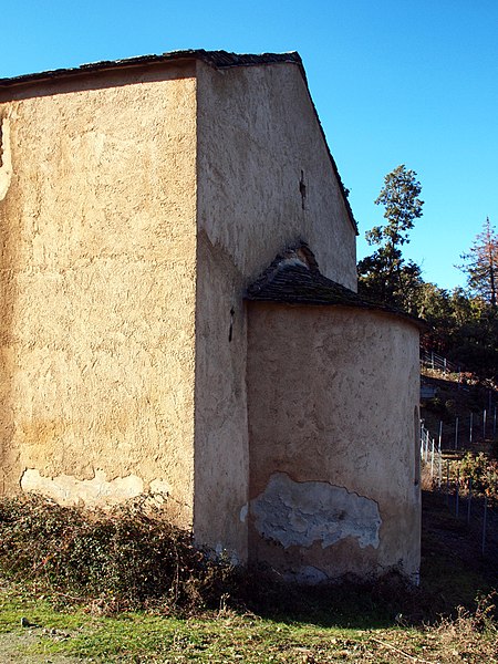 La chapelle présente une nef unique et une abside semi‑circulaire orientée au nord‑est. L'appareil, irrégulier, est constitué de petites pierres de schiste vert ; les angles sont renforcés par des dalles taillées. La porte latérale sud est surmontée d'un linteau décoré d'une croix en relief, cantonnée de deux arcs en plein cintre au profil en tore. Les murs et les frontons ont été surélevés et un clocheton ajouté à une époque tardive. L'intérieur a conservé un décor de fresques.