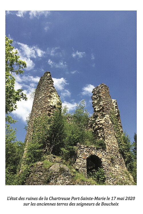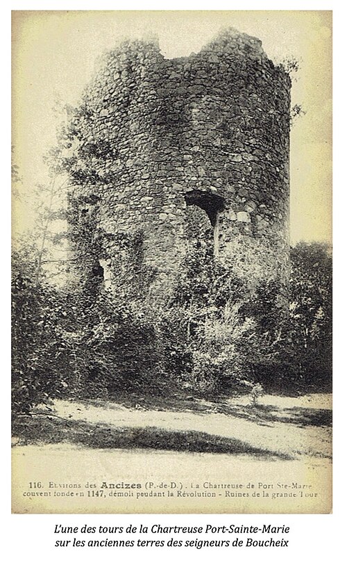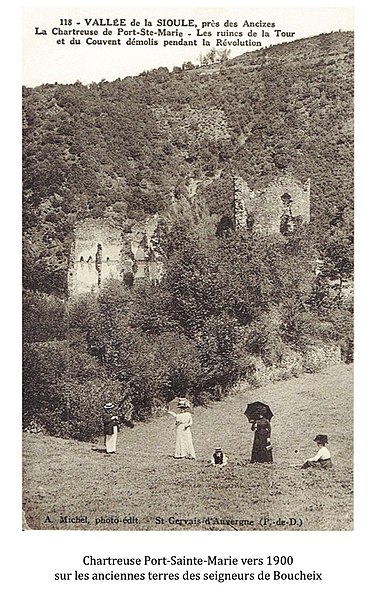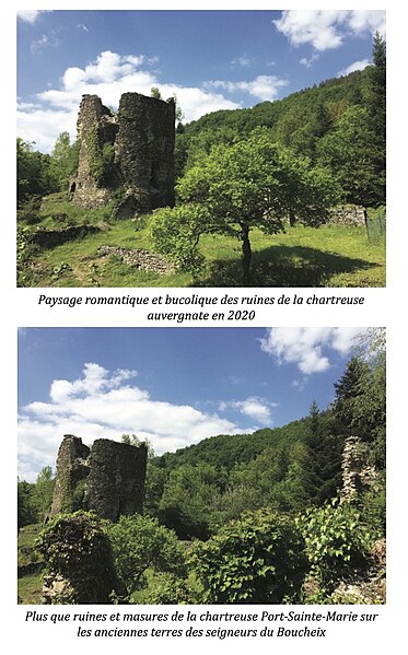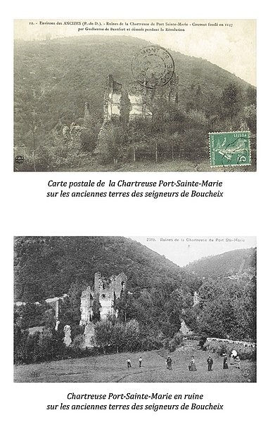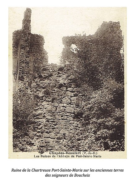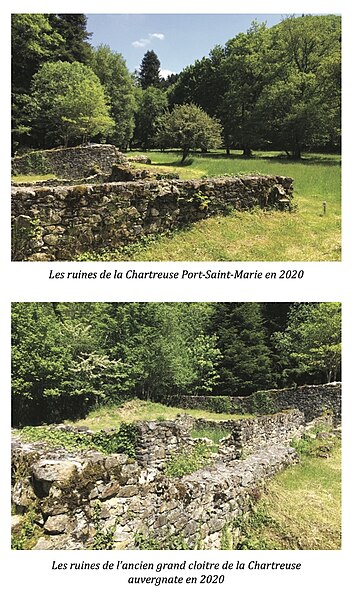 Édifiée au début du XIIIe siècle, la chartreuse du Port-Sainte-Marie est le seul établissement de l'ordre des Chartreux en Auvergne et conserve des vestiges intéressants malgré son état de ruine. Sa singularité tient notamment à l'originalité du plan, avec une double série de cellules, à la présence d'un cimetière de laïcs et à une tour fortifiée, ce qui en fait un jalon pour la compréhension de l'évolution de l'architecture cartusienne. Fondée en 1219 par les seigneurs de Boucheix, les barons Guillaume et Raoul de Beaufort, elle est située au fond de la vallée de la Sioule, sur la route entre Les Ancizes et Saint-Jacques-d'Ambur. La tradition rapporte que les deux fondateurs, frères, eurent une apparition de saint Bruno alors qu'ils chassaient au lieu-dit Confinéal, sur la commune actuelle de Chapdes-Beaufort. Le premier prieur connu, Petrus de Planis, ancien prieur de la chartreuse de Toulon, arrive en 1224. Le monastère eut une grande influence régionale et vit ses derniers travaux d'importance au XVIIe siècle. En 1729 le couvent comptait vingt moines prêtres, huit frères et trente domestiques. En 1789 l'avant-dernier prieur, Dom Gerle, fut député aux États généraux puis se défroqua et disparut dans les troubles parisiens. Les moines furent expulsés en 1791 et la chartreuse fut confisquée ; le dernier prieur, François Bertrand, né au Puy, fut arrêté pendant la Terreur et mourut en prison en 1797 à Saint-Maurice-du-Puy. Le domaine fut morcelé et vendu comme bien national, et les bâtiments tombèrent progressivement en ruine. Le riche mobilier monastique a été dispersé dans les églises dépendantes — on y relève notamment un autel à Pontgibaud et trois tableaux remarquables attribués à Parrocel et à Guy François — ainsi que chez des particuliers ; on y compte aussi des boiseries, une pietà et une statue de saint Bruno. L'horloge monumentale de la chartreuse fut acquise par la municipalité d'Aigueperse, qui fit construire de 1794 à 1798 un beffroi pour l'abriter devant l'ancien couvent des Ursulines, devenu ensuite l'hôtel de ville. Inscrit au titre des monuments historiques en 1996, le site fait l'objet de fouilles de l'Unité de recherche archéologique cartusienne et de travaux de sauvegarde menés par l'association des Amis de la chartreuse Port-Sainte-Marie. Conformément au plan ordinaire des chartreux, les bâtiments se répartissaient autour de trois pôles : un pôle religieux comprenant l'église, des chapelles rayonnantes, la chapelle de Pontgibaud, le petit cloître, le chapitre, le cimetière et le réfectoire ; un pôle érémitique constitué de dix-neuf cellules autour du grand cloître où vivaient les moines ; et un pôle économique, destiné aux frères convers, regroupant l'hôtellerie, les ateliers dits « obédiences », les granges et les étables, organisés autour d'une grosse tour ronde. La chartreuse s'étendait sur 17,128 hectares et son cloître, ouvert côté cour intérieure, était formé de quatre-vingt-seize arcades en pierre de Volvic. Selon la tradition cartusienne, Port-Sainte-Marie porte les armes de sa famille fondatrice, les Beaufort.