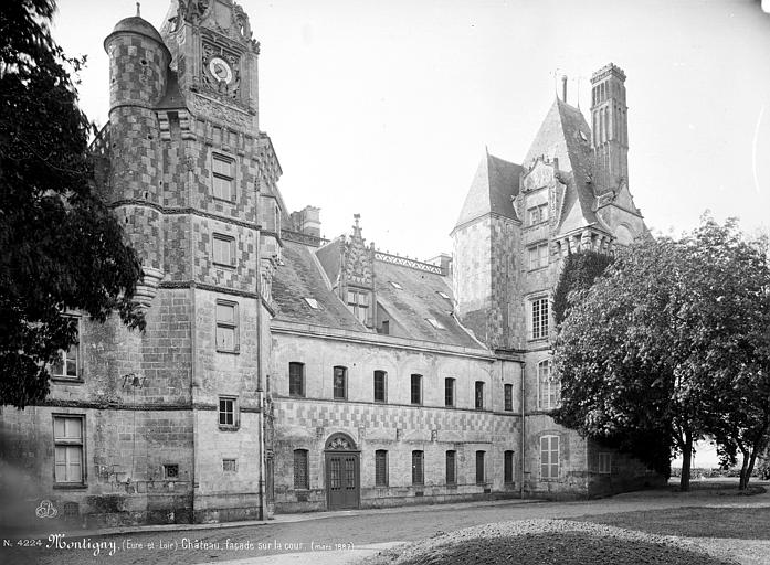 Château de Montigny-le-Gannelon, actuellement musée agricole, est situé à Montigny-le-Gannelon (Eure-et-Loir) et s'étend sur un parc de treize hectares ; son architecture de style Renaissance date de 1495 et le domaine est ouvert au public. Implanté en Beauce, entre Chartres et Tours sur la route du blé, il se trouve à 60 km d'Orléans et à 145 km de Paris ; la façade ouest donne sur une esplanade et le village, tandis que la façade est domine le Loir. Selon le dossier, le site aurait d'abord accueilli une forteresse à l'époque de Charlemagne, puis une seconde au Xe siècle, reconstruite au XIIe siècle ; dégradé au début du XVe siècle, l'édifice est démantelé avant d'être reconstruit vers 1495 par Jacques de Renty, qui laisse notamment la tour des Dames et la tour de l'Horloge. Au XVIIIe siècle, le domaine revient aux Montmorency-Laval ; Anne-Adrien-Pierre de Montmorency-Laval y réside et est présenté comme duc de Laval et de San Fernando Luis et comme ambassadeur de France sous Louis XVIII et Charles X. Le texte indique qu'il figura parmi les derniers défenseurs du Canada et qu'un livre conservé au château contient les douze discours d'inauguration de la ville de Lévis, inaugurée le 18 juin 1895. En 1834 est ajouté un pavillon attenant à la façade nord ; les armoiries de la famille Montmorency-Laval ornent la porte d'entrée selon la description fournie. Charlotte de Laval-Montmorency, née en 1798 et fille d'Anne-Adrien-Pierre, épouse en mai 1817 Athanase Gustave Charles Marie, marquis de Lévis-Mirepoix ; elle décède au château le 22 juin 1872 et la demeure reste dans leur descendance. La façade est, de style néo-gothique, est édifiée en 1879 par l'architecte Clément Parent, élève de Viollet-le-Duc, pour le comte et la comtesse Sigismond de Lévis. Un manège privé, construit à partir de 1893, appartient au type destiné au confort des chevaux plutôt qu'aux exhibitions équestres ; le projet de l'architecte Granger était plus ambitieux et prévoyait un parement de briques, un abreuvoir central et une extension au sud qui n'ont finalement pas été réalisés. Le manège présente un plan rectangulaire ; il est flanqué à l'est par des remises à voitures ouvrant sur la nef principale, au nord par des stalles, et au nord-ouest par une sellerie accolée à un corps d'entrée. Le domaine comprend un corps principal autour d'un cloître central bordé par deux tours ; le cloître, auparavant ouvert, a été clos lors des transformations du XIXe siècle, et ses fenêtres sont plus élancées au rez-de-chaussée qu'au premier étage. La tour des Dames, la plus ancienne, se situe au sud et date de 1495 ; la tour de l'Horloge est construite quelques années plus tard et présente, au-dessus de la porte d'entrée, les armoiries des maisons de Montmorency-Laval et de Lévis-Mirepoix. La tour de l'Horloge est ornée de trois guirlandes : deux figurent la vigne, évoquant l'activité viticole locale, et la troisième, différente, représente le veuvage, avec la scène d'une veuve au moment du décès telle que décrite dans le dossier. Sur la façade ouest, sept personnages sculptés en haut des colonnes du cloître représentent les péchés capitaux, avec des attributs identifiés pour chacun, et sur le mur de la tour des Dames une plaque commémorative rappelle le chevalier François Gaston de Lévis (1720-1787), maréchal de France et défenseur du Canada ; cette plaque a été apposée lors du jumelage entre Châteaudun et Trois-Rivières. L'escalier principal conserve un plafond de style Renaissance daté de 1495, dont les sculptures évoquent celles du château de Blois ; les murs affichent des portraits de maréchaux de France de la famille de Lévis, et des éléments symboliques tels que la coquille Saint-Jacques et le pélican rappellent respectivement le pèlerinage de Compostelle et la légende associée. Le château fait l'objet de protections au titre des monuments historiques (inscriptions en 1927 et 1993).