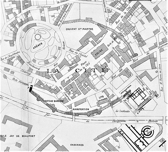Le château Barrière, situé à Périgueux rue de Turenne, s'élève à moins de deux cents mètres de l'amphithéâtre et de l'église Saint-Étienne-de-la-Cité. Ses bases reposent sur une portion de l'enceinte gallo-romaine édifiée à la fin du IIIe siècle. Le site rassemble des vestiges datés du XIe au XVIe siècle, avec une construction en grande partie attribuée au XIe siècle et des remaniements surtout des XVe et XVIe siècles. Fief de la famille Barrière au XIIIe siècle, il porte ce nom depuis cette époque. En 1575, il a été partiellement détruit par les huguenots. Propriété de la ville de Périgueux, le château en ruine est protégé au titre des monuments historiques depuis la liste de 1862. Les extérieurs sont accessibles au public. Architecturalement, les parties basses s'appuient sur la muraille gallo-romaine et ont été bâties à partir de matériaux antiques récupérés. Les parties hautes des tours et des courtines sont réalisées en petits moellons mêlés de briques, témoignage des remaniements tardifs. Du château subsistent des murs percés de fenêtres à meneaux et deux tours, à l'est et au sud; la tour orientale, tronquée, présente une porte ornée de décor flamboyant. À l'intérieur des ruines se remarquent des vestiges gallo-romains et les traces des différentes phases de construction. Le site, bien que fragmentaire, illustre la continuité d'occupation et les adaptations architecturales du rempart antique à la fortification médiévale et aux aménagements postérieurs.