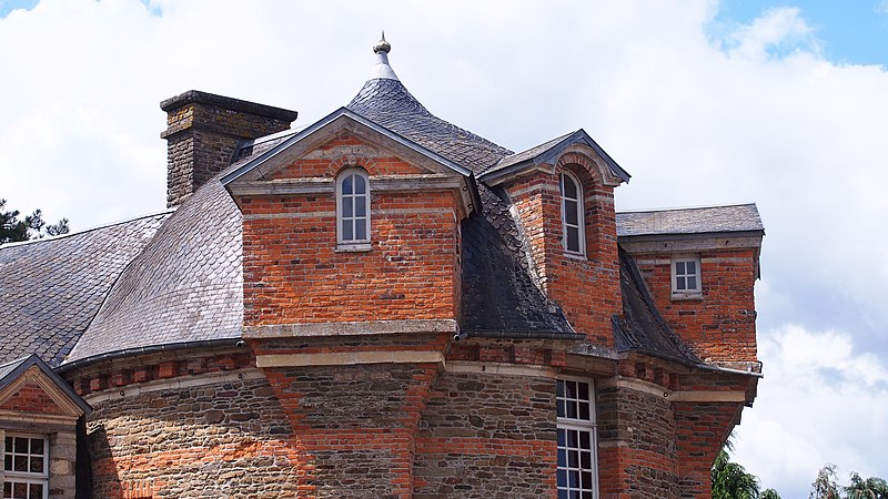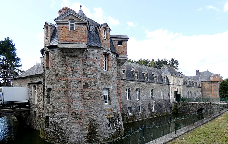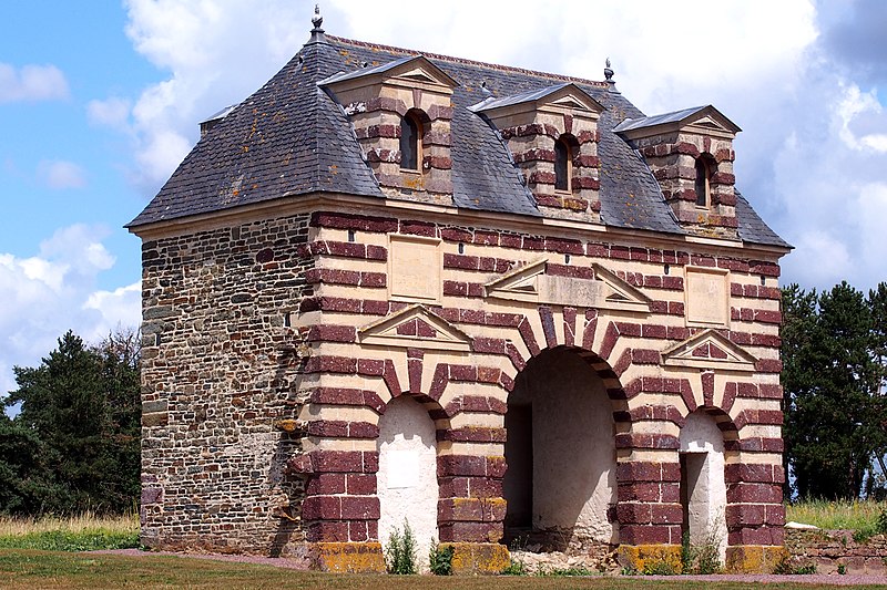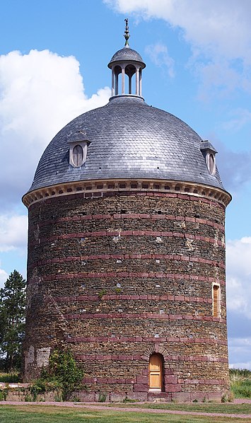 Le château de Dampierre, situé à 500 mètres au sud‑est du bourg de Dampierre (commune nouvelle de Val-de-Drôme, Calvados), est une demeure des XVIIe–XIXe siècles. Il forme, avec sa porterie et son colombier, un ensemble architectural du début du XVIIe siècle, original par l'association de matériaux colorés — pierre, brique, granit — et par une architecture maniériste d'inspiration italienne. La porterie et le colombier, placés à l'est du château en bordure de la cour dite du fer à cheval, sont probablement l'œuvre de l'architecte François Gabriel, comme l'atteste une procuration du 19 juillet 1610 devant les tabellions de Torigni ; ils étaient autrefois reliés au corps de logis par des bâtiments dont subsistent les substructions. Conçue comme une fabrique de jardin décorative, la porterie comprenait une porte charretière et deux portes piétonnes délimitant trois travées surmontées de lucarnes et était à l'origine encadrée de deux ailes ; son appareil alterne la pierre rouge de Troisgots et le calcaire de Caen, rappelant des dispositions observées sur d'autres chantiers attribués à Gabriel. Le colombier présente des lits alternés de brique et de grès rouge, se termine par une corniche à modillons et a conservé l'ensemble de ses boulins ; sa toiture en dôme avec lanternon, portée par une charpente rayonnante sur pilier central, s'est effondrée après la Seconde Guerre mondiale et a été restituée. L'histoire de la seigneurie remonte au XIVe siècle avec Hébert Thésard et la famille de Dampierre ; au début du XVIe siècle la propriété passe par alliance aux Longaunay. Hervé IV de Longaunay rebâtit le château en remplacement d'une construction médiévale dont il aurait conservé les douves et les bases des tours ; il mourut en 1590 à la bataille d'Ivry alors qu'il était lieutenant général du roi. Son fils Jean de Longaunay rejoignit la Ligue et, dans la seconde moitié du XVIIe siècle, le fief fut érigé en marquisat. Pendant la Révolution le logis principal ainsi que les communs situés au sud et au nord de la cour furent détruits. Au XIXe siècle le domaine appartient au marquis de Briges ; à la mort de Marie‑Barbe de Briges‑Longaunay en 1891, il échoit à François Doynel de Sausserie, qui le démembrera entre 1924 et 1927. Le château a été profondément remanié au début du XIXe siècle, avec la reconstruction du pavillon central et le remplacement du pont‑levier par un pont de pierre en 1810, puis transformé à nouveau dans les années 1970 ; au sud un nouveau logis est bâti avec un pont daté de 1850 et de nouvelles fenêtres sont percées dans les tours. La façade est est flanquée de deux tours en calcaire et brique, remaniées lors de la réédification par Hervé de Longaunay tout en conservant les bases et le glacis médiévaux ; ces tours, flanquées de contreforts, sont coiffées en dôme ou en casque, surmontées d'échauguettes, et une lucarne en brique éclaire une salle haute. Le château et ses dépendances ainsi que leurs accès sont inscrits aux monuments historiques par arrêté du 14 décembre 1928 ; la porterie et le colombier sont classés par arrêté du 26 septembre 2000.