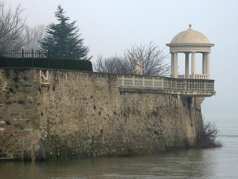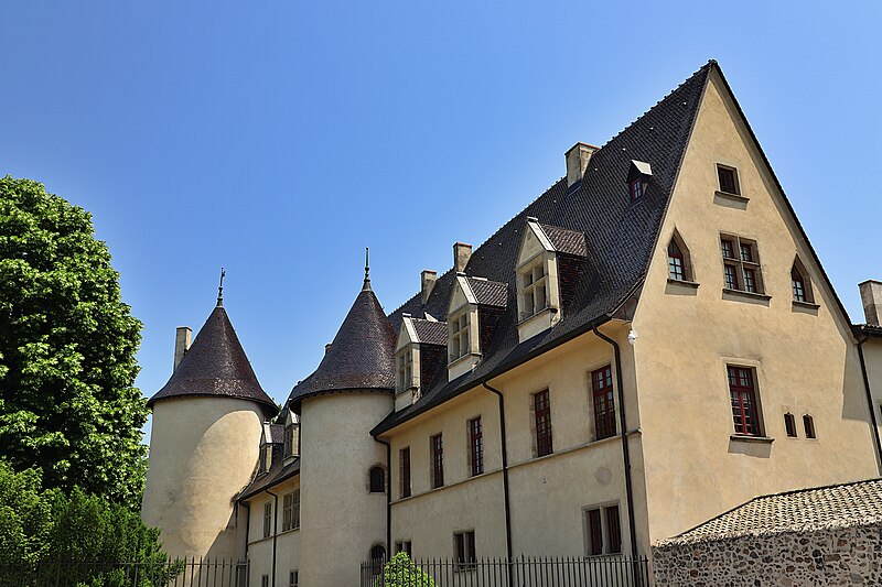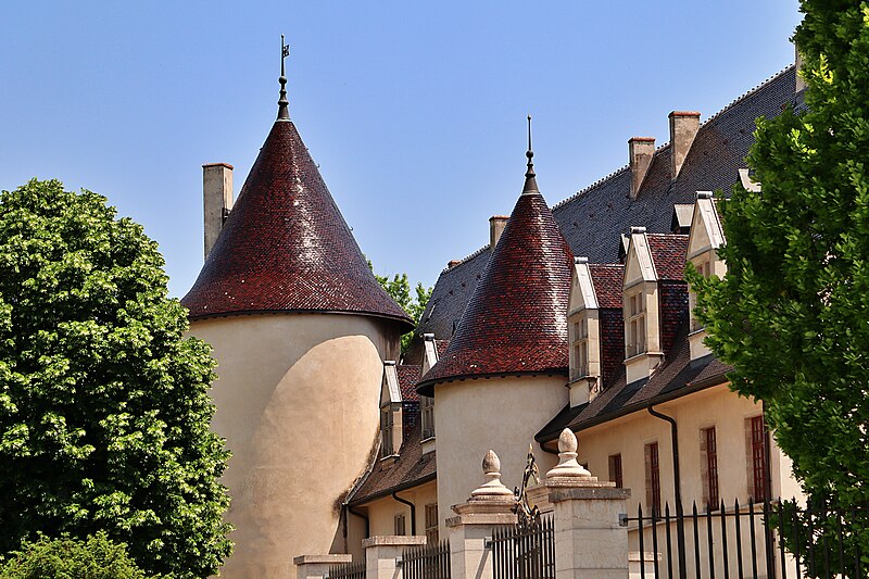 Le château d'Ampuis occupe un site d'origine gallo-romaine et se développe autour d'une maison forte mentionnée dès le XIVe siècle, transformée aux XVIe et XVIIe siècles en demeure seigneuriale et remaniée au XVIIIe siècle, avec quelques modifications intérieures au XXe siècle. Il se situe sur la commune d'Ampuis, à l'est du département du Rhône, sur la rive droite du Rhône, au pied du vignoble de Côte-Rôtie. L'édifice fait l'objet d'une inscription partielle au titre des monuments historiques par arrêté du 22 juillet 1996 ; sont protégés le château lui‑même, la chapelle, le portail d'entrée à colonnes antiques et fronton, ainsi que le jardin devant le château, y compris le mur de soutènement de la terrasse sur le Rhône et le belvédère. Dès l'Antiquité est attestée la villa d'Ampucius, puis la présence de seigneurs locaux à différentes époques ; la seigneurie a été détenue successivement par plusieurs familles, parmi lesquelles les Maugiron, puis les Harenc de la Condamine, les Cholier de Cibeins, et d'autres propriétaires jusqu'à la famille Guigal. La maison de Maugiron a laissé une longue filiation de seigneurs dont certains sont nommés dans les archives, tandis que Louis Hector Melchior Marie Harenc acquiert le domaine au milieu du XVIIIe siècle. Par la suite le domaine passe entre diverses mains — parmi lesquelles Laurent Gabriel Léonor Cholier de Cibeins, la famille Fustier, la famille Troussier — avant d'être acquis au début de 1995 par la famille Guigal, qui en fait son siège social et entreprend des travaux de restauration entre 1995 et 2006. Du « château haut » situé à la Garde il ne reste rien ; du « château bas » d'origine subsistent deux des quatre tours rondes. Le corps principal, long rectangle orienté nord-est/sud-ouest, date du milieu du XVe siècle et conserve des plafonds « à la Serlio » au rez-de-chaussée et « à la fougère » au premier étage. Un donjon circulaire s'appuie au nord-est, un pavillon flanque le côté sud-ouest et forme avec le corps principal un plan en « L » ; le logis est remanié entre 1592 et 1622 dans un goût classique. Le colombier, édifié en 1653, a été transformé au XIXe siècle en chapelle ; l'escalier principal et celui de l'aile sud datent de 1640 et des portes‑fenêtres sont percées en 1748. La toiture à double pente en tuiles plates a été refaite au XIXe siècle et les fossés ont été remblayés au XXe siècle. Divers bâtiments parallèles à l'aile sud complètent l'ensemble ; face au corps principal s'étendent des jardins à la française sur une terrasse donnant sur le Rhône, réaménagés vers 1935, avec un belvédère à l'angle ouest, tandis qu'un jardin à l'anglaise occupe la partie nord du domaine. Le château, ses tourelles et le portail sont ornés d'armoiries liées aux familles qui se sont succédé : Maugiron, Harenc de la Condamine, Cholier de Cibeins et Guigal, dont les blasons sont mentionnés dans les sources héraldiques. Les archives des familles de Maugiron et d'Harenc de la Condamine sont conservées aux Archives du département du Rhône et de la métropole de Lyon, tandis que celles de la famille Cholier de Cibeins se trouvent aux Archives municipales de Lyon. Parmi les références bibliographiques figurent F. Anselme (Le palais de l'honneur, 1663), Jean Antoine de La Tour de Varan (Études historiques sur le Forez, 1854) et Borel d'Hauterive (Annuaire de la noblesse de France, 1856).