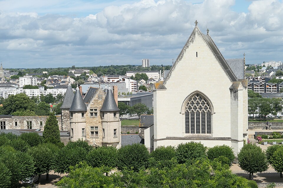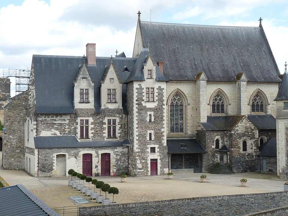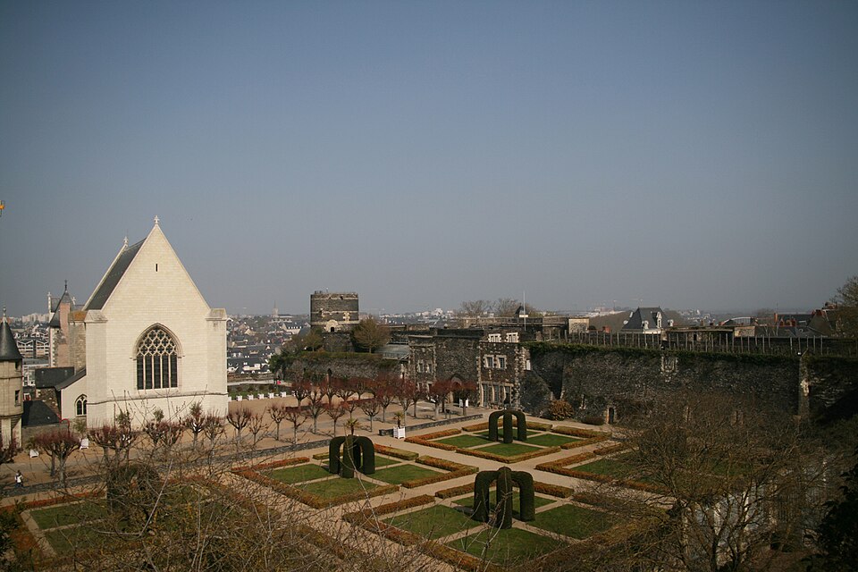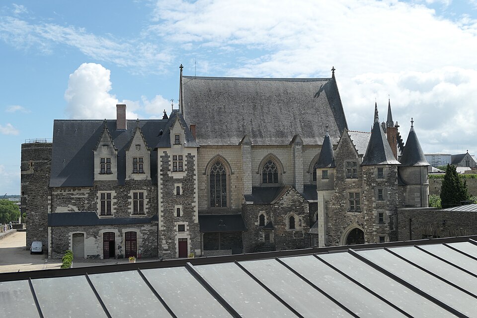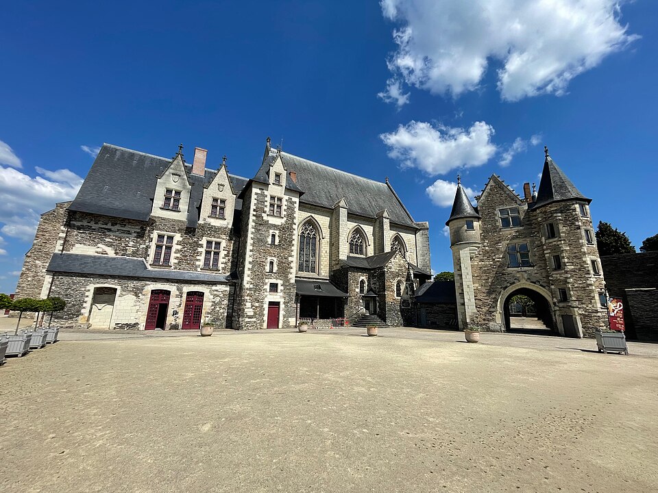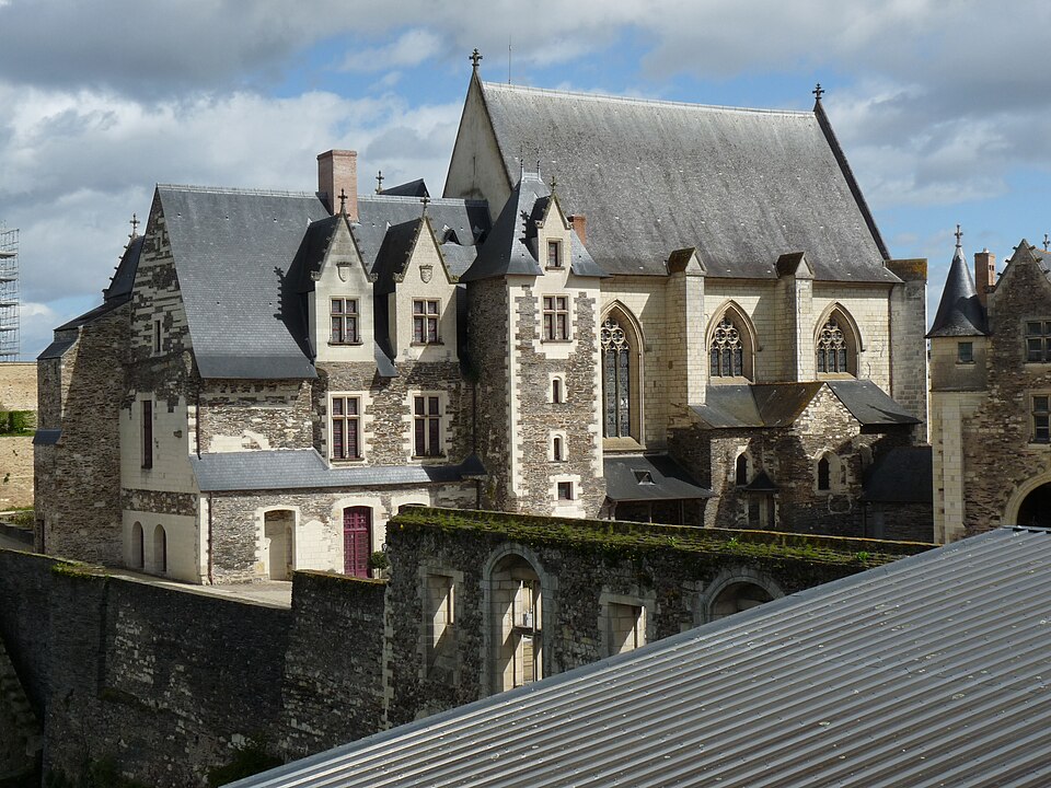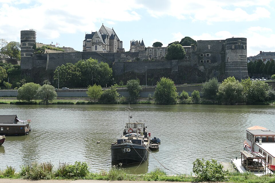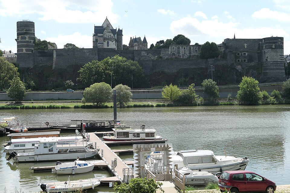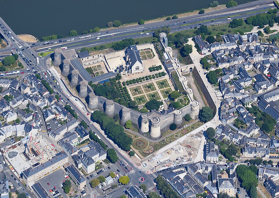 Le château d'Angers, aussi appelé château des ducs d'Anjou, domine la Maine depuis un promontoire de schiste et associe une forteresse royale du XIIIe siècle à des bâtiments résidentiels ducaux. Le site est occupé depuis le Mésolithique : des fouilles ont mis au jour un cairn néolithique ainsi que des traces d'occupations gauloise et romaine. Les parties les plus anciennes datent des Xe–XIe siècles, époque des comtes ingelgériens, et comprennent des élévations de la grande salle comtale. Après l'incendie du début du XIIe siècle, Henri II Plantagenêt reconstruit des éléments tels que la collégiale Saint‑Laud et des aménagements dans le mur ouest. Sous Louis IX, la forteresse actuelle est élevée à partir de 1230 : elle forme une enceinte d'environ 800 mètres ponctuée de dix‑sept tours. Ces tours, larges d'environ dix‑huit mètres et hautes d'une trentaine de mètres, sont bâties en alternance de schiste et de tuffeau. Les murailles sont renforcées à la fin du XVIe siècle par un épais rempart de terre et plusieurs tours sont arasées pour installer des plates‑formes d'artillerie et des canonnières. À partir du XIVe siècle, le château devient résidence ducale et connaît d'importantes transformations : aménagement de logis, rénovation de la grande salle, construction d'une chapelle et édification d'un châtelet au XVe siècle. Louis Ier d'Anjou commande vers 1373 la tenture de l'Apocalypse, œuvre monumentale qui est conservée dans la galerie dédiée depuis 1954. Louis II fait ériger le logis royal et la chapelle Saint‑Jean‑Baptiste au début du XVe siècle ; Yolande d'Aragon fait restaurer les défenses et y installe la relique de la Vraie Croix. René d'Anjou double le logis d'une galerie entre 1435 et 1453 ; son escalier porte sa devise et ouvre la demeure sur la cour seigneuriale. Le châtelet d'entrée, attribué à Guillaume Robin, complète l'ensemble autour de 1450–1456. Revenu sous autorité royale à la fin du XVe siècle, le château est ensuite adapté aux armes à feu au XVIe siècle par des architectes militaires et fait l'objet d'arasements partiels ordonnés en 1585, travaux partiellement menés puis interrompus. Aux XVIIe et XVIIIe siècles il sert de prison d'État, de garnison et d'hospice pour invalides ; au XIXe et au début du XXe siècle l'armée y installe prisons, arsenaux et ateliers. Pendant la Seconde Guerre mondiale le site, occupé par les Allemands, sert de dépôt de munitions et subit des bombardements en mai 1944 qui endommagent la chapelle et le logis royal. Après 1945 l'architecte Bernard Vitry restaure le monument et réalise la galerie destinée à présenter la tenture de l'Apocalypse. Des fouilles préventives conduites entre 1992 et 2003 ont mis en lumière les vestiges du palais comtal et des occupations anciennes, enrichissant la connaissance du site. Un incendie en janvier 2009 détruit la toiture du logis royal sans endommager la tenture ; la restauration du logis se termine en 2014. Le plan médiéval reste lisible : enceinte et tours, porte des Champs et porte de la Ville, fossés aujourd'hui transformés en jardins et cours intérieures séparant basse‑cour et cour seigneuriale. La grande salle comtale conserve des aménagements successifs depuis le Xe siècle, et les chapelles témoignent des usages religieux du château à travers les siècles. La galerie du roi René, les voûtes et les clefs armoriées, ainsi que le châtelet et le logis du gouverneur, illustrent la superposition des fonctions militaire et résidentielle. Aujourd'hui le château abrite la tenture de l'Apocalypse, des espaces d'accueil et d'exposition restaurés, et fait partie des monuments gérés par le Centre des monuments nationaux.