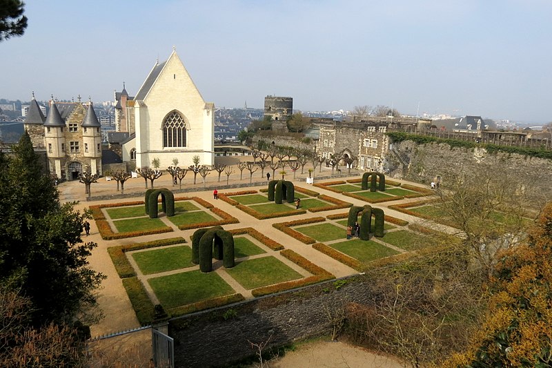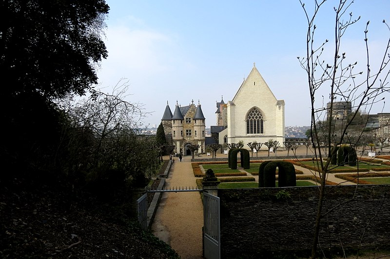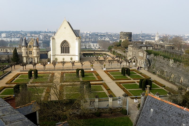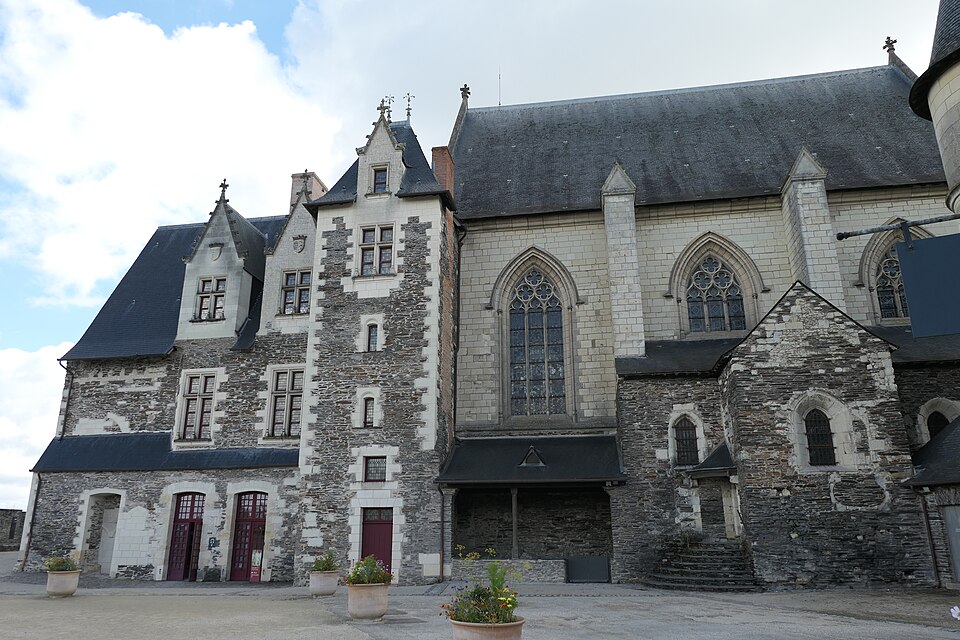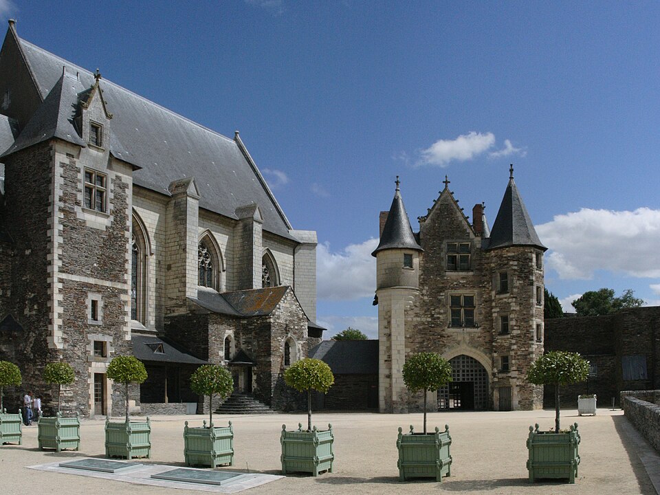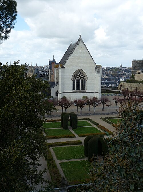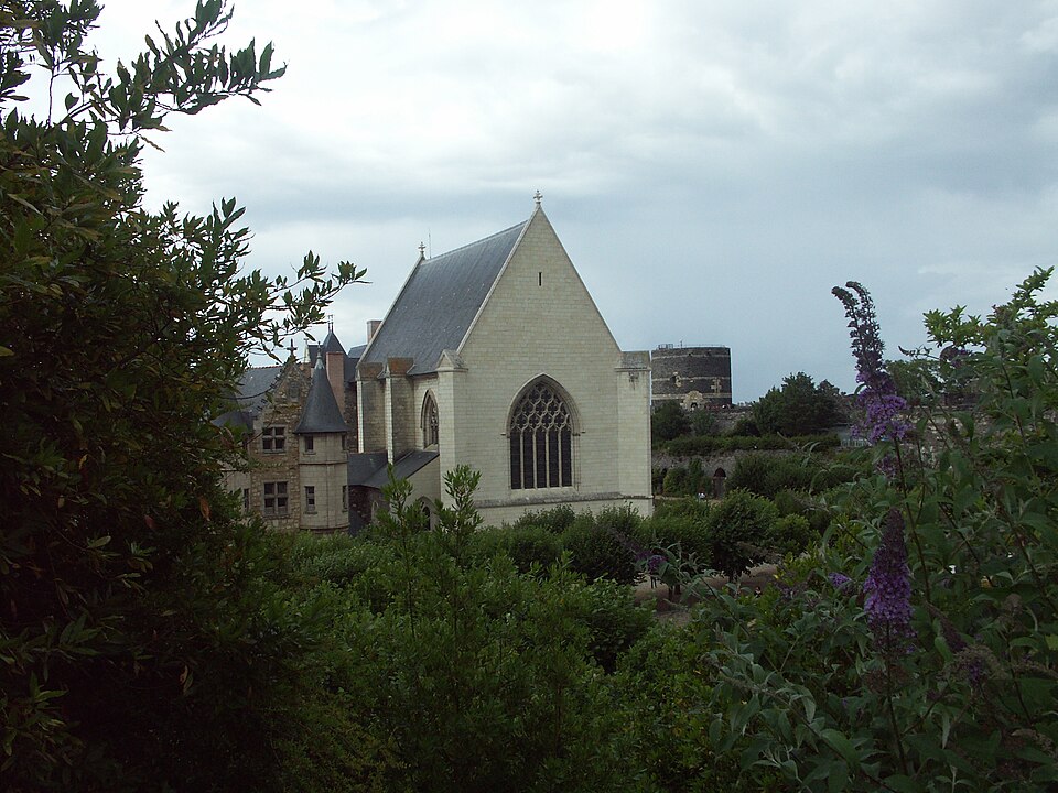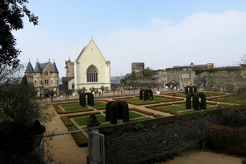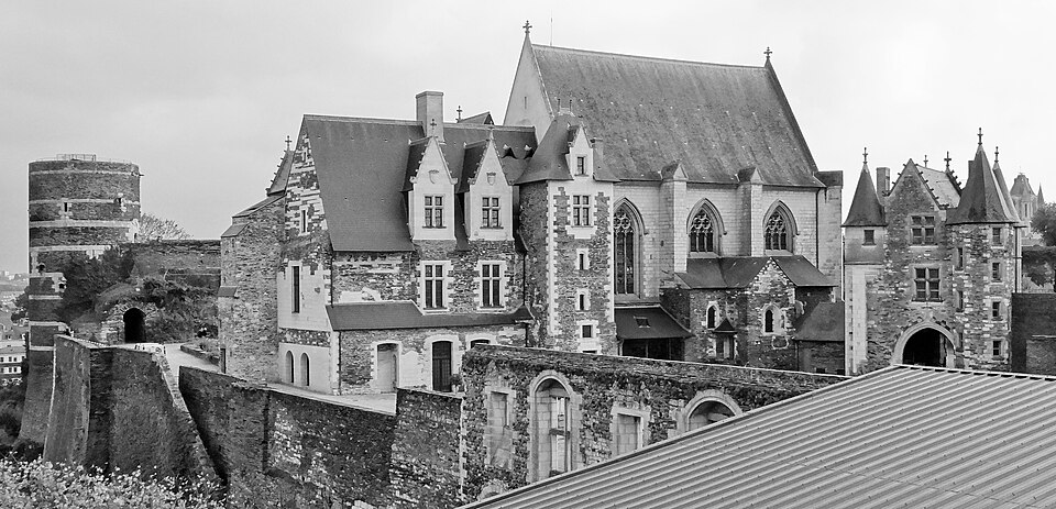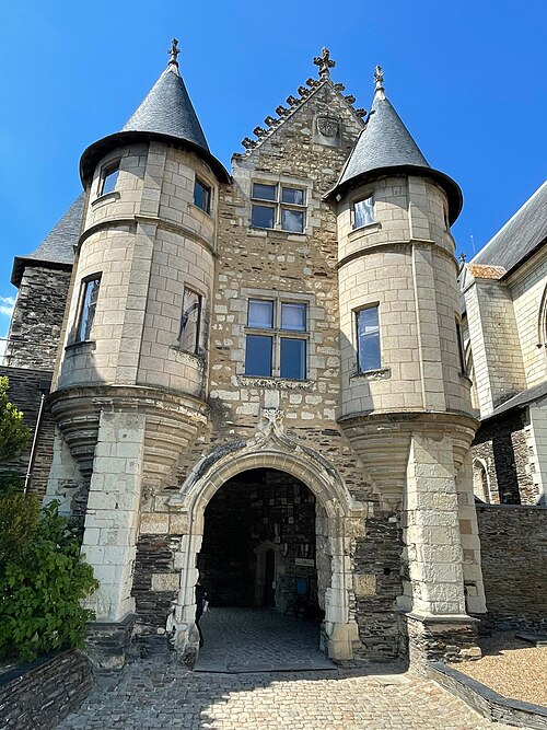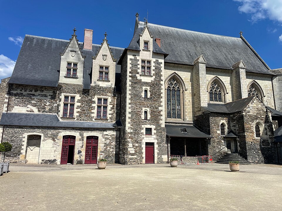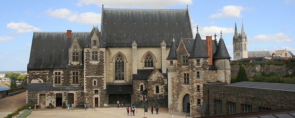 Le château d'Angers, aussi appelé château des ducs d'Anjou, domine la Maine depuis un promontoire de schiste et associe une forteresse royale du XIIIe siècle à des bâtiments résidentiels ducaux. Le site est occupé depuis le Mésolithique : des fouilles ont mis au jour un cairn néolithique ainsi que des traces d'occupations gauloise et romaine. Les parties les plus anciennes datent des Xe–XIe siècles, époque des comtes ingelgériens, et comprennent des élévations de la grande salle comtale. Après l'incendie du début du XIIe siècle, Henri II Plantagenêt reconstruit des éléments tels que la collégiale Saint‑Laud et des aménagements dans le mur ouest. Sous Louis IX, la forteresse actuelle est élevée à partir de 1230 : elle forme une enceinte d'environ 800 mètres ponctuée de dix‑sept tours. Ces tours, larges d'environ dix‑huit mètres et hautes d'une trentaine de mètres, sont bâties en alternance de schiste et de tuffeau. Les murailles sont renforcées à la fin du XVIe siècle par un épais rempart de terre et plusieurs tours sont arasées pour installer des plates‑formes d'artillerie et des canonnières. À partir du XIVe siècle, le château devient résidence ducale et connaît d'importantes transformations : aménagement de logis, rénovation de la grande salle, construction d'une chapelle et édification d'un châtelet au XVe siècle. Louis Ier d'Anjou commande vers 1373 la tenture de l'Apocalypse, œuvre monumentale qui est conservée dans la galerie dédiée depuis 1954. Louis II fait ériger le logis royal et la chapelle Saint‑Jean‑Baptiste au début du XVe siècle ; Yolande d'Aragon fait restaurer les défenses et y installe la relique de la Vraie Croix. René d'Anjou double le logis d'une galerie entre 1435 et 1453 ; son escalier porte sa devise et ouvre la demeure sur la cour seigneuriale. Le châtelet d'entrée, attribué à Guillaume Robin, complète l'ensemble autour de 1450–1456. Revenu sous autorité royale à la fin du XVe siècle, le château est ensuite adapté aux armes à feu au XVIe siècle par des architectes militaires et fait l'objet d'arasements partiels ordonnés en 1585, travaux partiellement menés puis interrompus. Aux XVIIe et XVIIIe siècles il sert de prison d'État, de garnison et d'hospice pour invalides ; au XIXe et au début du XXe siècle l'armée y installe prisons, arsenaux et ateliers. Pendant la Seconde Guerre mondiale le site, occupé par les Allemands, sert de dépôt de munitions et subit des bombardements en mai 1944 qui endommagent la chapelle et le logis royal. Après 1945 l'architecte Bernard Vitry restaure le monument et réalise la galerie destinée à présenter la tenture de l'Apocalypse. Des fouilles préventives conduites entre 1992 et 2003 ont mis en lumière les vestiges du palais comtal et des occupations anciennes, enrichissant la connaissance du site. Un incendie en janvier 2009 détruit la toiture du logis royal sans endommager la tenture ; la restauration du logis se termine en 2014. Le plan médiéval reste lisible : enceinte et tours, porte des Champs et porte de la Ville, fossés aujourd'hui transformés en jardins et cours intérieures séparant basse‑cour et cour seigneuriale. La grande salle comtale conserve des aménagements successifs depuis le Xe siècle, et les chapelles témoignent des usages religieux du château à travers les siècles. La galerie du roi René, les voûtes et les clefs armoriées, ainsi que le châtelet et le logis du gouverneur, illustrent la superposition des fonctions militaire et résidentielle. Aujourd'hui le château abrite la tenture de l'Apocalypse, des espaces d'accueil et d'exposition restaurés, et fait partie des monuments gérés par le Centre des monuments nationaux.