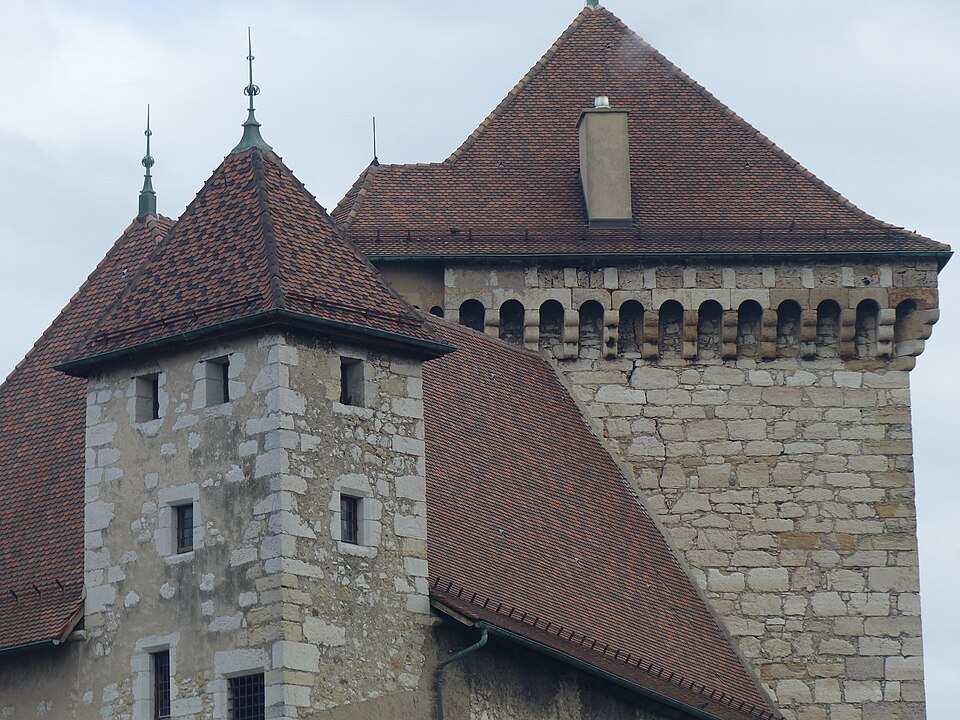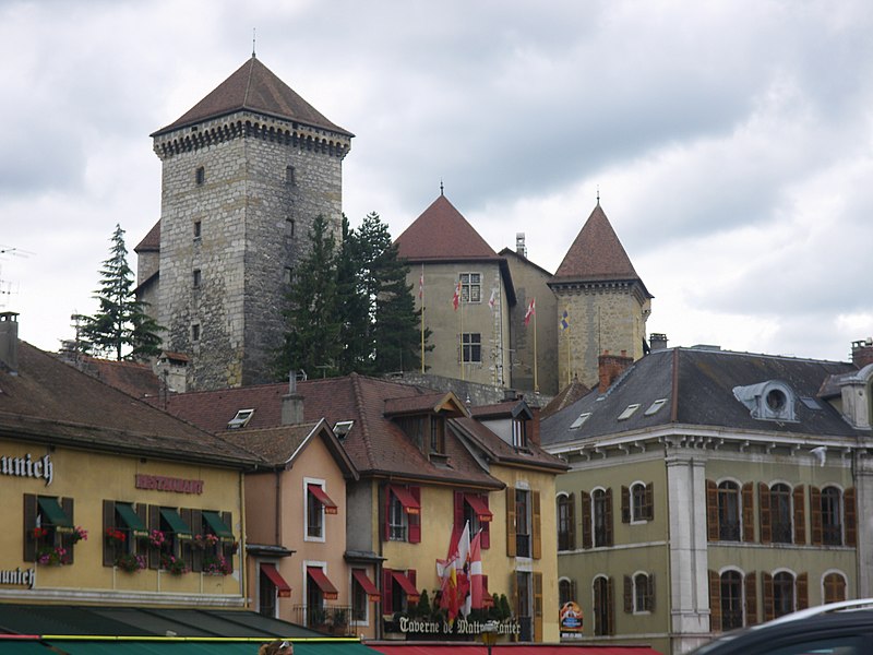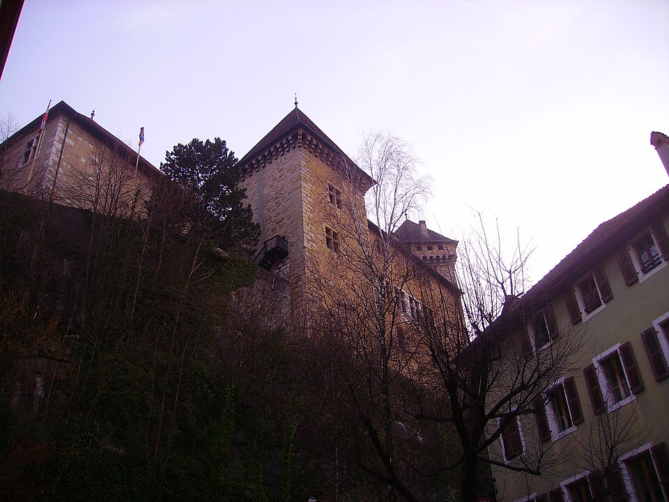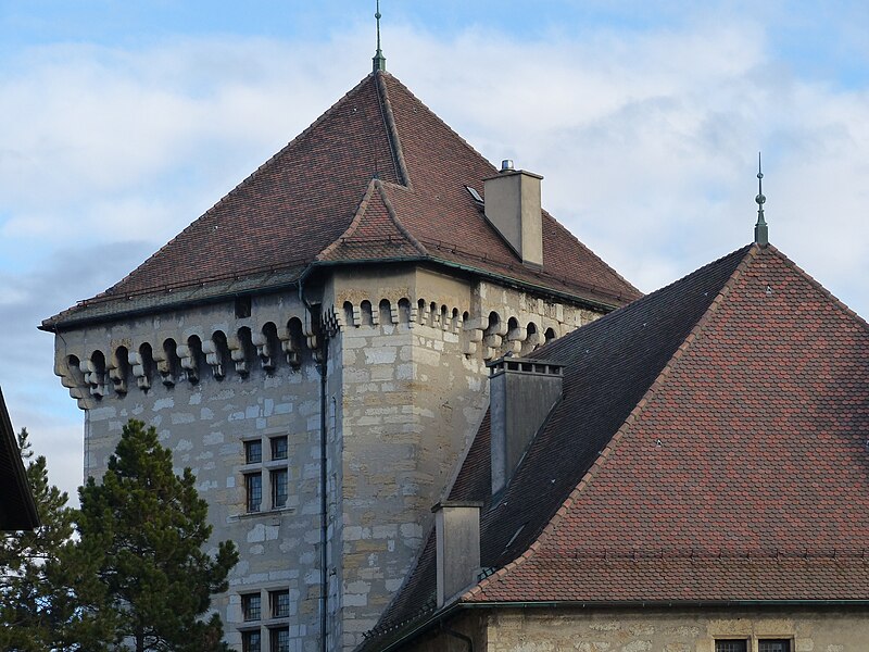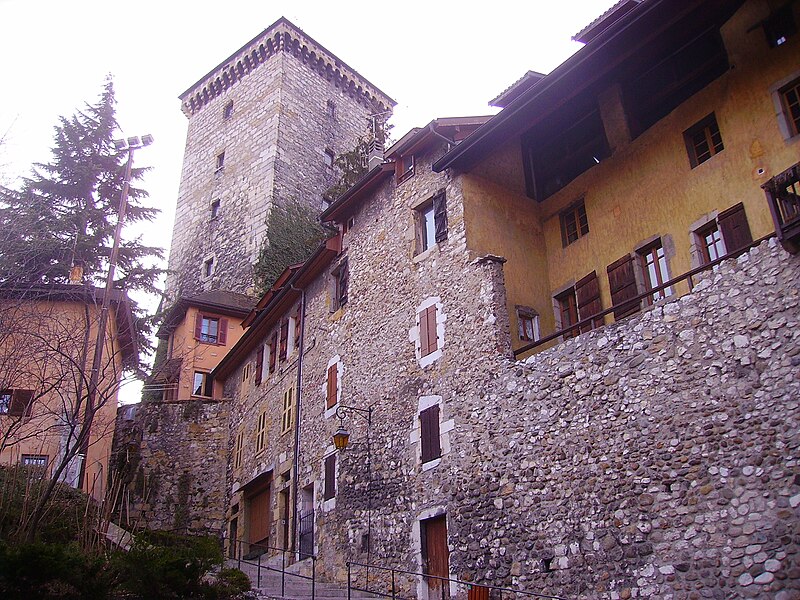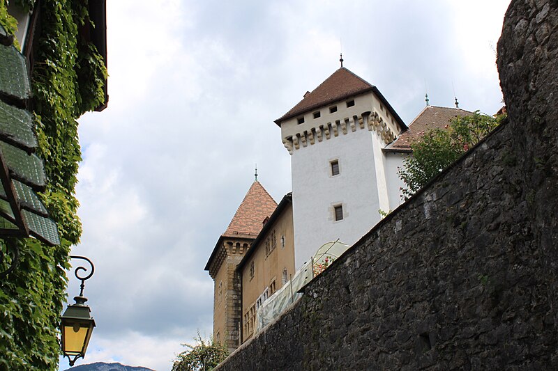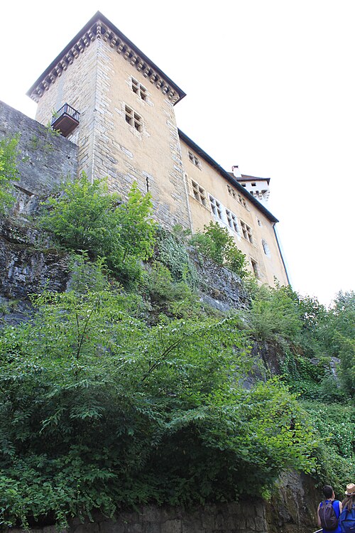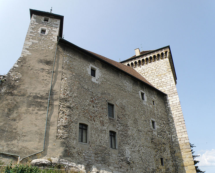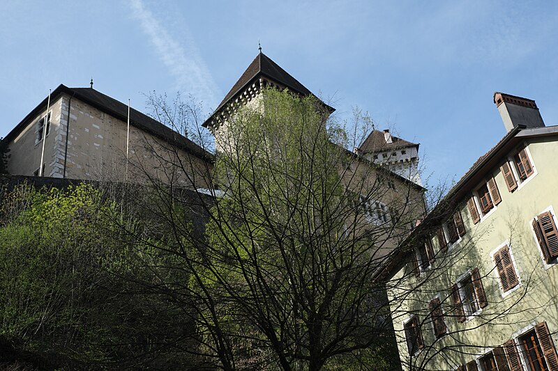 Le château d'Annecy domine la ville sur le dernier promontoire rocheux de la montagne du Semnoz, à 470 mètres d'altitude, et surveillait autrefois la route reliant Genève à l'Italie ainsi que les ponts franchissant l'émissaire du lac. Son origine reste incertaine ; une forteresse aurait existé dès le VIIIe siècle et la première mention connue du castrum remonte au 10 octobre 1219, lorsque la maison de Genève en fit sa résidence principale. Ancienne demeure des comtes de Genève puis des ducs de Savoie-Nemours, le château appartient à la ville depuis 1953, qui l'a restauré et transformé en musée et y a implanté l'Observatoire régional des lacs alpins. Entièrement détruit par un incendie le 27 avril 1340, il fut reconstruit par le comte Amédée III, qui fit notamment appel au peintre Pierre de Lausanne et au verrier Laurent pour orner la grande salle et la chambre comtale. Robert de Genève, né au château en 1342 et devenu pape à Avignon sous le nom de Clément VII, succéda à son frère Pierre comme comte et fit entreprendre d'importants travaux, avant que le domaine ne revienne en 1401 au comte de Savoie Amédée VIII. Amédée VIII le restaura, y rétablit notamment le Vieux-Logis après l'incendie de 1412 et fit réaliser des vitraux par Jean Loisel ; il y reçut le pape Martin V et des cardinaux à leur retour du concile de Constance. En 1440 le Genevois fut érigé en apanage au profit des cadets de la maison de Savoie, et la résidence se développa sous l'autorité des princes d'apanage qui firent construire et agrandir logis et tours, comme le Logis Perrière et le Logis Nemours, ainsi que le chemin de ronde. Le château accueillit des événements politiques et diplomatiques, dont une conférence en 1477 qui contribua à rétablir la paix après les guerres de Bourgogne, et resta lié aux fortunes des familles de Savoie-Nemours jusqu'au XVIIe siècle. En 1600 le roi Henri IV séjourna au château, qui fut ensuite le théâtre de divers conflits : un complot dévoilé à l'automne 1616 conduisit à son intervention militaire puis, en 1630, il fut pris par les troupes françaises commandées par le maréchal de Châtillon, lors duquel Louis XIII et Richelieu y séjournèrent brièvement. À la mort d'Henri II de Genevois-Nemours en 1659, l'apanage fut supprimé et le château redevint résidence du gouverneur d'Annecy ; il servit également, de façon très momentanée, d'évêché sous l'épiscopat de Jean d'Arenthon d'Alex. Occupé par les Espagnols en 1742, il subit de sérieux dégâts, puis fut déclaré bien national en 1793 et rebaptisé « Maison de la Montagne », accueillant les armées républicaines et impériales ; il conserva une vocation militaire jusque pendant la Seconde Guerre mondiale avant d'être, par la suite, occupé par des sans-abris. Un nouvel incendie l'endommagea en 1952 ; racheté et restauré par la commune en 1953, il abrite aujourd'hui des collections muséales et l'observatoire régional des lacs alpins. Le château fait l'objet d'un classement au titre des monuments historiques par arrêté du 12 octobre 1959. L'ensemble se présente comme une grande enceinte polygonale de 55 × 125 mètres épousant les contours du rocher ; elle aurait entouré une tour maîtresse rectangulaire aujourd'hui rasée et, à l'origine, l'accès était commandé par un pont-levis franchissant un fossé aujourd'hui comblé. Autour de la cour s'élèvent des bâtiments divers : au sud le plus ancien est un donjon carré dit « Tour de la Reine » daté du XIIe siècle, tandis que le chemin de ronde a été refait au XVIe siècle et que la porte de la herse relève d'une restauration de la fin du XIXe siècle. Sur le front nord, les tours de Saint‑Pierre et de Saint‑Paul (XIIIe siècle) encadrent le Vieux Logis (XIIIe‑XIVe siècles), flanqué du Logis Neuf et du Logis Nemours, créations du XVIe siècle ; au sud-est, la Tour et le Logis Perrière furent édifiés entre 1445 et 1487, la tour de 1455 remplaçant un ancien donjon. Une tour quadrangulaire massive, haute de 38 mètres et mesurant 14,70 × 15,40 mètres avec des murs de 3,85 à 4,19 mètres d'épaisseur, domine le front sud ; son accès se faisait à 13 mètres au niveau de la courtine et l'analyse archéologique distingue une base construite dans la seconde moitié du XIIIe siècle et des élévations postérieures à la charnière des XIVe et XVe siècles. La Grande Salle, édifice rectangulaire de 29 × 15 mètres, est flanquée des tours Saint‑Pierre et Saint‑Paul et adossée à une aile résidentielle ; au rez-de-chaussée, la « Salle des Colonnes » aménagée en 1340 comprend quatorze colonnes et fut transformée en cellier en 1394, tandis que la salle d'apparat, ou grande salle des fêtes, communiquant avec les appartements, présente une cheminée refaite au XVIe siècle, un plafond à caissons reconstitué par Amédée VIII et un escalier en vis important. L'aile résidentielle abrite au rez-de-chaussée une cuisine reconstruite au XVe siècle avec deux cheminées monumentales et un four, et à l'étage la « chambre rouge » et une chambre de parement autour d'un puits de 40 mètres déjà mentionné en 1428. La Tour des Princes, érigée en 1430 à la place d'une construction antérieure, est la seule tour à avoir conservé intégralement ses créneaux et mâchicoulis ; la « Tour du Miroir », datée de 1383 et haute de 25 mètres, reçut en 1430 un dispositif de surveillance identifiant son nom. Le Logis Nemours, rebâti en 1545 par Charlotte d'Orléans‑Longueville, conserve une frise peinte et des latrines à plusieurs places, tandis que le Logis du Gouvernement et la grande tour attenante, élevés ou remaniés au XVe siècle, comportent des plafonds du XVIe siècle, des vestiges de décor peint et des graffitis de soldats datant de la période où le château servit de caserne. Une chapelle située dans la cour complétait autrefois l'ensemble mais elle fu