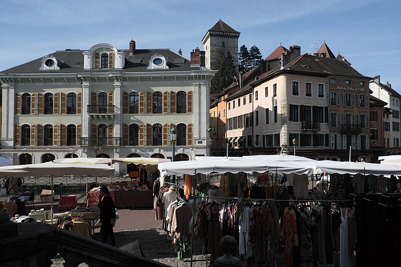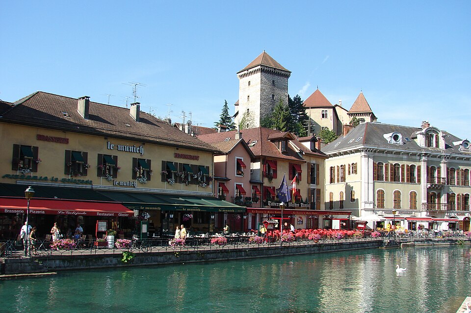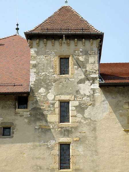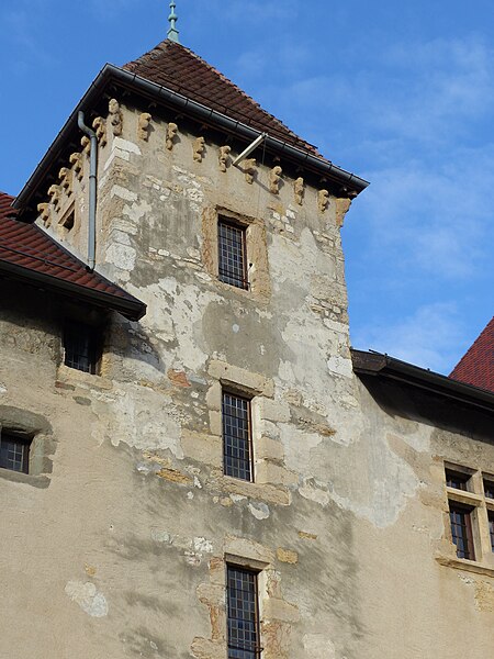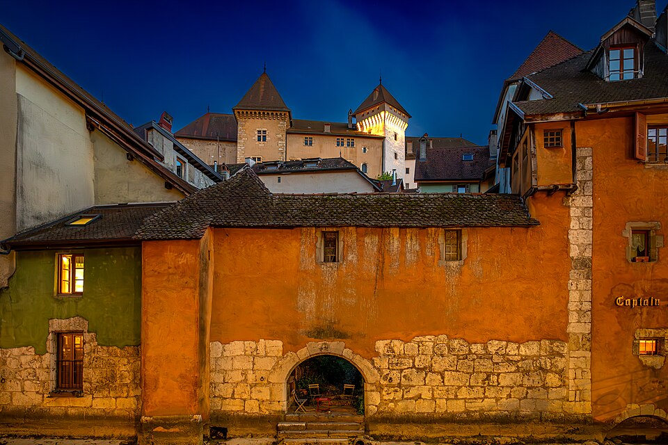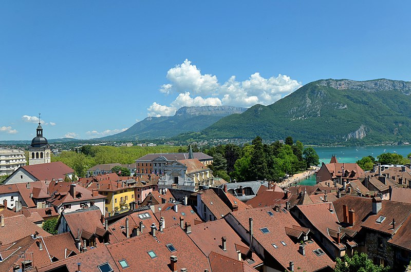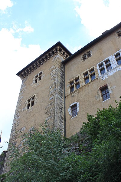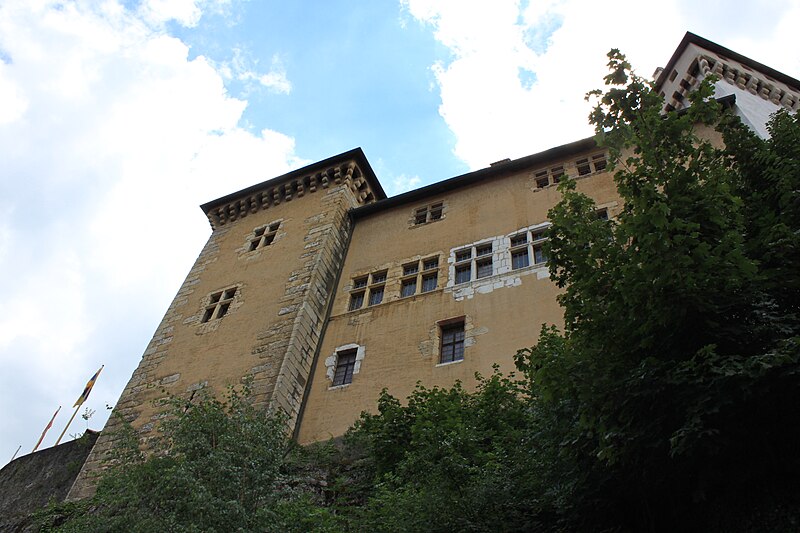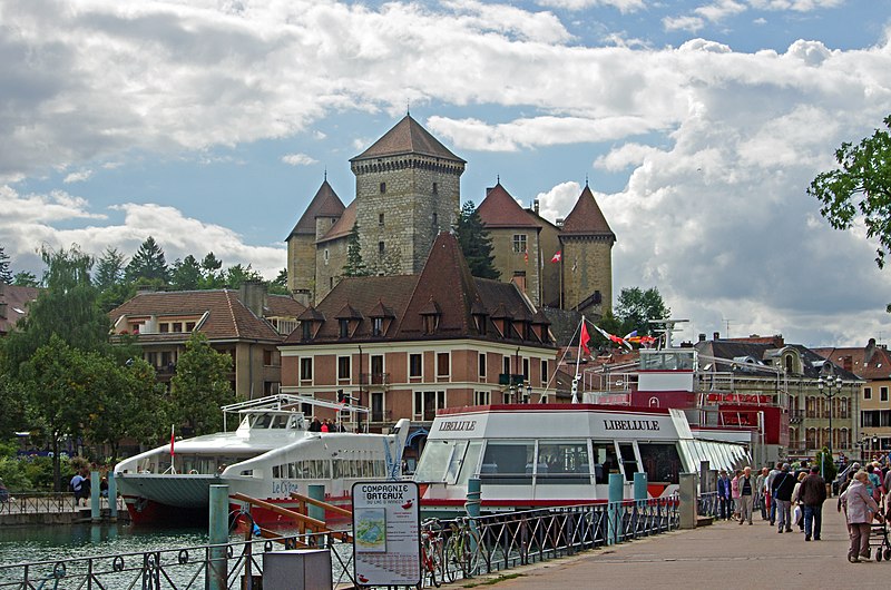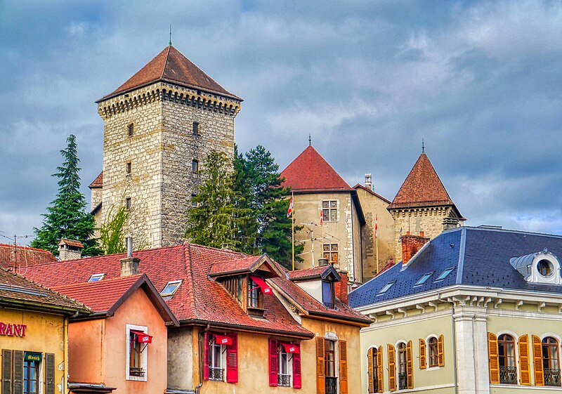 Le château d'Annecy domine la ville sur le dernier promontoire rocheux de la montagne du Semnoz, à 470 mètres d'altitude, et surveillait autrefois la route reliant Genève à l'Italie ainsi que les ponts franchissant l'émissaire du lac. Son origine reste incertaine ; une forteresse aurait existé dès le VIIIe siècle et la première mention connue du castrum remonte au 10 octobre 1219, lorsque la maison de Genève en fit sa résidence principale. Ancienne demeure des comtes de Genève puis des ducs de Savoie-Nemours, le château appartient à la ville depuis 1953, qui l'a restauré et transformé en musée et y a implanté l'Observatoire régional des lacs alpins. Entièrement détruit par un incendie le 27 avril 1340, il fut reconstruit par le comte Amédée III, qui fit notamment appel au peintre Pierre de Lausanne et au verrier Laurent pour orner la grande salle et la chambre comtale. Robert de Genève, né au château en 1342 et devenu pape à Avignon sous le nom de Clément VII, succéda à son frère Pierre comme comte et fit entreprendre d'importants travaux, avant que le domaine ne revienne en 1401 au comte de Savoie Amédée VIII. Amédée VIII le restaura, y rétablit notamment le Vieux-Logis après l'incendie de 1412 et fit réaliser des vitraux par Jean Loisel ; il y reçut le pape Martin V et des cardinaux à leur retour du concile de Constance. En 1440 le Genevois fut érigé en apanage au profit des cadets de la maison de Savoie, et la résidence se développa sous l'autorité des princes d'apanage qui firent construire et agrandir logis et tours, comme le Logis Perrière et le Logis Nemours, ainsi que le chemin de ronde. Le château accueillit des événements politiques et diplomatiques, dont une conférence en 1477 qui contribua à rétablir la paix après les guerres de Bourgogne, et resta lié aux fortunes des familles de Savoie-Nemours jusqu'au XVIIe siècle. En 1600 le roi Henri IV séjourna au château, qui fut ensuite le théâtre de divers conflits : un complot dévoilé à l'automne 1616 conduisit à son intervention militaire puis, en 1630, il fut pris par les troupes françaises commandées par le maréchal de Châtillon, lors duquel Louis XIII et Richelieu y séjournèrent brièvement. À la mort d'Henri II de Genevois-Nemours en 1659, l'apanage fut supprimé et le château redevint résidence du gouverneur d'Annecy ; il servit également, de façon très momentanée, d'évêché sous l'épiscopat de Jean d'Arenthon d'Alex. Occupé par les Espagnols en 1742, il subit de sérieux dégâts, puis fut déclaré bien national en 1793 et rebaptisé « Maison de la Montagne », accueillant les armées républicaines et impériales ; il conserva une vocation militaire jusque pendant la Seconde Guerre mondiale avant d'être, par la suite, occupé par des sans-abris. Un nouvel incendie l'endommagea en 1952 ; racheté et restauré par la commune en 1953, il abrite aujourd'hui des collections muséales et l'observatoire régional des lacs alpins. Le château fait l'objet d'un classement au titre des monuments historiques par arrêté du 12 octobre 1959. L'ensemble se présente comme une grande enceinte polygonale de 55 × 125 mètres épousant les contours du rocher ; elle aurait entouré une tour maîtresse rectangulaire aujourd'hui rasée et, à l'origine, l'accès était commandé par un pont-levis franchissant un fossé aujourd'hui comblé. Autour de la cour s'élèvent des bâtiments divers : au sud le plus ancien est un donjon carré dit « Tour de la Reine » daté du XIIe siècle, tandis que le chemin de ronde a été refait au XVIe siècle et que la porte de la herse relève d'une restauration de la fin du XIXe siècle. Sur le front nord, les tours de Saint‑Pierre et de Saint‑Paul (XIIIe siècle) encadrent le Vieux Logis (XIIIe‑XIVe siècles), flanqué du Logis Neuf et du Logis Nemours, créations du XVIe siècle ; au sud-est, la Tour et le Logis Perrière furent édifiés entre 1445 et 1487, la tour de 1455 remplaçant un ancien donjon. Une tour quadrangulaire massive, haute de 38 mètres et mesurant 14,70 × 15,40 mètres avec des murs de 3,85 à 4,19 mètres d'épaisseur, domine le front sud ; son accès se faisait à 13 mètres au niveau de la courtine et l'analyse archéologique distingue une base construite dans la seconde moitié du XIIIe siècle et des élévations postérieures à la charnière des XIVe et XVe siècles. La Grande Salle, édifice rectangulaire de 29 × 15 mètres, est flanquée des tours Saint‑Pierre et Saint‑Paul et adossée à une aile résidentielle ; au rez-de-chaussée, la « Salle des Colonnes » aménagée en 1340 comprend quatorze colonnes et fut transformée en cellier en 1394, tandis que la salle d'apparat, ou grande salle des fêtes, communiquant avec les appartements, présente une cheminée refaite au XVIe siècle, un plafond à caissons reconstitué par Amédée VIII et un escalier en vis important. L'aile résidentielle abrite au rez-de-chaussée une cuisine reconstruite au XVe siècle avec deux cheminées monumentales et un four, et à l'étage la « chambre rouge » et une chambre de parement autour d'un puits de 40 mètres déjà mentionné en 1428. La Tour des Princes, érigée en 1430 à la place d'une construction antérieure, est la seule tour à avoir conservé intégralement ses créneaux et mâchicoulis ; la « Tour du Miroir », datée de 1383 et haute de 25 mètres, reçut en 1430 un dispositif de surveillance identifiant son nom. Le Logis Nemours, rebâti en 1545 par Charlotte d'Orléans‑Longueville, conserve une frise peinte et des latrines à plusieurs places, tandis que le Logis du Gouvernement et la grande tour attenante, élevés ou remaniés au XVe siècle, comportent des plafonds du XVIe siècle, des vestiges de décor peint et des graffitis de soldats datant de la période où le château servit de caserne. Une chapelle située dans la cour complétait autrefois l'ensemble mais elle fu