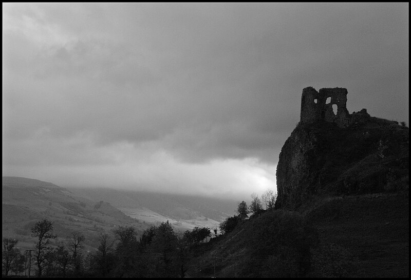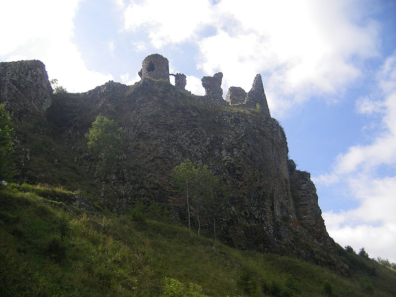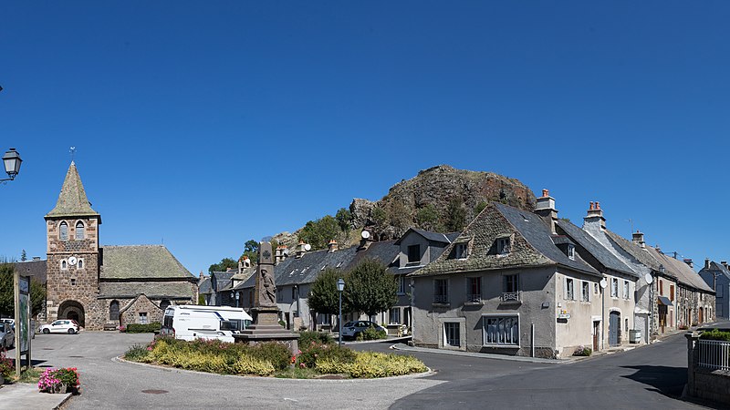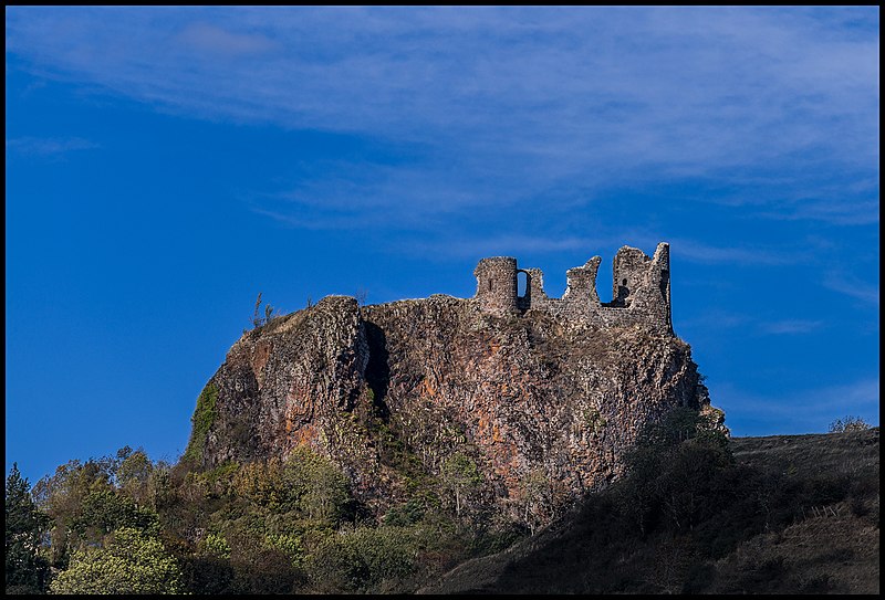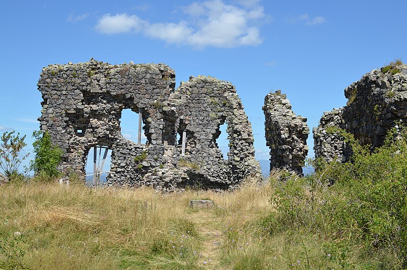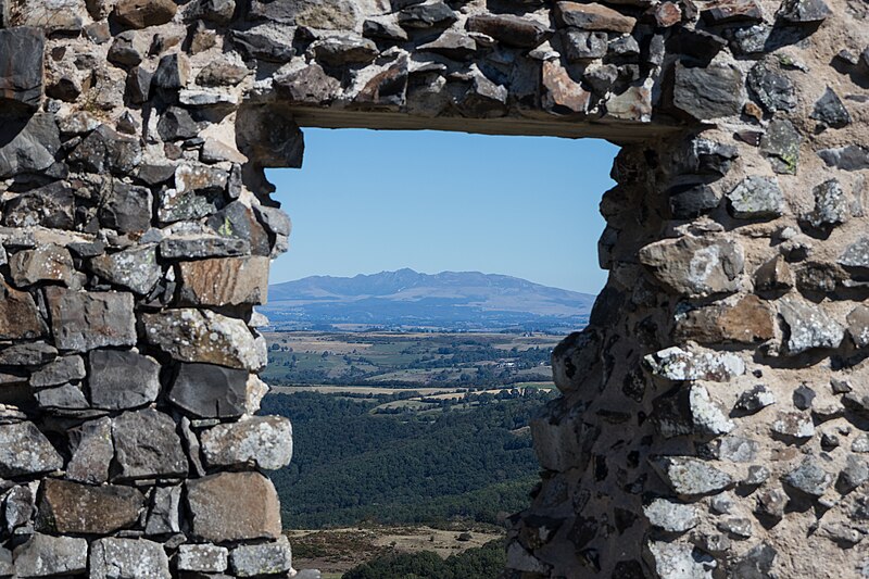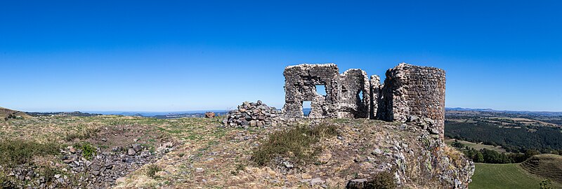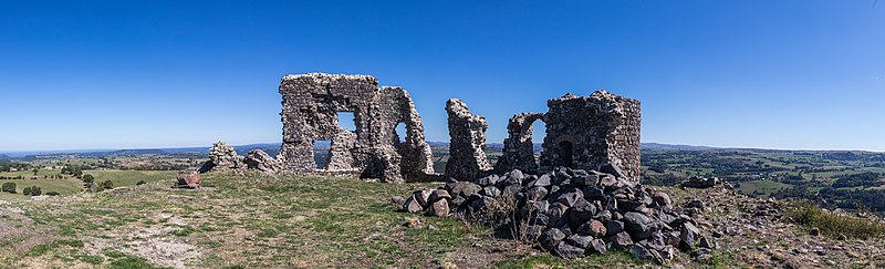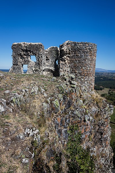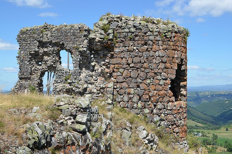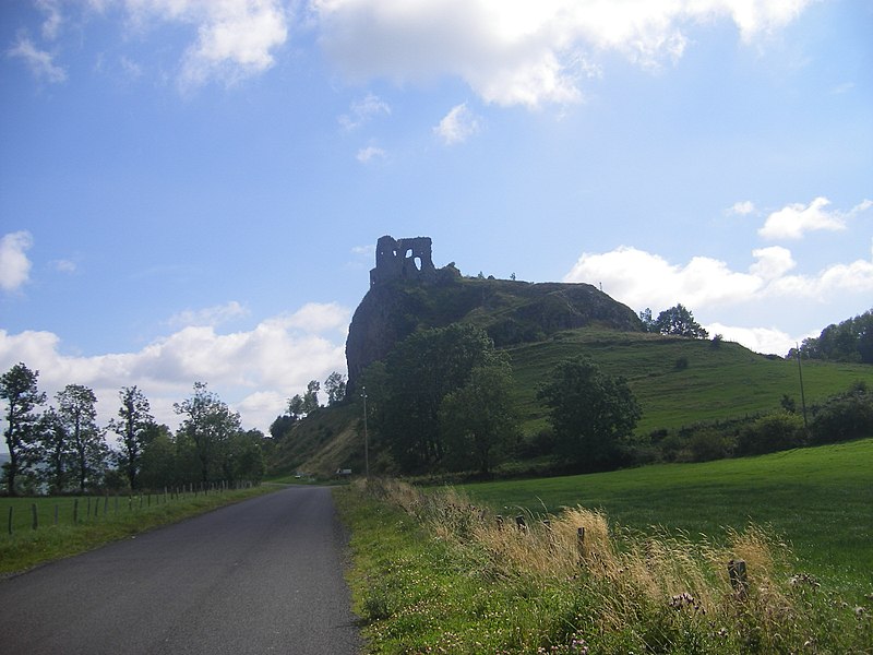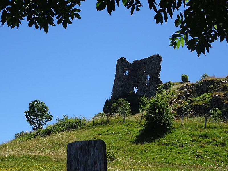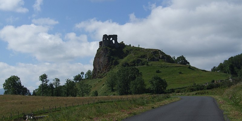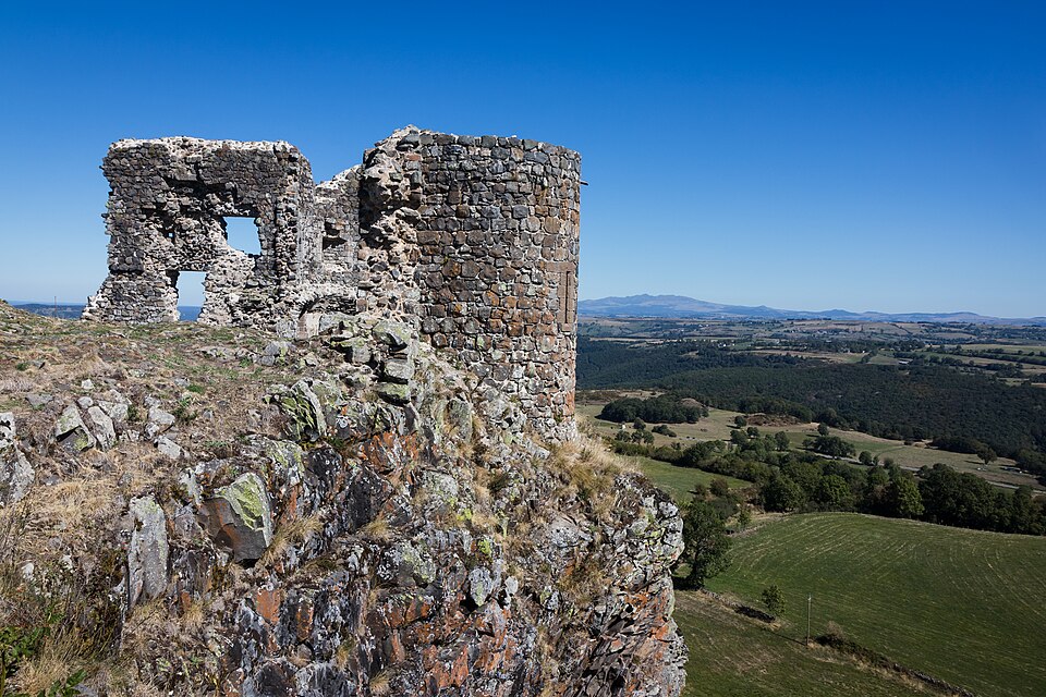 Les vestiges du château fort d'Apchon permettent encore de lire certaines dispositions anciennes : les logis nord et est en équerre avec leurs tours, ainsi qu'une partie de l'enceinte comportant tours et poternes. Cette forteresse, sans doute édifiée aux XIIe-XIIIe siècles, a été reconstruite entre 1408 et 1422. Elle fut le château médiéval de la famille d'Apchon, l'une des plus puissantes de la noblesse de Haute-Auvergne, et se dresse sur un puech dominant le village d'Apchon dans le Cantal. Pendant la guerre de Cent Ans, le château se trouva à la frontière entre le territoire conquis par les Anglais et celui resté sous le contrôle du roi de France ; il fut plusieurs fois attaqué et servit de point de départ pour la reconquête du Limousin. Le site n'était plus habitable en 1760. Le peintre Auguste Bonheur en a réalisé un tableau en 1852. Implanté au sommet d'un dyke basaltique à 1 100 mètres d'altitude, le château domine les vallées de la Rhue, de la Santoire et du Marilhou. L'enceinte est cantonnée de cinq tours rondes et de deux tours engagées. Inscrit à l'inventaire des monuments historiques par arrêté du 24 février 2012, le site a fait l'objet d'un programme communal de sauvegarde et de sécurisation. La première phase de travaux, estimée à 220 000 €, a débuté en septembre 2016 et a bénéficié du soutien de partenaires publics et de donateurs privés via une souscription ouverte par la Fondation du Patrimoine. Deux autres tranches de travaux sont prévues, dans le cadre d'un plan de valorisation intégré au développement touristique porté par la communauté de communes du Pays Gentiane.