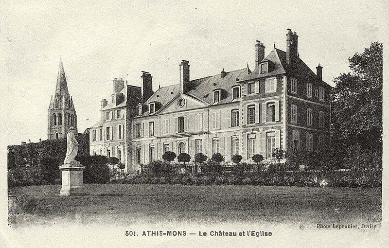 Le château d'Athis se situe à Athis-Mons, en Hurepoix, dans le département de l'Essonne en Île-de-France, à seize kilomètres au sud-est de Paris. Il est implanté sur la rive gauche de la Seine, au versant ouest de la vallée, au cœur d'un parc de douze hectares aujourd'hui en grande partie occupé par des installations scolaires. Dès le XVe siècle une maison seigneuriale appartenant à Pierre Poignant existait à cet emplacement ; le domaine a été agrandi à la fin du XVIe siècle par Pierre Violle et reconstruit au XVIIe siècle par la famille de La Brousse, qui acquit la seigneurie en 1628. Un plan de 1693 montre déjà le corps de logis actuel flanqué de deux pavillons. En 1743 la seigneurie passa à Louise Anne de Bourbon, dite Mademoiselle de Charolais, qui fit du château sa résidence d'été ; elle déplaça la ferme seigneuriale pour créer une cour d'honneur bordée de pavillons d'entrée et aménagea une perspective axée sur le château. Elle fit encore prolonger le pavillon ouest de deux travées (date portée apocryphe) et fit édifier, vers 1750, une chapelle seigneuriale sur le flanc nord de l'église. En 1881 le domaine fut acquis par Alphonse Chodron de Courcel, qui confia à l'architecte Georges Lisch divers aménagements : adjonction, avec date portée 1906, d'un bâtiment abritant une bibliothèque contre le pignon ouest, édification de deux tourelles reliant le château aux communs et ouvrant sur le parc, réalisation d'une galerie conduisant à la chapelle et implantation de piliers monumentaux face à la grille en demi-lune et le long de l'allée d'honneur. Le collège Saint-Charles, transféré à Athis-Mons en 1946 après la destruction de son établissement de Juvisy, occupa la propriété ; des bâtiments scolaires, une chapelle et des terrains de sport furent construits autour du château entre 1950 et 1958. Le parc, aménagé au XVIIe siècle par la famille de La Brousse et embelli au XVIIIe siècle par Mademoiselle de Charolais, a perdu l'essentiel de ses éléments d'architecture — murs de soutènement, fontaines, cascade et canal alimenté par l'Orge — et la partie escarpée du coteau est aujourd'hui couverte de bois. Le château présente un plan classique : un corps central en pierre de taille, avec un rez-de-chaussée et deux niveaux dont l'un est mansardé, percé de sept baies par niveau et dominé par un fronton pyramidal central percé d'un oculus et encadré de deux lucarnes. Le bâtiment est complété par deux ailes rectangulaires de deux travées et par un corps de logis sur la façade sud ; les communs encadrent la cour d'honneur, les plus méridionaux d'entre eux étant munis de deux tourelles. La cour est close par un portail en demi-lune encadré de deux pavillons, et une vaste chapelle complète l'ensemble au nord. Au bout de l'avenue, un pavillon octogone fut, selon les témoignages, construit pour recevoir Louis XV ; richement meublé, il fut pillé et détruit lors des incendies qui affectèrent plusieurs châteaux, et il n'en subsiste que les fondations. Les jardins, disposés en terrasses parallèles sur le coteau, offraient de longues allées ombragées et des points de vue remarquables sur la Seine ; cette perspective naturelle constituait l'attraction principale du site. Les éléments de la grille d'entrée, la vue sur la chapelle Saint-Charles et les façades du château témoignent encore aujourd'hui de la physionomie et de l'histoire du domaine.