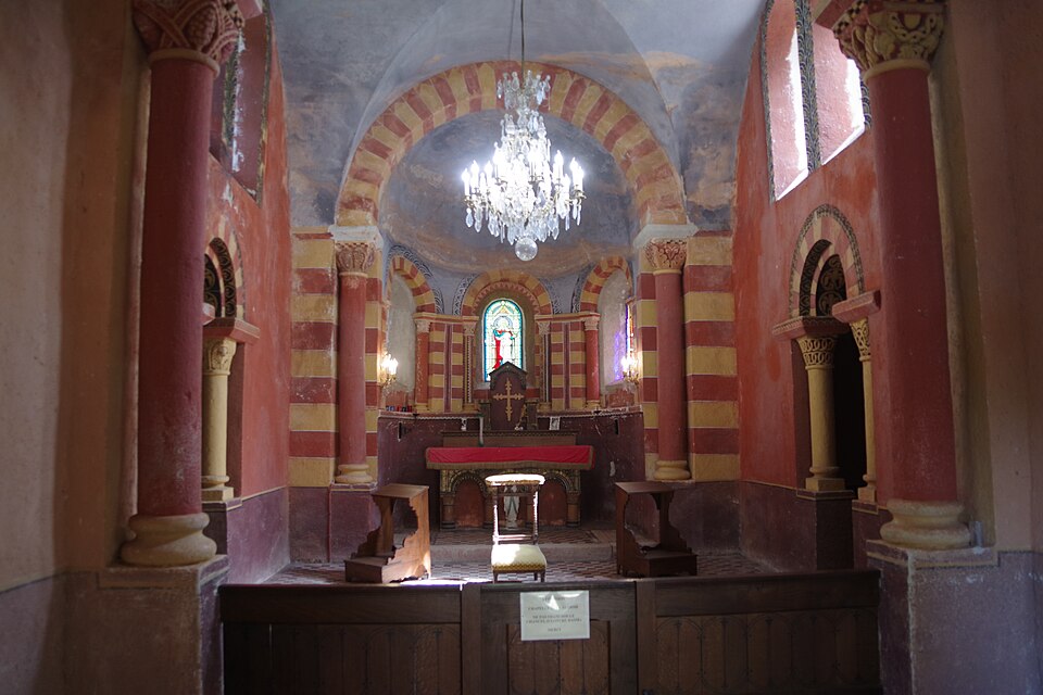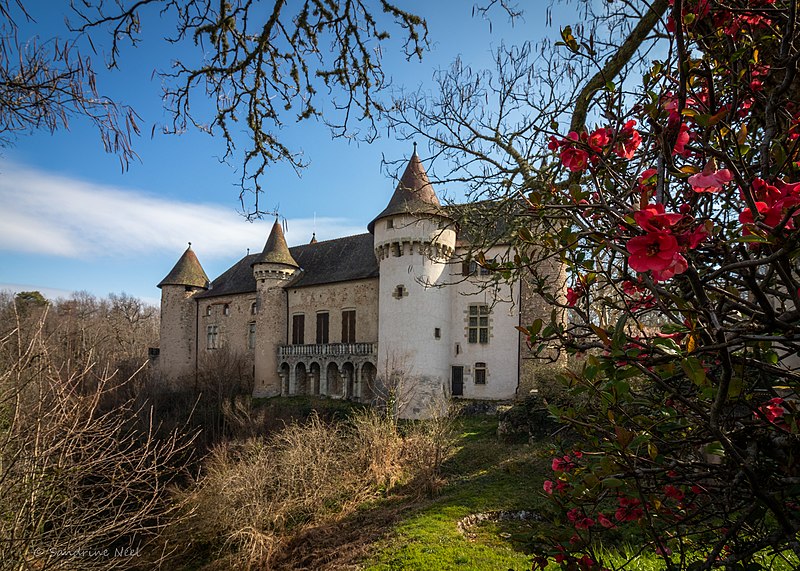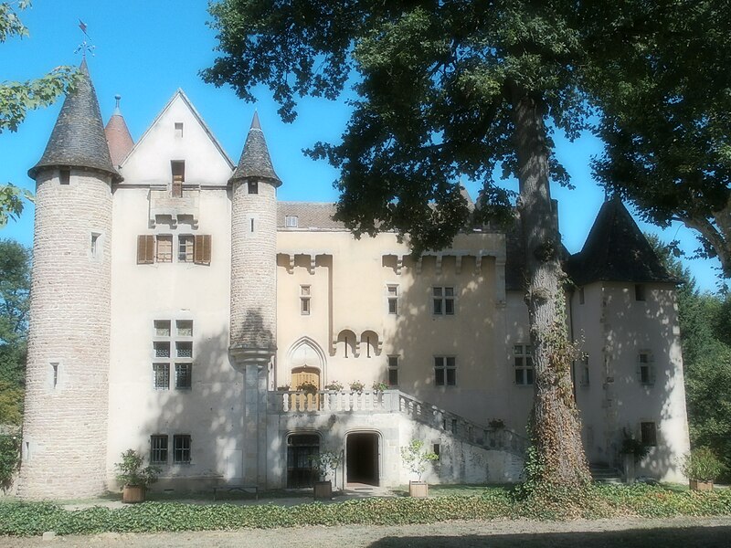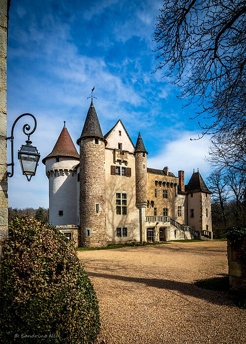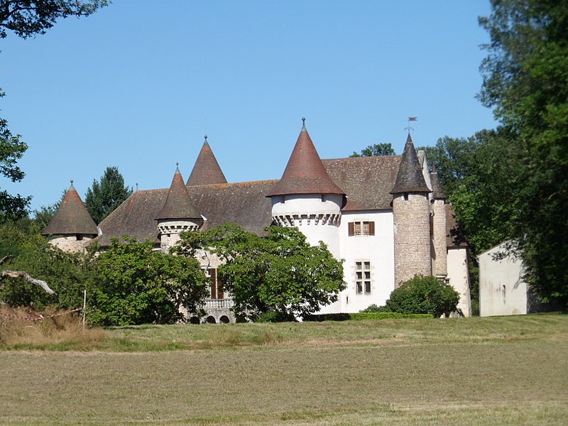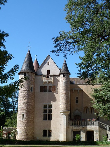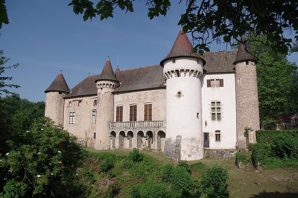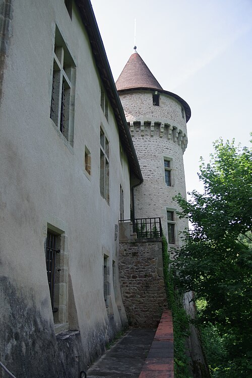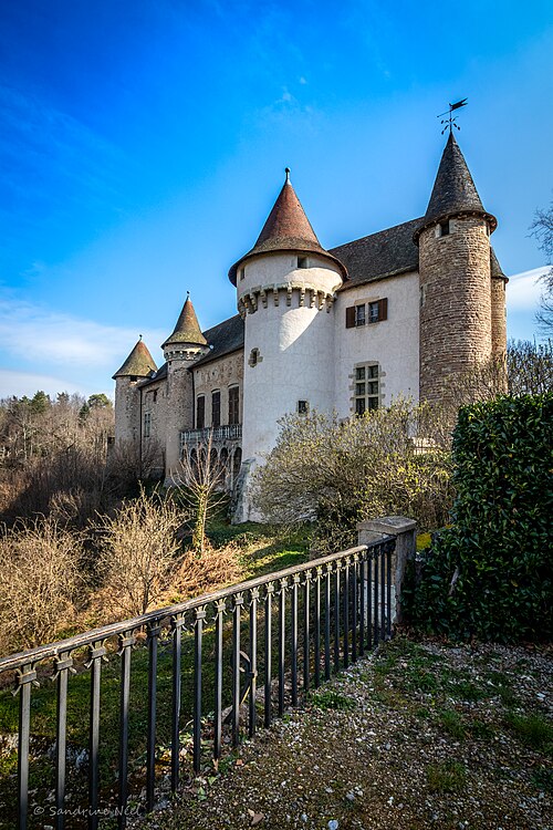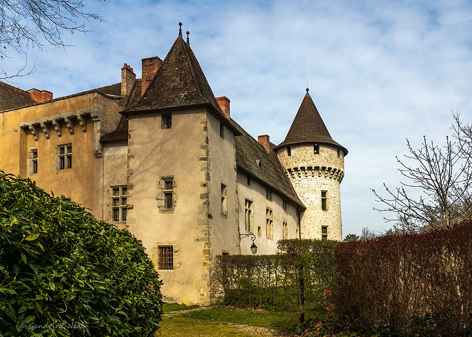 L'architecture actuelle porte la marque des transformations du XIXe siècle : la façade sud, asymétrique, présente un corps central de deux étages couronné de mâchicoulis et d'une bretèche, et des fenêtres à meneaux et traverses. L'escalier d'honneur, à balustrade en grès gris, relie une tour carrée à un pavillon décoré d'une tourelle et d'une poivrière en pierre rose ; un arc brisé médiéval réemployé sert d'entrée de famille au premier étage, tandis qu'une porte à arc déprimé sous le perron mène à la cour intérieure et aux cuisines. La façade ouest s'ouvre par de grandes fenêtres sur un balcon à consoles de granit desservant la grande salle seigneuriale, et les élévations sur le ravin, élevées sur deux étages, sont rythmées par des fenêtres à meneaux et traverses. Devant le château se dresse une petite chapelle néo-romane, d'inspiration romane auvergnate, au plan simple avec une abside et deux absidioles ; sa polychromie brique et pierre et ses modillons anthropomorphes participent à sa décoration.