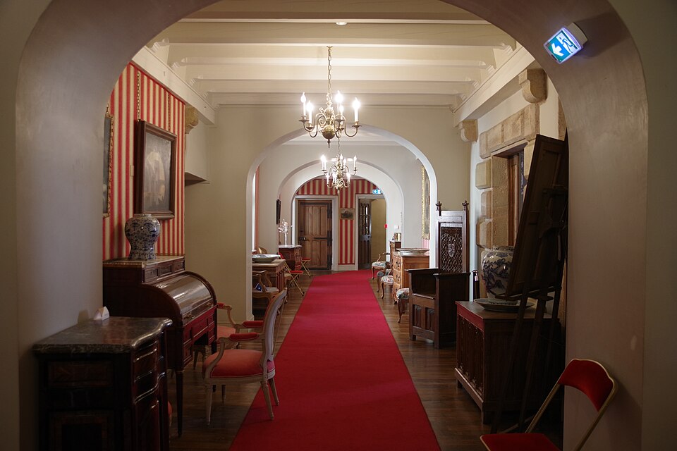 La collection mobilier et d'objets d'art du château couvre une chronologie du XVe au XIXe siècle et restitue, de salle en salle, l'esprit d'une demeure de collectionneurs du début du XXe siècle. Au rez-de-chaussée, une salle basse expose du mobilier breton et une tapisserie, et les anciennes cuisines, aujourd'hui accueil et boutique, conservent des fourneaux du XIXe siècle. La grande galerie, qui traverse le château selon un axe nord-sud, dessert à l'ouest le salon vert, le grand salon, le petit salon bleu et la chambre d'été, et à l'est la chambre de l'oncle René, la chambre bleue, la chambre longue, le petit salon rouge, le salon jaune et la chambre du marquis. Outre du mobilier d'époque, la galerie abrite des œuvres remarquables, parmi lesquelles le Portrait du Cardinal de Richelieu par Philippe de Champaigne (1633), un portrait du comte de Toulouse par l'atelier de Hyacinthe Rigaud, un portrait du Grand Dauphin par Jean-Baptiste Martin, une Carmélite en extase de Michel Corneille et un paysage flamand de Tobias Verhaecht.