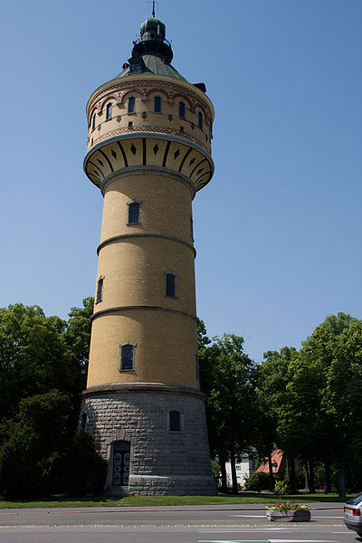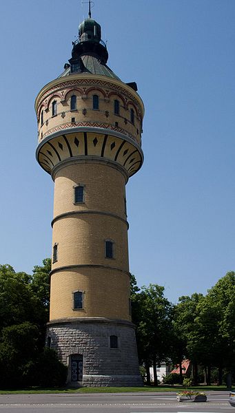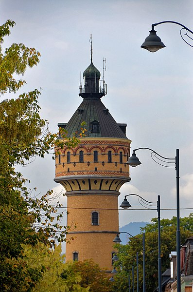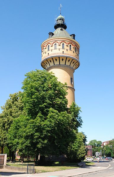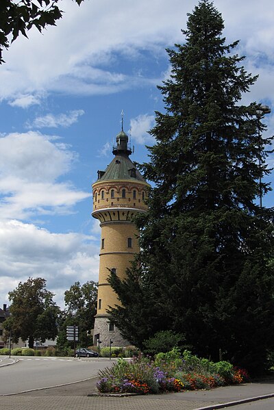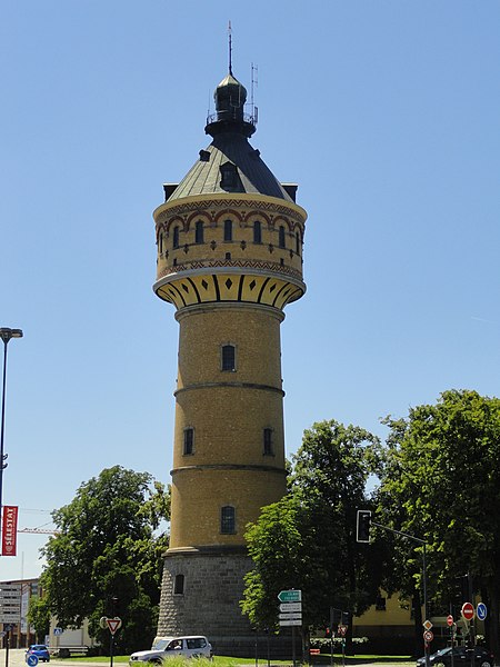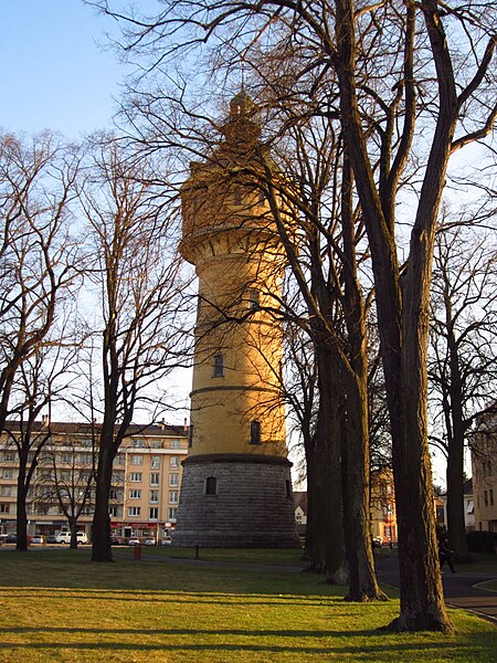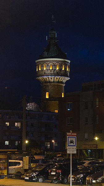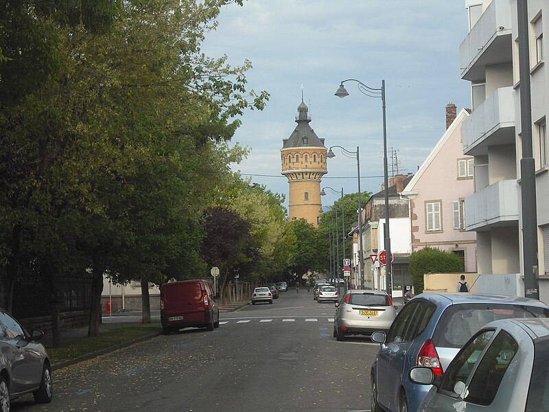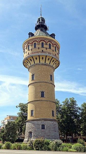 Le château d'eau de Sélestat, situé sur l'axe nord-sud de la place du Général-de-Gaulle, est une tour d'apparence de beffroi dont la hauteur est indiquée entre 48 et 50 mètres et dont la cuve a une capacité de 500 m3. Décidé en 1905, l'ouvrage a été élevé en 1906 et mis en service en 1907 ; les plans ont été dressés par l'ingénieur Behr, du service régional des eaux, sous la supervision de l'inspecteur Peitavy. Construit d'après le modèle d'un château d'eau de Deventer (Pays-Bas, 1893), il est réalisé en maçonnerie et porte une cuve en tôle rivetée. Son architecture s'inspire du style néo-roman : la tour est revêtue de briques jaunes, la cuve est entourée d'une succession d'arcatures cintrées en briques rouges et l'ensemble est coiffé d'un toit conique. L'ouvrage a longtemps été équipé d'un paratonnerre surmonté, suivant l'histoire politique de la région, de l'aigle impérial de la maison de Hohenzollern de 1915 à 1918, puis du coq gaulois de 1918 à 1940. Le château d'eau a été classé monument historique le 2 juillet 1992. À l'occasion de son centenaire, le 16 septembre 2006, la ville a organisé un spectacle pyrotechnique de 25 minutes conçu par la société Molécule ; la création associait projections d'images animées, éclairage du monument et des abords, et un tir d'artifice synchronisé par ordinateur sur un programme musical autour du thème de l'eau. Pour ce spectacle, des projecteurs placés au sol et au sommet de la tour ont été commandés, des éclairages LED installés dans les ouvertures et un éclairage spécial coloré avec un phare tournant est resté en service pendant un mois.
