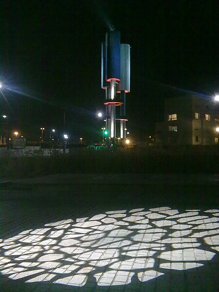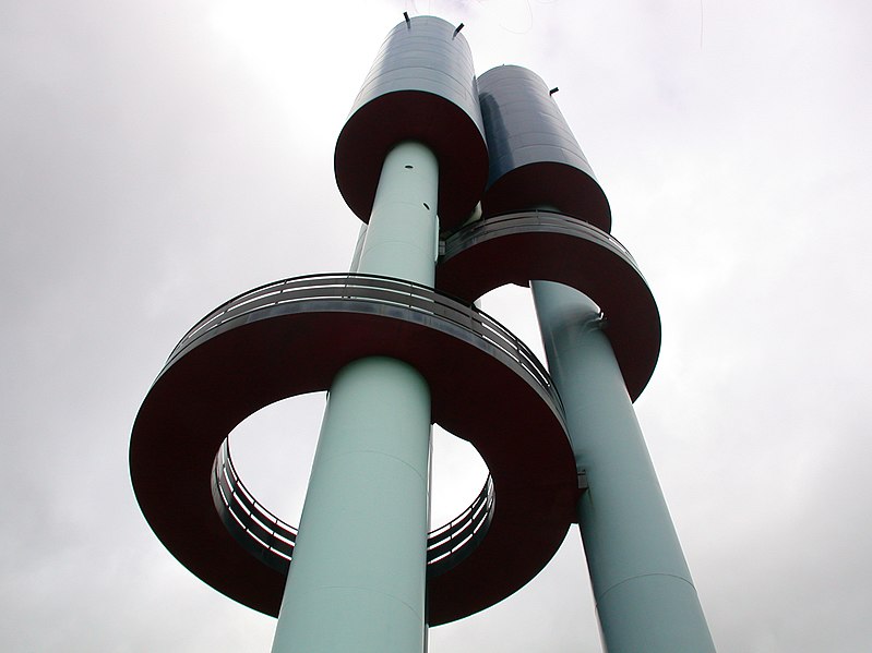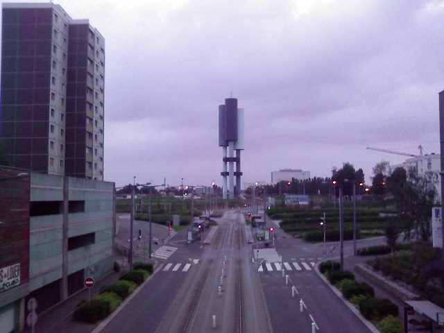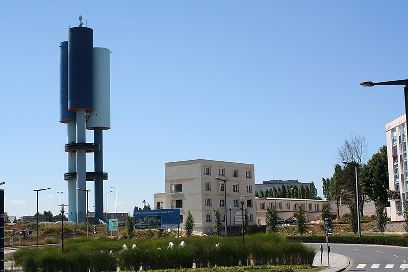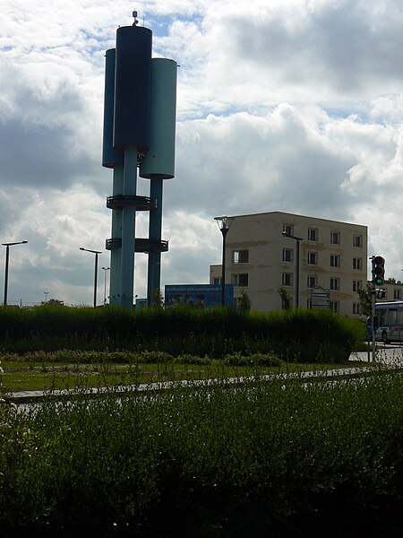 Le château d'eau métallique d'Hérouville-Saint-Clair, mis en service en 1968, constitue un signal urbain de la ville nouvelle d'Hérouville-Saint-Clair (Calvados, Normandie). L'édifice a reçu le label « Patrimoine du XXe siècle » en 2007 et a été inscrit au titre des monuments historiques par arrêté préfectoral le 10 août 2010. Les premières études furent confiées à Georges Johannet, architecte conseil de la ZUP, qui proposa dès l'origine un réservoir triple au dessin moderne. Lancée en 1963, la réalisation actuelle ne fut décidée que le 27 mars 1967, après un concours organisé en mai 1966. La société industrielle Delattre-Levivier remporta le marché ; l'ouvrage, testé en soufflerie, fut mis en chantier en juin suivant, la première mise en eau ayant lieu en mai 1968 et la mise en service en juin. Depuis 2003 l'édifice est éclairé par la société Citéval. Le château d'eau a inspiré le logo communal dès 1971 et a été repris dans la communication municipale à partir de 2004 avec l'aide du dessinateur Emmanuel Chaunu. L'alimentation en eau de la commune repose sur trois ouvrages : un réservoir enterré de 500 m3 avenue de la Valeuse, le château d'eau sphérique de 3 000 m3 mis en service en 1981, et le réservoir métallique destiné surtout à desservir la ZUP. Placé dans l'alignement de l'avenue de la Grande Cavée, axe central est-ouest de la ville nouvelle, le château d'eau métallique mesure 52 m de hauteur et pèse 236 tonnes. Il est formé de trois cuves d'acier de 500 m3 chacune, chaque cuve mesurant 21 m de hauteur pour 6,50 m de diamètre. Les réservoirs reposent sur trois piliers de 2,3 m de diamètre, dont l'un abrite un escalier en colimaçon ; deux passerelles situées à 14 et 21 mètres entourent l'ensemble, prévues à l'origine pour la retransmission télévisuelle d'événements du stade Prestavoine. Sous la direction de Johannet, les cuves furent peintes en trois nuances de bleu — ciel, myosotis et roi — tandis que les piliers reçurent des gris ; la partie inférieure des passerelles et des réservoirs est peinte en rouge et les garde-corps en noir. La bibliographie citée comporte notamment l'ouvrage de Lucien Geindre Il était une fois... Hérouville-Saint-Clair (1988), le parcours du patrimoine Hérouville-Saint-Clair laboratoire d'architecture (septembre 2010, ISBN 9782362190049) et le numéro 44 de Hérouville en clair (novembre-décembre 2010). Des photographies et informations complémentaires sont consultables sur des sites tels que Structurae et Ouest-France, et des ressources médiatiques figurent sur Wikimedia Commons.