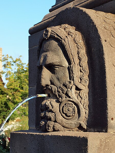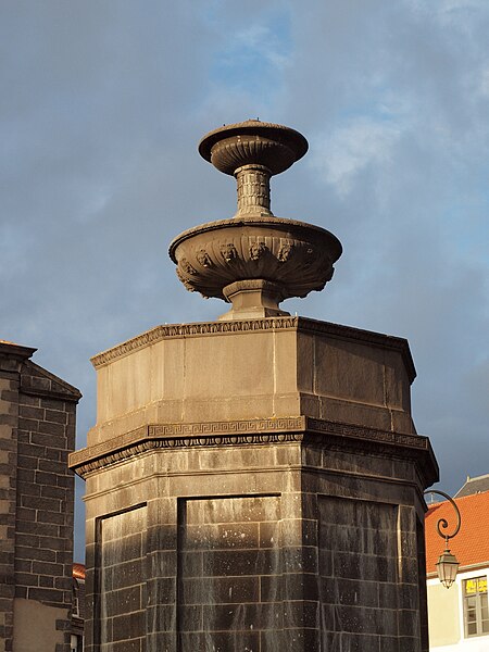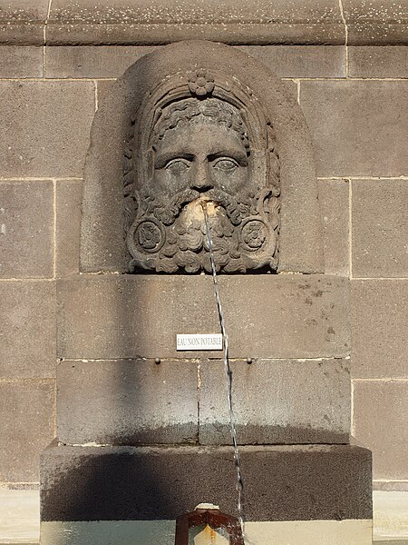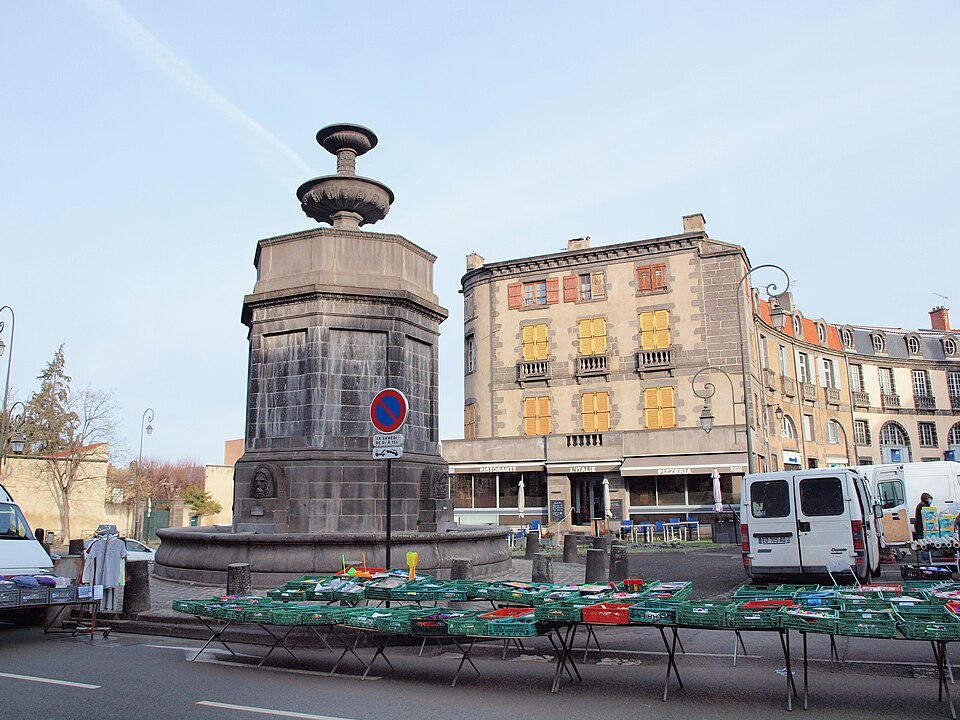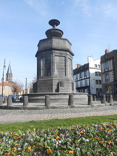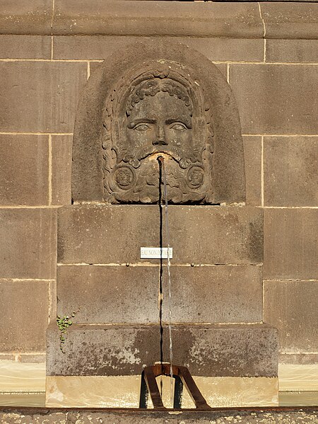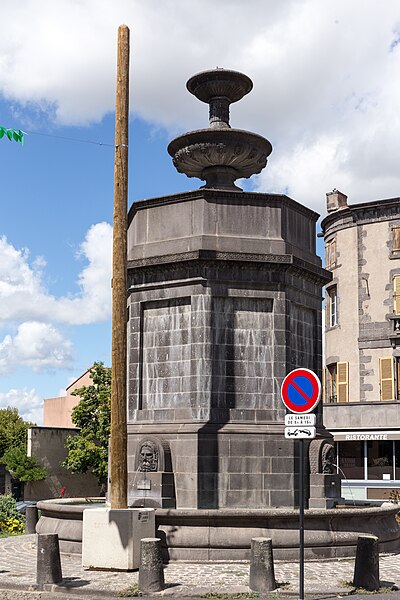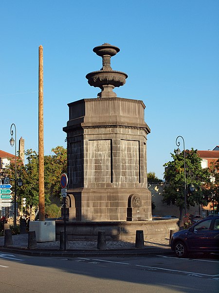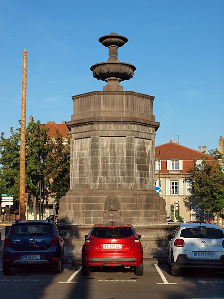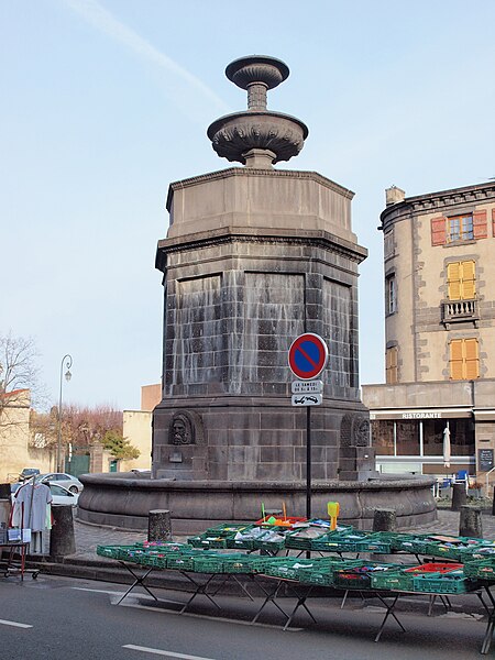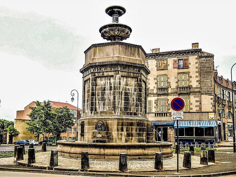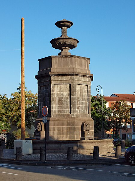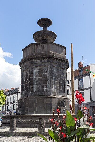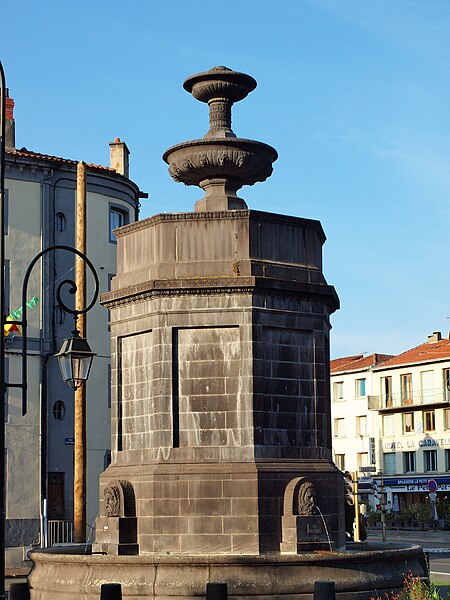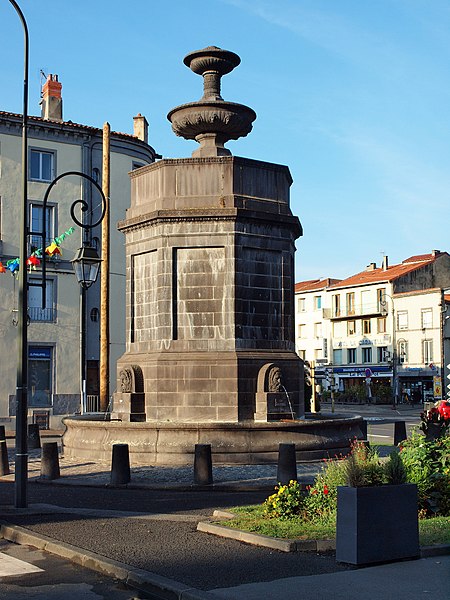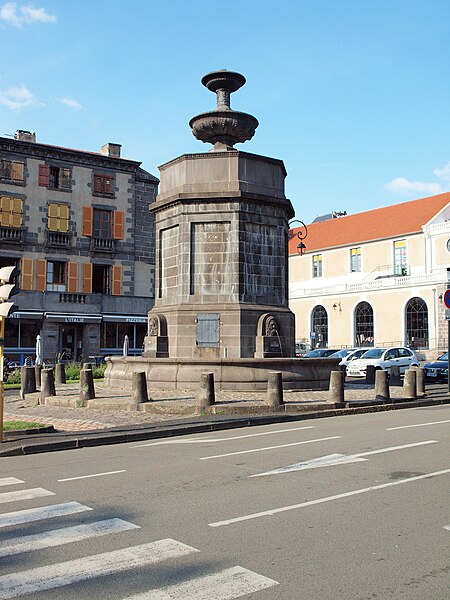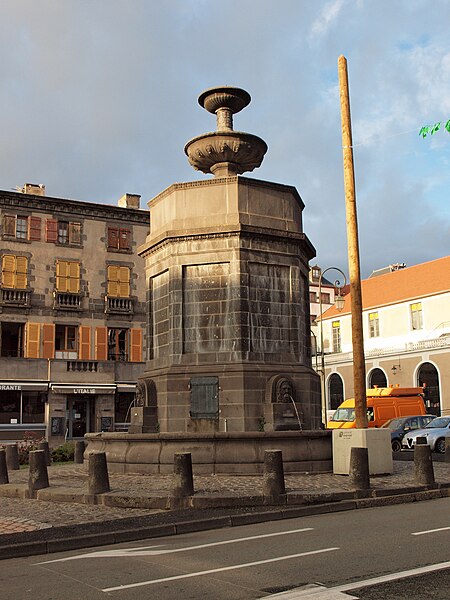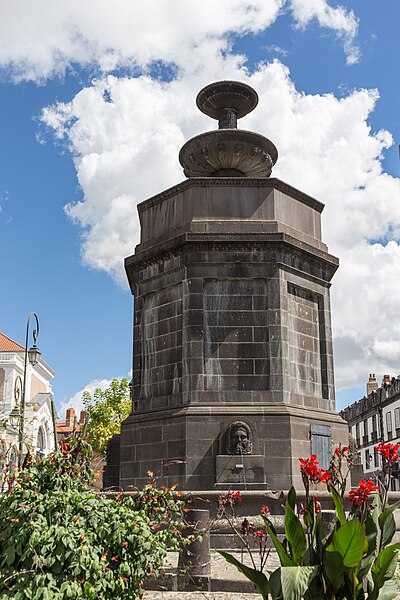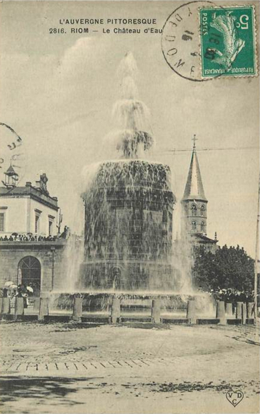 Le Château d'eau est une fontaine située place de la Fédération à Riom, anciennement place du Marché Neuf, à l'arrivée des eaux de la source du Goulot en provenance de Volvic. Réalisée entre 1830 et 1837, elle remplace l'ancien château d'eau appelé « fontaine des Lignes » et fut édifiée à l'emplacement d'une croix renversée en 1830. Le maître d'œuvre est l'architecte Guillaume-Thérèse-Antoine Degeorge (1787-1868), élève de Charles Percier. L'ouvrage, de plan octogonal, s'élève au centre d'un bassin circulaire et est entièrement taillé en pierre grise de trachy-andésite, dite pierre de Volvic. Le réservoir se compose de trois registres : la base renflée porte quatre mascarons de pierre représentant des têtes d'hommes barbus dont les eaux se déversent dans le grand bassin; la partie médiane offre des tables évidées et des niches prévues pour accueillir huit statues de « grands hommes » ayant illustré le département; ces tables sont couronnées d'une frise saillante de grecques. Les statues projetées devaient représenter Michel de L'Hospital, Jacques Delille, Guillaume-Michel Chabrol, Louis Desaix, Antoine Arnauld, Jean Domat, Blaise Pascal et Antoine Léonard Thomas, mais elles n'ont jamais été placées. Au-dessus, un petit bassin octogonal reçoit l'eau de deux vasques circulaires superposées dont la plus haute envoie un jet puissant; l'eau du petit bassin déborde ensuite dans le grand bassin, formant une succession de chutes vives et sonores. L'œuvre de Degeorge est restée inachevée et la fontaine conserve aujourd'hui l'absence des statues prévues. Les quatre mascarons coulent en permanence, tandis que l'ensemble de la fontaine fonctionne en intégralité seulement deux fois par an, le jour de la Saint-Amable et le 14 juillet. La fontaine du Château d'eau, fidèle au projet de Degeorge malgré son inachèvement, est inscrite aux monuments historiques depuis 1989 et figure parmi les sept fontaines de la ville classées ou inscrites. Elle rappelle la plus ancienne fontaine Ballainvilliers (1764) située sur la même place.