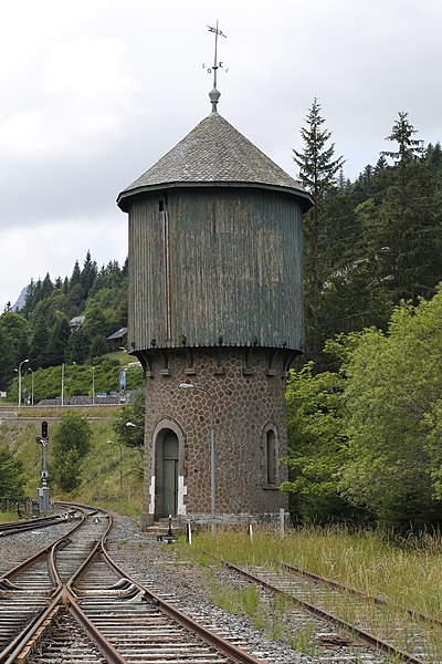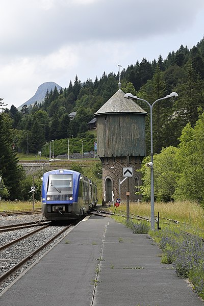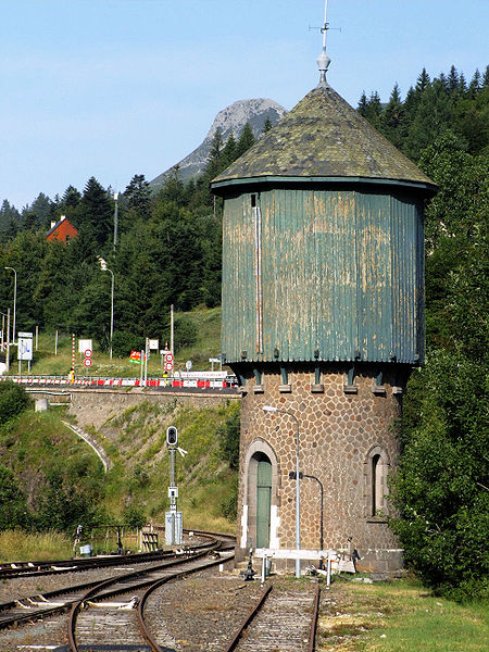 Le château d'eau du Lioran, situé à la gare du Lioran dans la commune de Laveissière (Cantal), est un réservoir ferroviaire destiné à l'approvisionnement des locomotives à vapeur. L'ouvrage repose sur une tour cylindrique dont la base maçonnée est revêtue d'un appareil en opus incertum et percée de baies néo-romanes. Sa superstructure en surplomb est protégée par un bardage de planches qui abrite une cuve métallique à fond sphérique d'une capacité de 100 m3, alimentée par tuyauterie. L'accès au réservoir se fait par des échelles intérieure et extérieure. Ce réservoir correspond à un modèle type reproduit à plusieurs exemplaires sur la ligne Figeac–Arvant ; après l'abandon de la vapeur, ces réservoirs ont été désaffectés. Le château d'eau du Lioran est le dernier exemplaire de cette série subsistant intact après la disparition de ceux de Murat, de Saint-Jacques-des-Blats et de Vic‑sur‑Cère. Le dossier comporte des indications différentes concernant sa datation et son attribution : il est indiqué qu'il a été réalisé entre 1898 et 1903 selon le modèle type, tandis que d'autres notices évoquent une conception par l'ingénieur Wilhelm Nördling et une construction en 1867. L'ouvrage a fait l'objet d'une restauration en 1983 et il est inscrit au titre des monuments historiques par arrêté du 7 octobre 1991. Pour compléter l'information, on peut consulter la liste des monuments historiques du Cantal, la documentation relative à la ligne de Figeac à Arvant, ainsi que des ressources d'architecture et de patrimoine telles que Mérimée, Structurae et les portails consacrés au Cantal, aux monuments historiques, au chemin de fer et à l'eau.