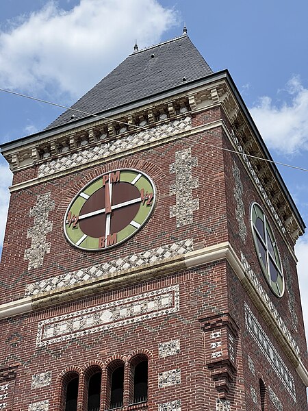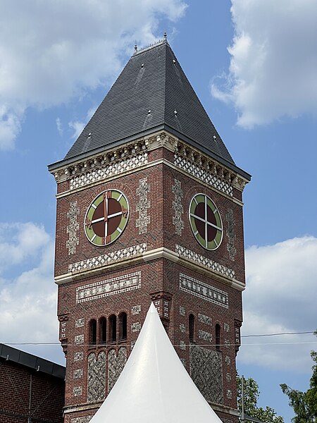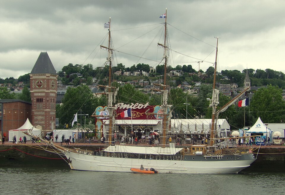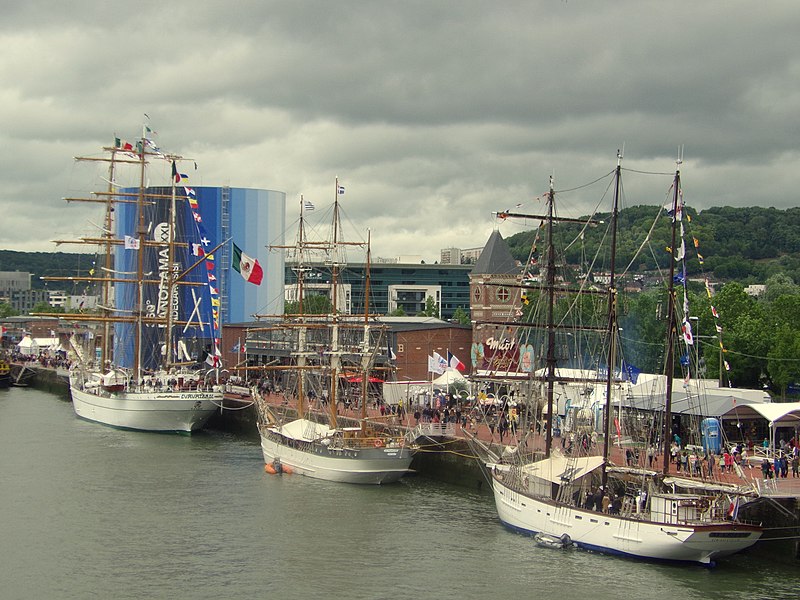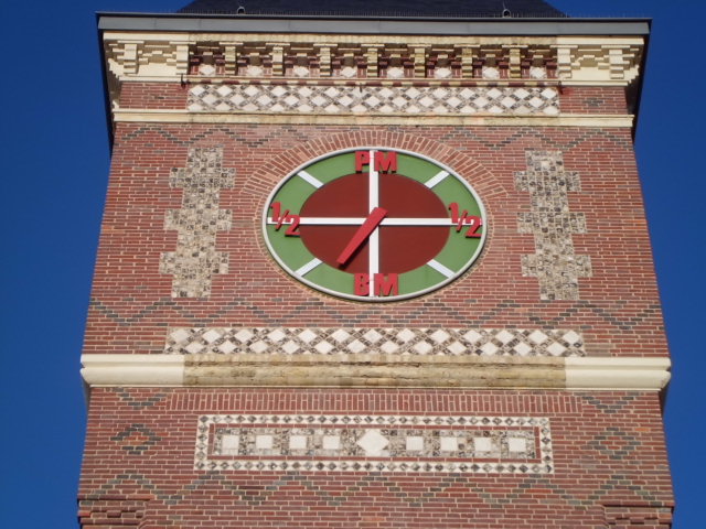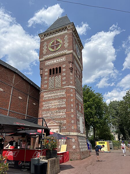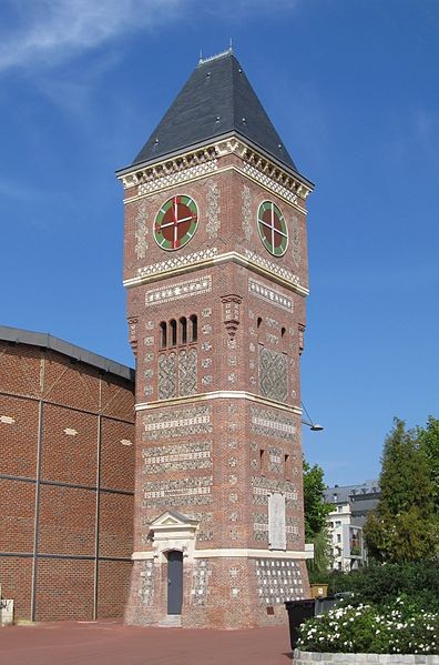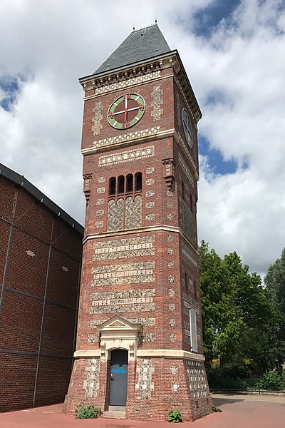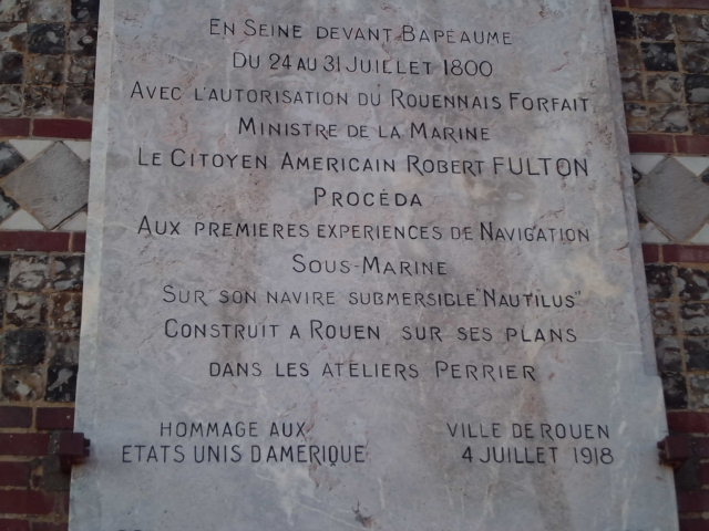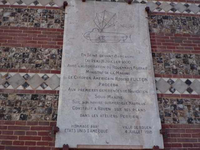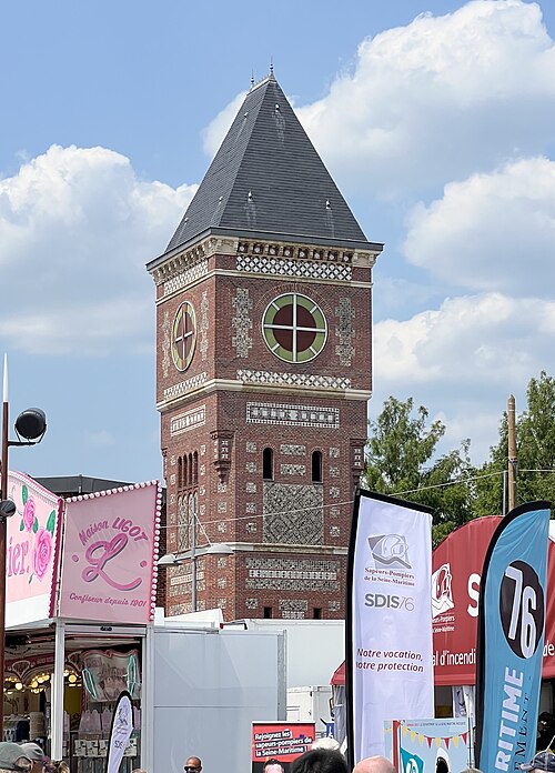 Situé sur la rive droite de la Seine, quai de Boisguilbert à Rouen, cet ensemble associe un château d'eau dit marégraphe et deux hangars portuaires, près du pont Guillaume‑le‑Conquérant. La tour, construite en 1885 par l'architecte Lucien Lefort, est le premier exemplaire de ce type réalisé par lui à Rouen. Édifiée en brique industrielle avec décors en silex et calcaire, elle est coiffée d'une toiture pyramidale et présente une ornementation riche caractéristique de l'éclectisme régional, mêlant influences troubadour et néo‑classiques. Les façades et les toitures ont été inscrites au titre des monuments historiques en 1997 et l'édifice a fait l'objet d'une restauration complète en 2009 ; à l'intérieur, aucun élément de machinerie ne subsiste. Initialement conçu pour fournir l'énergie hydraulique aux nouvelles grues du port, le bâtiment n'a reçu son horloge et son marégraphe qu'en 1893. Le cadran visible sur la face sud, divisé en quatre par des lignes blanches, porte les mentions PM et BM pour pleine mer et basse mer, des repères 1/2 pour la demi‑marée, et une aiguille rouge tournant dans le sens horaire. Le remplissage du réservoir était assuré d'abord par une machine à vapeur ; un couvercle de fonte flottant au sommet permettait la redistribution de l'eau à la demande vers les grues. L'eau était ainsi accumulée et comprimée jusqu'à 53 atmosphères grâce à un cylindre en fonte de 60 tonnes guidé par deux rails internes. Le hangar n°3, modèle rive droite daté 1884‑85, a été reconstruit vers 1900 sous la forme d'un bâtiment à claire‑voie ; sa structure métallique en poutrelles et grilles a été modifiée sans doute avant 1914, l'auvent côté Seine ayant été arasé et un remplissage en brique sud venant fermer la construction. Le hangar n°2, quant à lui, a été édifié après 1918 et présente une structure métallique avec remplissage de brique. Une plaque commémorative apposée en 1918 rappelle Robert Fulton, ses premières expériences en 1800 à Bapeaume avec le Nautilus — construit aux chantiers Perrier de Rouen — et témoigne d'un remerciement aux États‑Unis pour leur participation au premier conflit mondial.