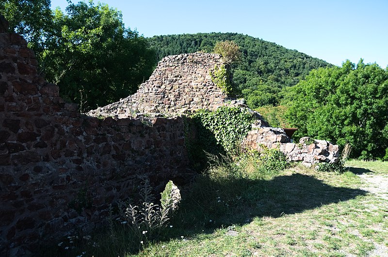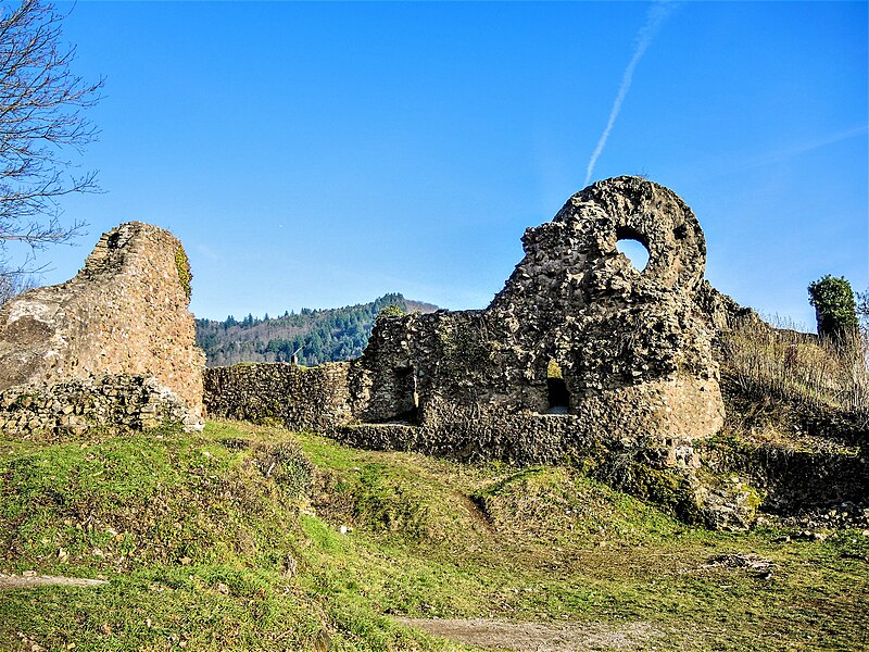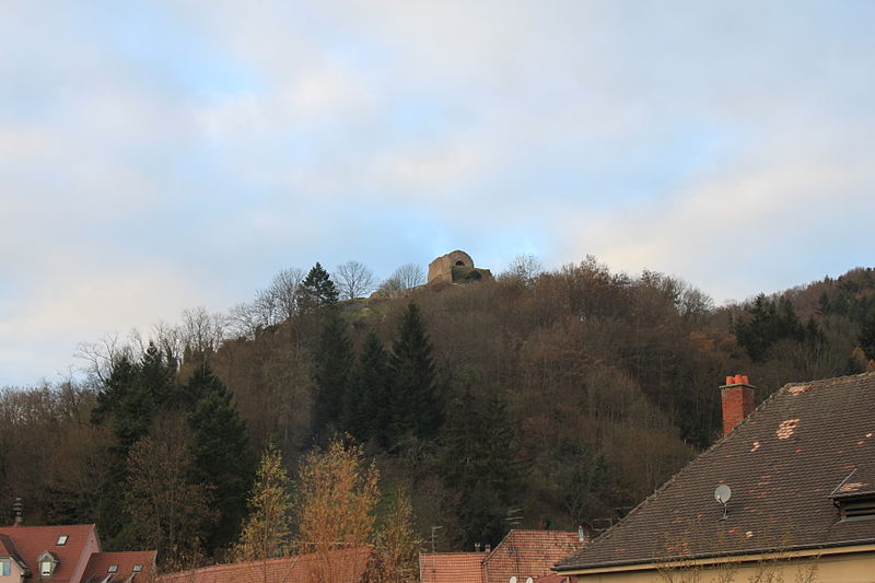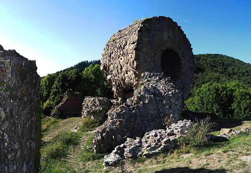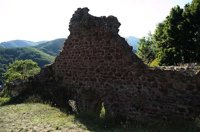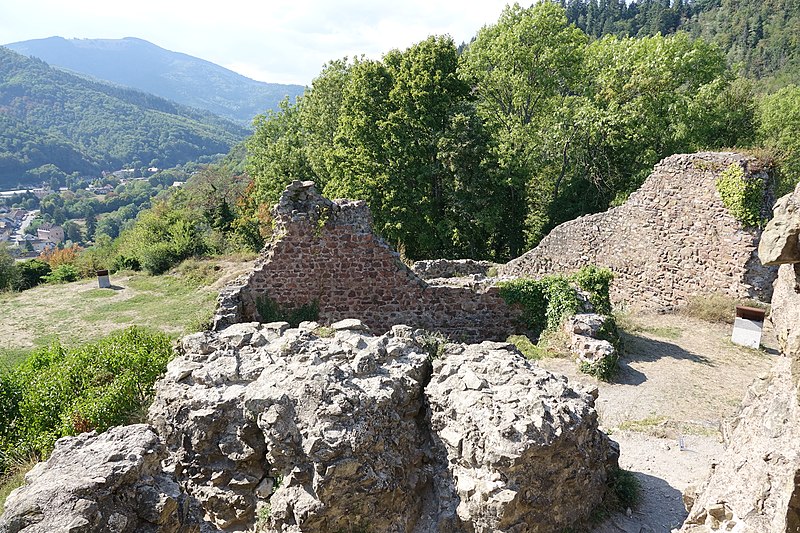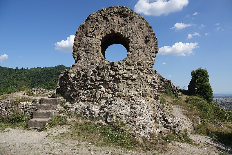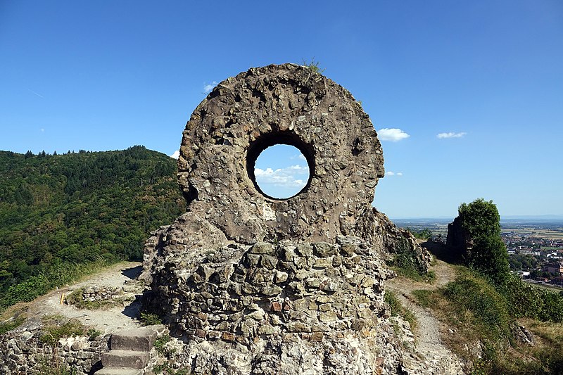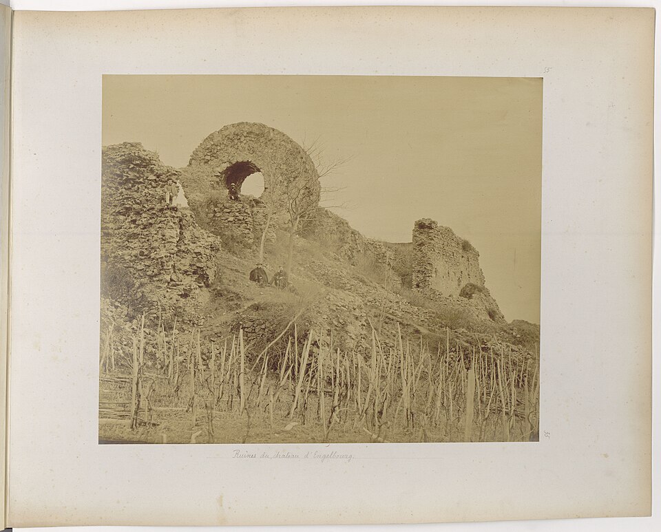 Les ruines du château d'Engelbourg, situées sur le site dit de l'Engelbourg à Thann (Haut-Rhin), étaient destinées à protéger le péage de l'entrée de la vallée de la Thur et furent élevées par les comtes de Ferrette. Des indices architecturaux, comme une chaîne d'angle en grès à bossage, suggèrent une existence dès la fin du XIIe siècle ; le château paraît avoir été reconstruit après 1220 et avant 1234, puis transformé lorsqu'il devint lieu de résidence des comtes. La chapelle dédiée à sainte Catherine est mentionnée en 1304 et des travaux importants ont encore eu lieu à la fin du XVIe siècle. Après le rattachement de l'Alsace à la France, l'édifice perdit son intérêt stratégique et son démantèlement fut ordonné en février 1673 par Louis XIV ; l'intendant Mathias Poncet de la Rivière confia l'exécution à des mineurs de Giromagny. Lors des travaux, la grosse tour du donjon se souleva et se brisa en plusieurs parties, dont une retombée forma la célèbre ouverture surnommée « l'Œil de la Sorcière », nom que lui donnent encore les habitants. Les ruines, qui ont inspiré plusieurs gravures romantiques au XIXe siècle, ne subsistent aujourd'hui que comme vestiges de la forteresse. Classifiedes monuments historiques depuis 1898, elles font l'objet d'interventions contemporaines : depuis 2006, des jeunes bénévoles de l'association Études et Chantiers Grand Est effectuent des chantiers de restauration et de consolidation. Entre 2006 et 2012, des sections de murs et un dispositif défensif contre l'artillerie ont été dégagés et consolidés, et un relevé détaillé a permis une reconstitution informatique en 3D du site.