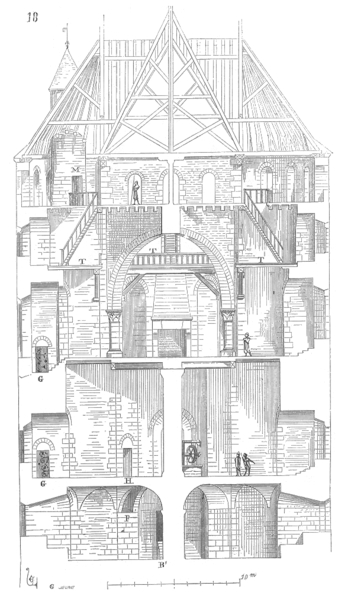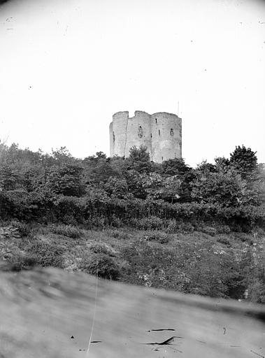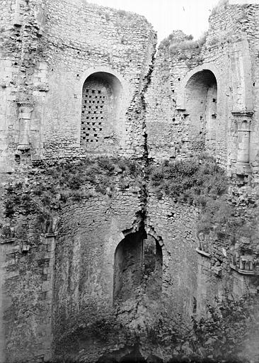 L'accès au donjon se faisait par une poterne au sud ouvrant sur un vestibule qui dominait un trou de défense de 4 m de profondeur destiné à piéger les assaillants ; cet espace était desservi par un escalier courant dans l'épaisseur de la muraille. En sous-sol, une salle de 10 m de diamètre comportait un puits et des latrines, ses murs épais de 5 m percés de trois meurtrières ; le premier étage accueillait une salle de garde de 10 m de diamètre, également dotée de latrines et d'un accès au puits. L'étage suivant s'atteignait par un escalier à vis et s'ouvrait sur une galerie éclairée avant une salle d'apparat de 12 m de diamètre, pourvue d'alcôves, de cheminées, d'un évier et de latrines, et couverte par une voûte d'arêtes haute de 10 m soutenue par quatre colonnes et des arcs-doubleaux. Au sommet, un comble accessible par un dernier escalier à vis offrait quatre tribunes en bois sous la toiture, percée de cheminées et ponctuée de deux élévations circulaires au-dessus des lobes nord et sud.