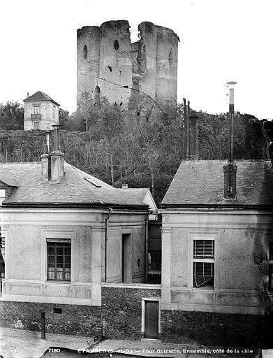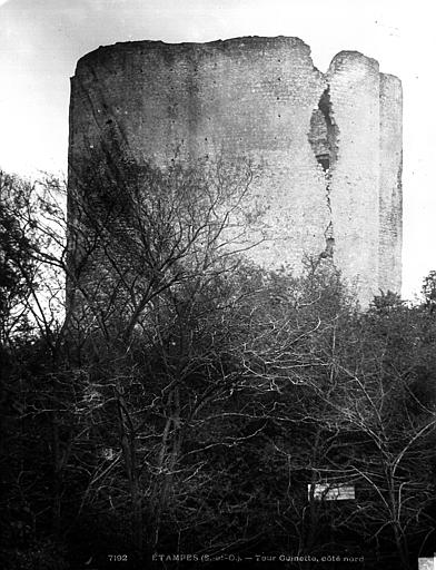 Le château royal d'Étampes, construit au Moyen Âge, ne subsiste aujourd'hui que par son donjon, appelé tour de Guinette. Les attributions de sa construction au XIIe siècle varient selon les sources : certains auteurs l'imputent à Louis VI, d'autres à Louis VII. Une voûte d'ogives y a été ajoutée à la fin du XIIe siècle et la chapelle Saint-Laurent est attestée en 1185. Le site occupe le rebord du plateau de Guinette, au nord-ouest d'Étampes, à environ 100 m d'altitude, et domine les vallées de la Louette, de la Chalouette et de la Juine ; il contrôlait la route Paris-Orléans. L'étude géologique de Hureau de Senarmont décrit une succession de couches comprenant sable, moellon, glaise bleue, calcaire argileux, grès et marne.