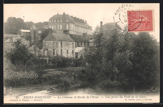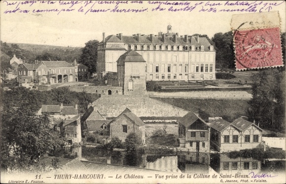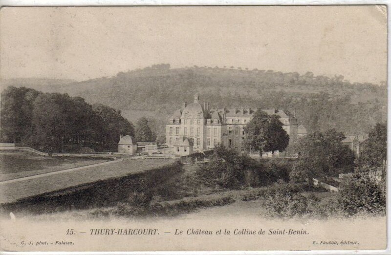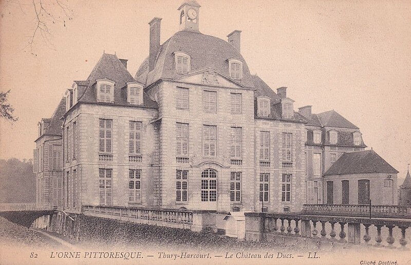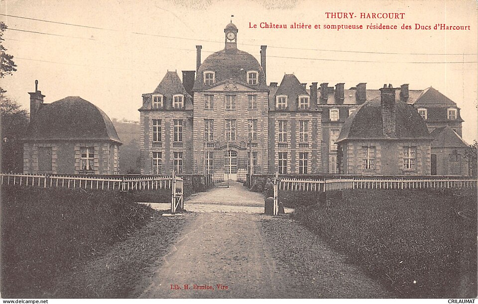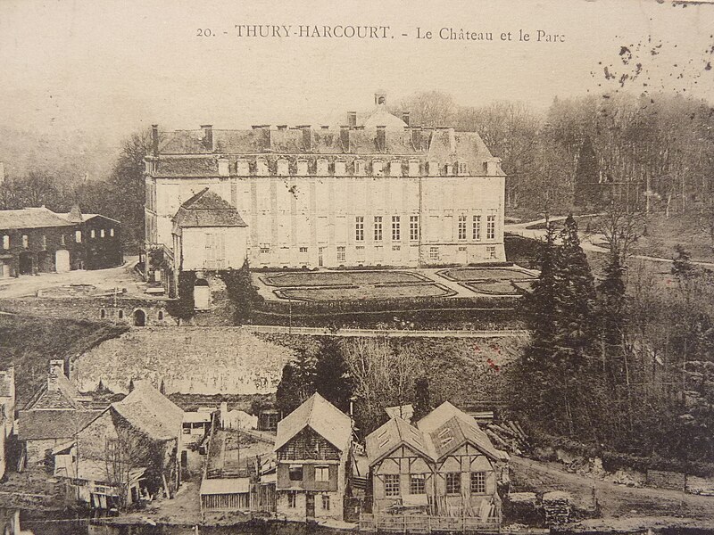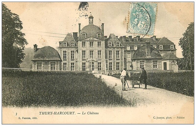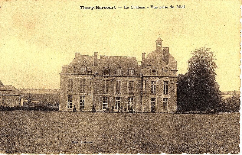 La seigneurie de Thury possédait dès le Moyen Âge un château et a successivement appartenu aux familles Tesson (Heytesson), Préaux et Montmorency, avant d'être érigée en marquisat en 1578 en faveur de Pierre Ier de Montmorency‑Fosseux. En 1635 Odet d'Harcourt acquiert le marquisat et fait édifier la partie la plus ancienne du château, constituée d'une façade d'arrivée prolongée par une aile en retour. Au début du XVIIIe siècle Henri d'Harcourt, devenu duc et maréchal de France, fait agrandir le logis en prolongeant l'aile proche de l'Orne par un long corps de bâtiment couvert d'un toit mansardé; la chapelle était alors adossée à ce corps de logis. Les travaux commencés par Henri d'Harcourt, interrompus par sa mort en 1718, sont achevés par sa veuve, Marie Anne Claude Brulart de Genlis, qui y installe ses appartements. Le duché d'Harcourt resta dans la descendance jusqu'au XIXe siècle; François‑Henri d'Harcourt, cinquième duc, émigre à la Révolution, son domaine est saisi, puis repris par ses petits‑enfants dans les premières années du XIXe siècle. En 1856 le château est vendu à Eugène, huitième duc d'Harcourt, dont la famille en conserve la propriété par la suite. Le 21‑22 juin 1786 le roi Louis XVI et sa suite firent étape au château en route pour Cherbourg.