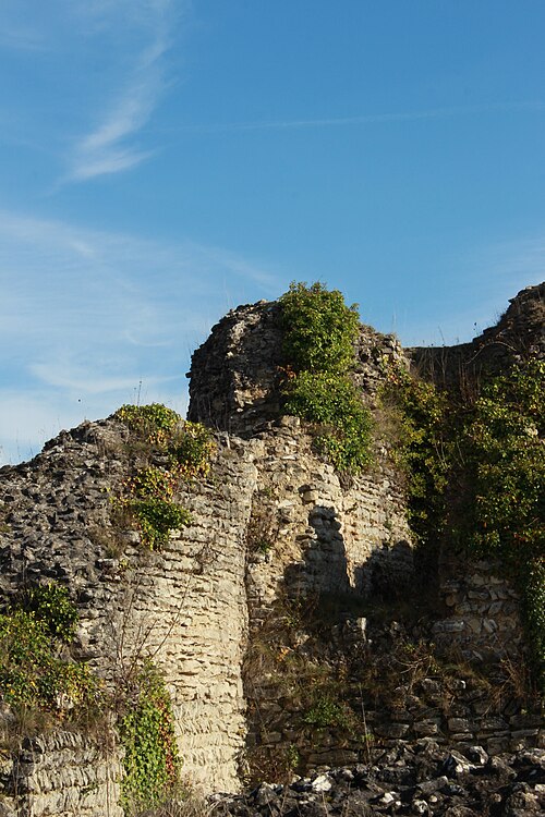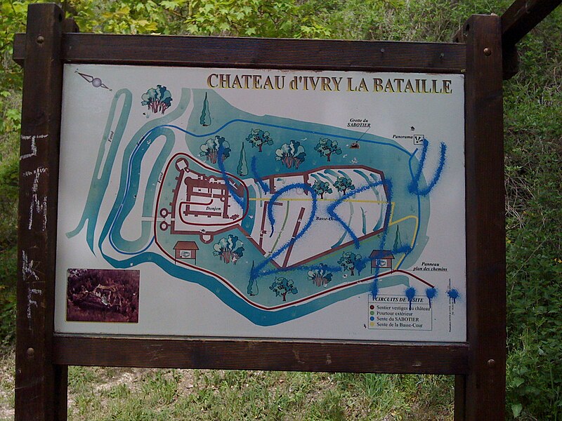 Le château d'Ivry-la-Bataille est un ancien château fort de la fin du Xe siècle, aujourd'hui en ruines et détruit en 1424. Ses vestiges se dressent sur la commune d'Ivry-la-Bataille, dans le sud-est de l'Eure en Normandie, et sont classés au titre des monuments historiques. Implanté sur un promontoire dominant la vallée de l'Eure et le bourg d'environ 70 mètres, il constituait un point de contrôle visuel et défendait le pont qui franchit la rivière. Située au carrefour de la Normandie et de l'Île-de-France, la place contrôlait les frontières sud-orientales du duché de Normandie, enjeu stratégique entre les couronnes de France et d'Angleterre. Le site pourrait avoir été occupé dès l'époque antique en relation avec une voie reliant Évreux à Paris, hypothèse non confirmée par l'archéologie. À la fin du Xe siècle, Richard Ier de Normandie confia la place à Raoul d'Ivry, qui fit construire une importante structure castrale en maçonnerie autour de l'an mille à l'emplacement d'une aula carolingienne. Selon les sources médiévales, Aubrée (Alberède) aurait commandé l'élévation d'une tour fameuse à un architecte nommé Lanfred, et le donjon élevé vers l'an mille figure parmi les premières fortifications de pierre en Normandie. Au XIe siècle, le château connut plusieurs mutations liées aux rivalités ducales : Hugues d'Ivry s'y révolta, le duc récupéra la place et des travaux importants furent entrepris, certains attribués à Alberède et cités par Guillaume de Jumièges. Le titre de comte d'Ivry disparut au milieu du XIe siècle et le château passa sous contrôle ducal, avec des mentions de Roger de Beaumont et d'autres seigneurs dans les sources. Des cessions et échanges de seigneurie sont attestés vers la fin du XIe siècle, provoquant des tensions entre grands barons. Le château fut incendié par Louis VI en 1119, remis entre les mains d'Henri II en 1177, puis pris par Philippe Auguste en 1194 et rattaché au domaine royal après le traité d'Issoudun. Pendant la guerre de Cent Ans, la forteresse capitula aux Anglais en 1419 après un siège et fut reprise par les Français à l'été 1423, qui l'utilisèrent pour des coups de main contre Évreux. Les Anglais assiégèrent de nouveau la place en juin 1424 sous le duc de Bedford ; la forteresse capitula début juillet et leur restitution vint mi-août, après quoi ils détruisirent les parties supérieures faute de pouvoir y maintenir une garnison. Après cette démolition, le château perdit toute valeur stratégique et n'apparut plus que dans des inventaires et aveux signalant son état de ruine aux XVe et XVIe siècles. La baronnie fut achetée par Diane de Poitiers en 1547, puis des évaluations du site aux XVIe et XVIIIe siècles constatèrent son arasement et la présence de quelques débris. Abandonnés et utilisés comme carrière, les vestiges furent comblés et l'emplacement finit par presque disparaître sous une colline boisée. En 1968 Robert Baudet et un club archéologique entreprirent le dégagement des substructures ; après vingt ans de travaux, le sol d'origine et les ruines réapparurent. Ces travaux conduisirent au classement des vestiges en 1990 et attirèrent l'intérêt de spécialistes comme Jean Mesqui, Edward Impey et Lucien Musset, qui publièrent des analyses sur les parties anciennes datées autour de l'an mille. De nouvelles fouilles menées de 2007 à 2010 et le réexamen des ruines ont permis d'éclairer l'histoire du château. Le site est défendu par trois fossés parallèles et un quatrième creusé dans le rocher sur le flanc ouest, formant une position en éperon barré renforcée ultérieurement par une enceinte flanquée. À l'est, la butte domine le bourg d'une cinquantaine de mètres, où se sont développés les habitats le long de l'Eure autour du pont contrôlé par la forteresse. La construction primitive, commencée vers 960, est une aula carolingienne rectangulaire de 32 × 25 mètres dont les murs de trois mètres d'épaisseur présentent un appareil en arête-de-poisson et des chaînages en briques. À la fin du Xe siècle, cette aula fut transformée en logis-donjon à contreforts, comprenant une chapelle dédiée à Saint-Ursin et une tourelle, édifice qui perdit ensuite son niveau inférieur du fait d'apports massifs de remblais. La tour d'Ivry, par sa physionomie, a été rapprochée par certains auteurs de celle de Londres et aurait, selon les interprétations, pu servir de modèle, tandis que Philippe Auguste fit raser et surélever une moitié de la tour après 1194 pour en faire un donjon à vocation défensive. Avant la prise par Henri V, le château fut encore aménagé avec un châtelet sur l'accès principal et probablement renforcé au XIVe siècle par une grosse tour dans l'angle nord-est. Aujourd'hui, du donjon carré élevé à la fin du XIe siècle ne subsiste que le premier niveau. Les parties apparentes et le sol des parcelles susceptibles de contenir des vestiges sont classés par arrêté du 8 février 1990. Propriété communale, le site a fait l'objet de fouilles importantes et est en accès libre toute l'année.