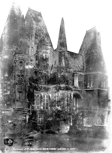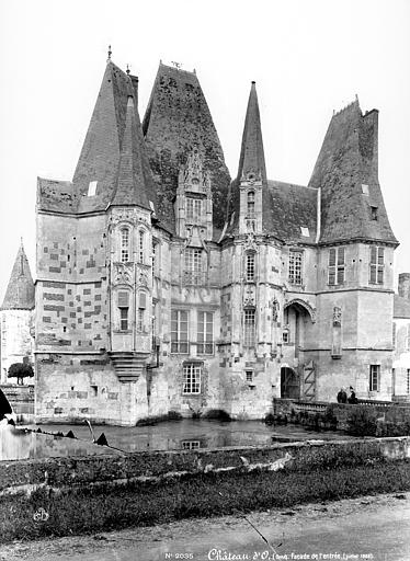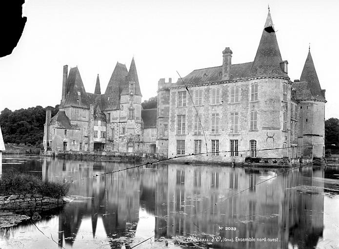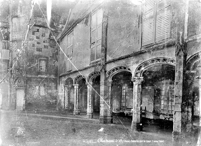 Le château d'Ô est une demeure édifiée sur une île au milieu d'un étang formé par la Thouanne, à un kilomètre au nord‑est de Mortrée dans l'Orne. Il a été élevé sur les ruines d'une première forteresse médiévale à la fin du XVe et au début du XVIe siècle et remanié aux XVIe et XVIIe siècles. La construction est attribuée à Jean d'Ô, capitaine de la garde écossaise de François Ier, et plusieurs membres de la famille d'Ô se sont succédé dans les travaux et l'embellissement du domaine. La seigneurie appartient à une très ancienne famille normande dont Robert d'Ô accompagna en 1035 le duc de Normandie lors d'un pèlerinage en Terre sainte. Parmi les acteurs des chantiers et propriétaires figurent notamment Robert VII d'Ô, Robert VIII, Jean Ier, Jean II, Charles II et François d'Ô, ce dernier remaniant le château au cours de la seconde moitié du XVIe siècle. Le domaine passa ensuite à Alexandre de La Guesle, érigé en marquis en 1616, fut acquis par Pierre de Montagu en 1648, appartint à la famille Rocques en 1795, puis fut vendu et morcelé en 1878. Une transformation de la façade principale est également signalée vers 1770. Plusieurs campagnes de protection et de restauration ont suivi : divers éléments ont reçu des protections au titre des monuments historiques à partir de 1964 et le château a fait l'objet d'une restauration entreprise en 1973 par Jacques et Yolande de Lacretelle. Bâti en partie sur pilotis, le corps de logis occupe trois côtés de l'étang et s'atteint par deux ponts ; l'entrée principale se situe dans l'aile est, la plus ancienne, qui conserve un aspect gothique, tandis que l'aile ouest, largement ouverte de fenêtres, est encadrée par deux tours en poivrière. L'enceinte rectangulaire renferme une cour d'honneur avec une tourelle polygonale servant d'escalier et une galerie à l'étage ; les arcades présentent des colonnes sculptées et un promenoir paraît appartenir à la première Renaissance. Le château comprend également un pavillon Renaissance, une orangerie édifiée par la famille Rocques et une chapelle du XIXe siècle ; le corps de logis, relié par une longue galerie à la façade d'arrivée de style gothique, abrite un salon décoré au XVIIIe siècle de peintures murales. Les jardins, ceints de murs, comportent des parterres de gazon, un potager et un verger ; le parc, clos par des murs et muni de portails et de grilles, est parcouru d'allées, traversé par une rivière et des canaux avec leurs ponts et comprend un moulin avec son bief. Au titre des monuments historiques, le château, le pigeonnier, la vasque et les façades et toitures du bâtiment parallèle au château ont été classés par arrêté du 17 septembre 1964, tandis que la chapelle et les façades et toitures du bâtiment de l'orangerie ont été inscrites à la même date et que les façades et toitures des bâtiments de la ferme ont été inscrites par arrêté du 29 août 1977. Par arrêté du 22 mai 2002, le parc tel que délimité sur le plan annexé à l'arrêté — comprenant murs de clôture, portails et grilles, avenues, parterres, jardins fruitiers et potagers et leurs murs, le système hydraulique (rivière, canaux et ponts), les sauts-de-loup, les douves, l'étang et son île, le bief du moulin avec ses vannes, ainsi que les façades et toitures du moulin, de la maison du pont et de la charretterie — a été inscrit.