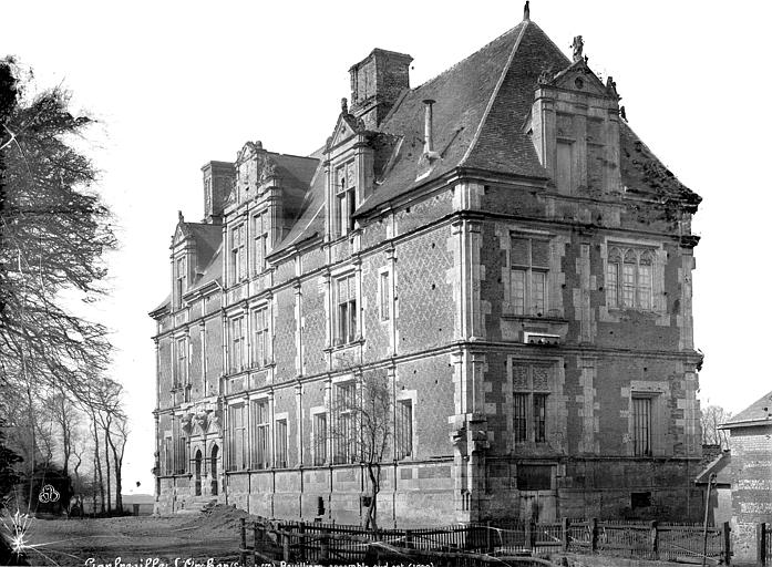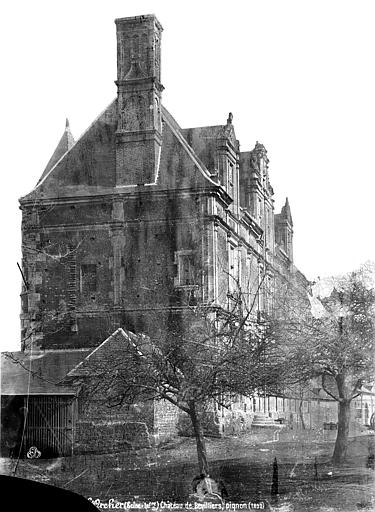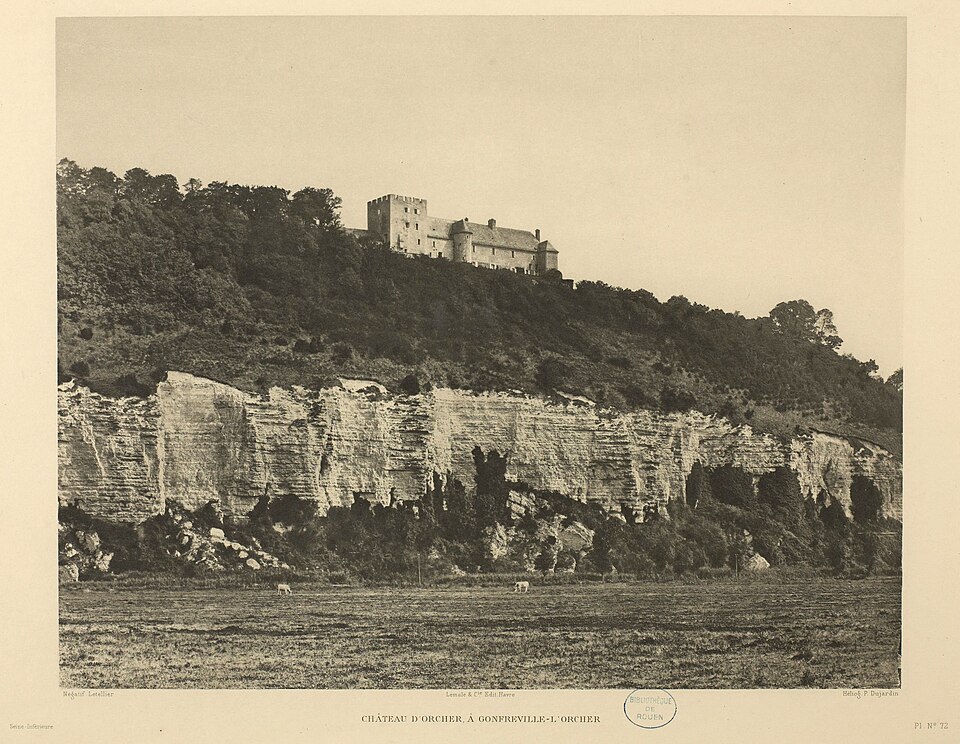 Le château d'Orcher domine l'estuaire de la Seine depuis une falaise abrupte, à Gonfreville-l'Orcher, en Seine-Maritime (Normandie), à près de cent mètres au‑dessus de l'eau. Le fief d'Auricher est attesté en 1140 ; une autre mention le fait remonter à un don de Rollon en 912 au profit d'un certain Auricher, qui y fit bâtir une fortification avec une chapelle dédiée à Sainte‑Honorine. Le domaine aurait été érigé par le duc de Normandie, peut‑être en même temps que le fief de Tancarville. Le château primitif comportait un donjon carré entouré d'une enceinte trapézoïdale défendue, au XIIIe siècle, par trois tours carrées. En 1360 le donjon fut partiellement détruit par les officiers d'Harfleur ; après reconstruction, l'ensemble fut pris par les Anglais en 1415. Henri V déposséda alors la famille Crespin au profit de John Fastolf, puis le domaine fut rendu au duc de Bedford en 1434 ; il revint aux Crespin en 1449, passa par héritage à la famille de Brézé en 1488, à la famille d'O en 1539, puis à d'autres seigneurs. En 1604 la terre d'Orcher est décrite saisie aux mains de Georges Laillet et qualifiée de « plein fief de haubert avec château, forteresse et maison couverte d'ardoise ». La famille Potier était propriétaire de 1632 à 1719, année de la vente au financier John Law ; le domaine fut ensuite adjugé en 1723 à Philippe de Vitry puis vendu en 1735 à Thomas de Planterose. Planterose fit transformer le château pendant dix ans par les maçons François de la Motte et Jacques Lesueur, avec Courtel comme maître plâtrier, et le menuisier havrais Le Roux réalisa les boiseries. À cette époque les deux tours nord et le grand donjon nord‑ouest en ruines furent démolis avec les courtines. Après la Révolution, lors de la division du domaine en 1795, le château est décrit comme « maison d'habitation château et accessoire, et une ferme de 145 acres ». Au XIXe siècle la maison de Rochechouart entreprit une restauration en 1857 confiée à l'architecte Pierre Philippon. Par mariages et successions, la propriété passa aux familles Duhamel de Melmont, de Nagu, de Rochechouart et, par alliance, à la maison d'Harcourt, qui la possède encore selon les informations figurant dans la notice. Le château actuel résulte d'une construction des XIe‑XIIe siècles, d'une restauration au XVe siècle et de transformations au XVIIIe siècle. Sur le plan des protections, le grand salon du rez‑de‑chaussée est classé monument historique par arrêté du 12 février 1976 ; les façades et toitures du château, des communs et du colombier, l'escalier avec sa rampe et plusieurs pièces avec leur décor (petit salon et salle à manger au rez‑de‑chaussée, chambres n° 1 dite « de la Tour », n° 2 et n° 7 au premier étage de la tour est) sont inscrits par le même arrêté.