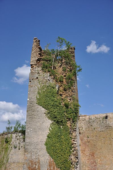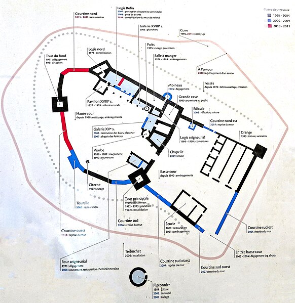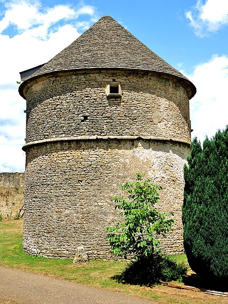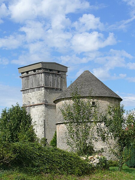 Le château est implanté au bord d'un plateau calcaire et tire parti du relief naturel pour sa défense au nord ; les autres côtés sont protégés par un rempart semi-circulaire comportant autrefois un donjon aujourd'hui disparu et trois tours carrées reliées par des courtines. Ce rempart est entouré d'un fossé profond creusé dans le calcaire, qui atteint par endroits dix mètres de profondeur et près de vingt mètres de largeur, délimitant la haute cour ou cour d'habitation. À l'est, une seconde enceinte entourait la basse cour, qui communiquait avec la haute cour par un passage dans la courtine protégé par un pont-levis ; on y trouvaient les granges et les écuries. La haute cour réunit le logis seigneurial, anciennement donjon, des habitations des XIIe et XVe siècles adossées à l'enceinte, la chapelle, le four, et le puits dont la profondeur est de 22,5 mètres. À l'extérieur, près du potager, se dresse un imposant pigeonnier ; à l'intérieur du château subsistent arcades, galerie à l'italienne, une salle à manger, le four à pain, ainsi que des éléments architecturaux et décoratifs signalés sur place.