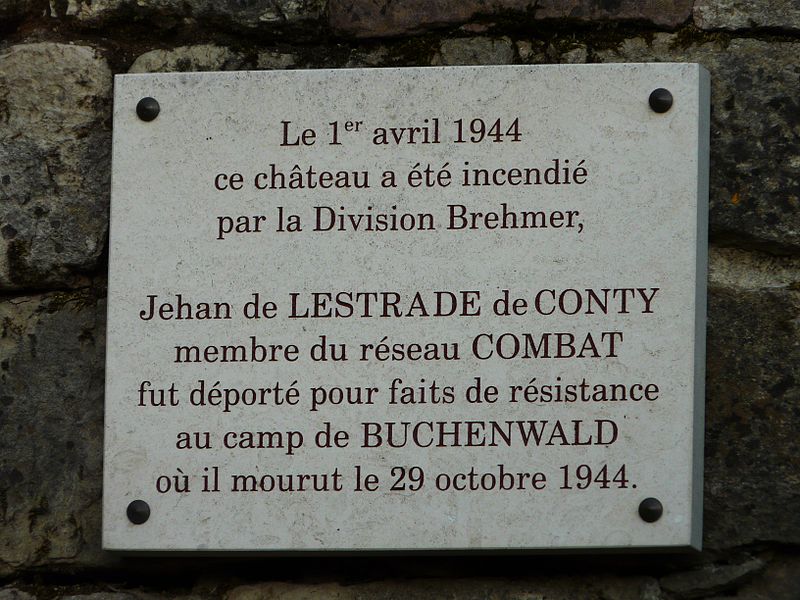 Le 1er avril 1944, des militaires allemands interpellèrent les propriétaires, Jehan et Louis de Lestrade de Conty, membres d’un réseau de résistance ; le château fut pillé et incendié, les deux hommes déportés à Buchenwald où Jehan de Lestrade mourut. Après la Libération, le château fut restauré au titre des dommages de guerre, mais l’incendie de 1944 fit disparaître l’essentiel des aménagements intérieurs anciens. L’édifice et son ensemble ont été inscrits au titre des monuments historiques le 11 septembre 2007.