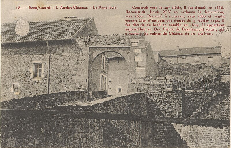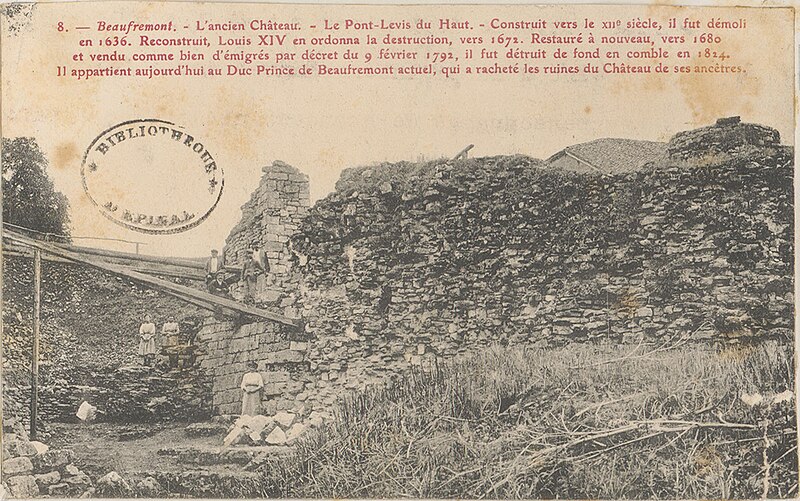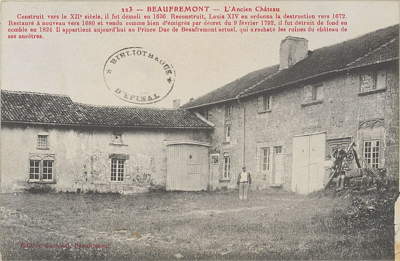Le château de Beaufremont, situé dans la commune éponyme des Vosges, n'existe aujourd'hui que par ses vestiges. Des mentions documentaires le signalent dès le milieu du XIe siècle ; il est cité en 1157 et apparaît aussi comme château fort du XIIe siècle, appartenant à la famille de Bauffremont. L'enceinte a été reconstruite aux XIIIe, XIVe et XVe siècles, les vestiges situés au nord étant les plus anciens. La chapelle castrale date de la fin du XIVe siècle. Le logis seigneurial, appelé « maysonnement neuf », a été reconstruit à la fin du XVe siècle ou au début du XVIe siècle, vraisemblablement pour Claude d'Arberg. Un colombier, établi à l'extérieur de l'enceinte, porte la date de 1607. Le château a été démantelé en 1634 lors de la guerre de Trente Ans. Au début du XIXe siècle, un corps en retour d'équerre du logis et les dépendances de la basse-cour ont été édifiés ; ces dernières sont aujourd'hui en ruines. Un corps dans le prolongement du logis a été ajouté au XXe siècle et le colombier a été transformé en chapelle Saint-Joseph. Les vestiges de l'enceinte et du logis, ainsi que l'ensemble du sol comprenant fossés et contrescarpe, ont été classés au titre des monuments historiques par arrêté du 30 septembre 1994. Parmi les éléments encore attestés figurent une cuisine voûtée (coquina), de vieilles tourelles, des contreforts, un pont-levis et diverses dépendances, connus aussi par des vues historiques.