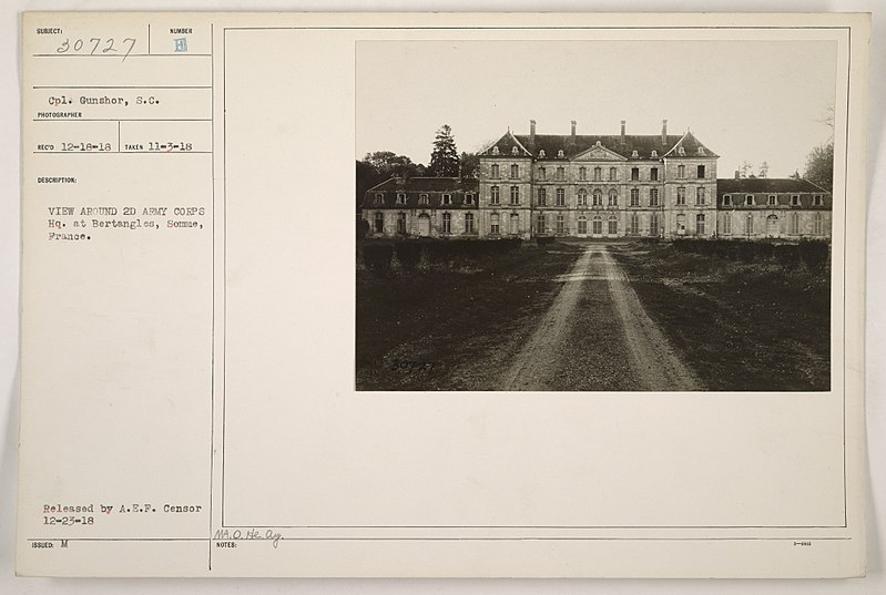 Les façades et toitures ; l'escalier intérieur et sa rampe en fer forgé ; la cour d'honneur avec son portail d'entrée, y compris la grille, l'allée des lions avec les deux piliers surmontés de lions sculptés ; le jardin ; les deux portails situés à droite et à gauche du château ; le portail de l'ancien château (actuellement portail d'entrée de la ferme) ; les huit portails secondaires avec leur grille (numérotés 1 à 8 sur le plan du dossier) ; le manège, le pigeonnier, le puits (cad. Bertangles A 44 à 47, 157, 158 ; C 11) ; l'allée d'accès au château (cad. Poulainville ZD 36, 37) : classement par arrêté du 12 juillet 1982 - Façades et toitures de la ferme ainsi que les deux portails (numérotés 9 et 10 sur le plan du dossier) (cad. Bertangles C 11) : inscription par arrêté du 12 juillet 1982 - Le corps de bâtiments anciennement à usage de sellerie, buanderie et remises de voiture (cad. Bertangles AA 30) : inscription par arrêté du 11 juin 2001 - Le demi rond-point (cad. Poulainville ZX 34) ; les murs de clôture (cad. Bertangles A 202, 158) : classement par arrêté du 12 décembre 2006 - Les parties manquantes du domaine, parties datant jusqu'à l'année 1950 et son parc forestier, comprenant : la maison seigneuriale ; la grange en pierre blanche, située à droite de l'entrée de la ferme, avec la chapelle du XIXe siècle et son caveau ; la grange en pierre blanche, située à gauche de l'entrée de la ferme, avec sa cave voûtée en berceau en anse de panier, rajoutée à une période ultérieure ; la grange d'une quarantaine de mètres de longueur au nord-ouest ; les deux bâtiments installés après 1745 dans le prolongement de la maison seigneuriale ; la grange ou remise, en ossature bois et torchis, construite à l'emplacement du bâtiment en retour de la maison seigneuriale ; l'aumônerie, située au passage de la porte donnant accès de la cour de la ferme au château ; le parc forestier ; le portail de la ferme et les portails et murs du parc qui n'ont pas encore été pris en compte, répartis en limite de propriété (cad. A 219 ; AA 3, 27 à 30) : inscription par arrêté du 18 décembre 2009