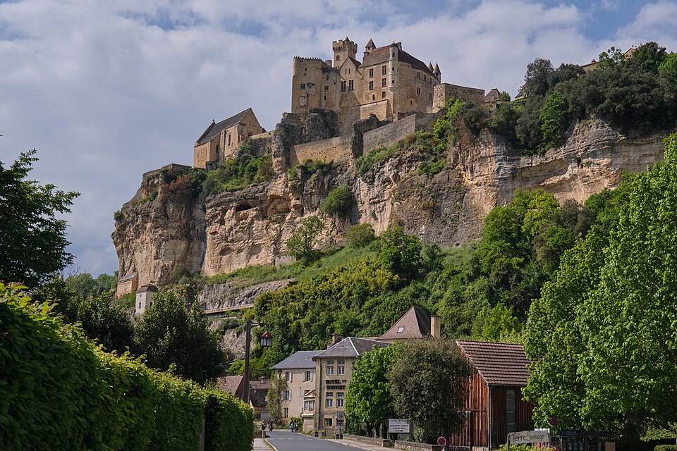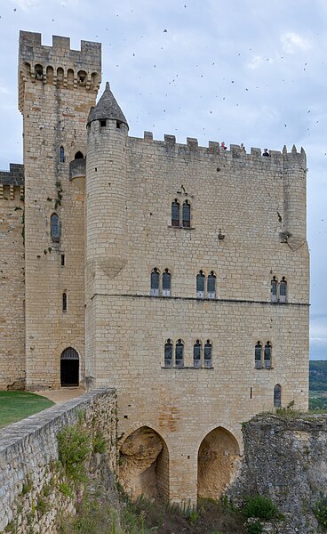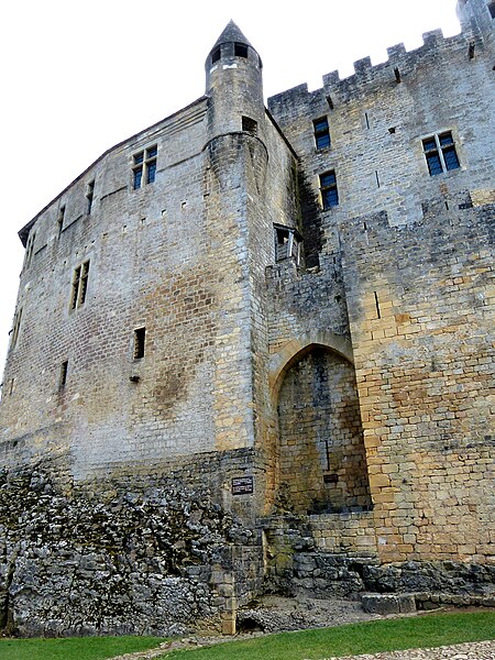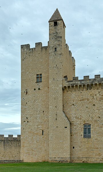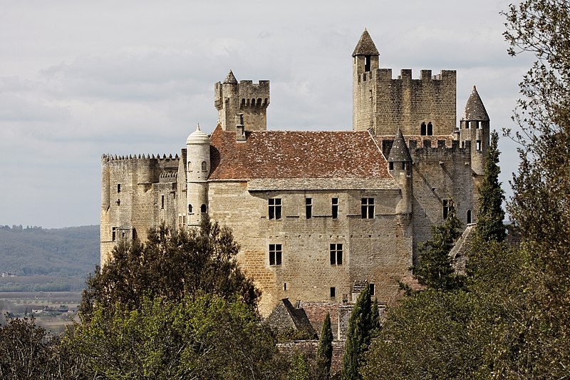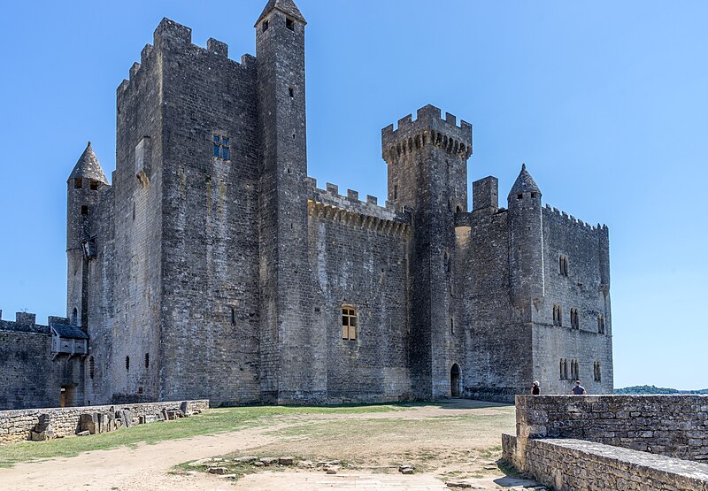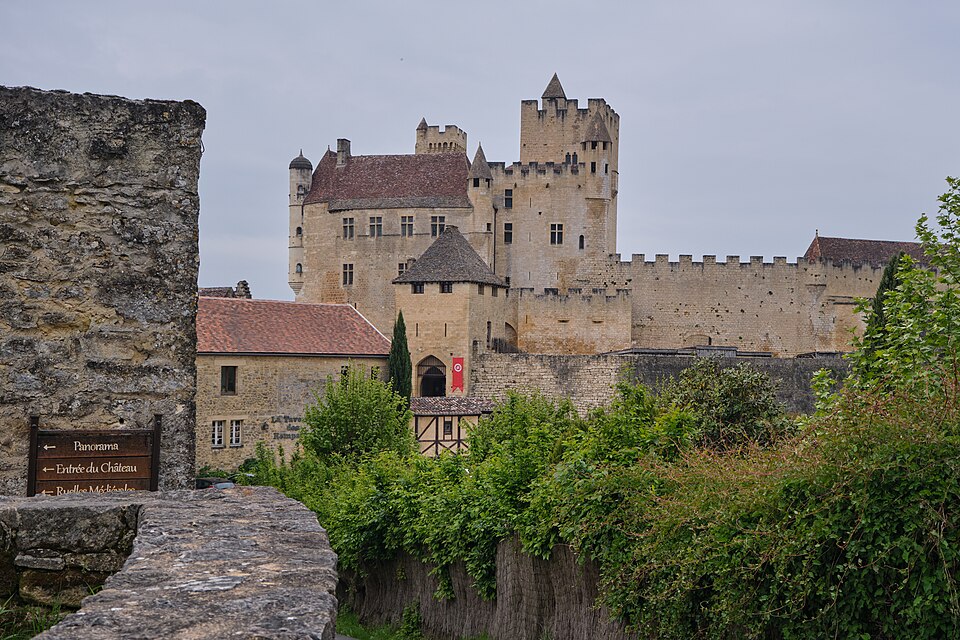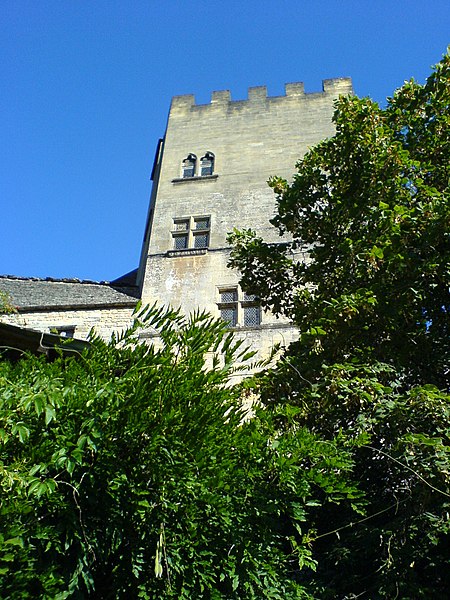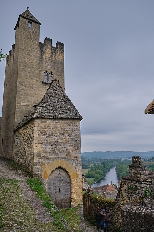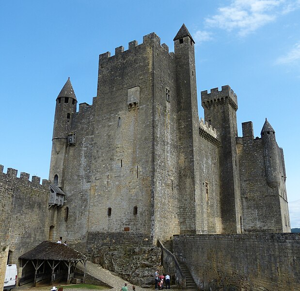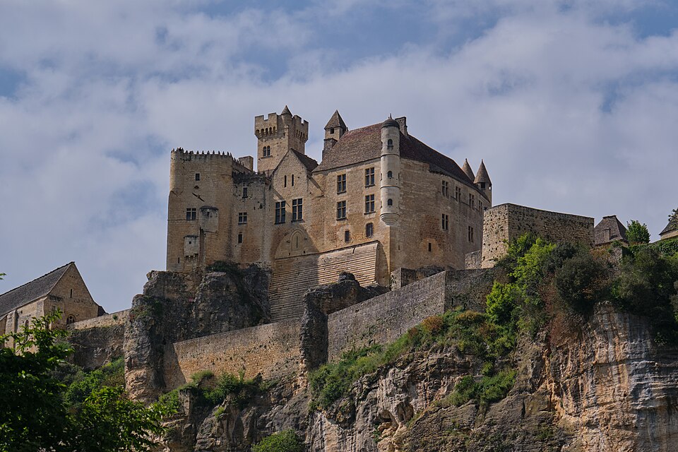 Le château de Beynac, perché sur un éperon calcaire dominant la Dordogne à Beynac‑et‑Cazenac, est classé monument historique et figure parmi les mieux conservés du Périgord noir. Le site a probablement été occupé dès le haut Moyen Âge et les seigneurs de Beynac sont attestés à la fin du XIe siècle ; le château lui‑même a été bâti dès le XIIe siècle par les barons de Beynac pour verrouiller la vallée. Au début du XIIe siècle, Simon de Montfort fit détruire des parties du château, puis la seigneurie devint fief du comte de Toulouse en 1238 ; par le traité de Brétigny, Beynac passa sous domination anglaise avant de se rallier à Charles V en 1368. Après la mort d'Adhémar de Beynac, Richard Cœur de Lion offrit la seigneurie à Mercadier, qui fut assassiné en 1200, et la baronnie revint ensuite à la famille d'origine ; la châtellenie fut divisée à partir de 1241 entre deux branches qui ne se réunirent qu'en 1379. Pendant la guerre de Cent Ans, la forteresse constituait l'une des places fortes françaises face aux possessions anglaises de l'autre rive, où se dressait notamment le château de Castelnaud. Extérieurement, le château a conservé son organisation médiévale : il occupe un vaste quadrilatère irrégulier bordant le roc, avec au nord‑ouest un donjon carré crénelé flanqué d'une tourelle d'escalier. Un mur de courtine à mâchicoulis relie ce donjon à une tour et à un bastion méridional qui protégeait les faces ouest et sud ; ce bastion est coiffé d'un crénelage et de deux tourelles cylindriques d'angle. Les corps de logis se développent sur les faces sud et est et ont été remaniés aux XVIe et XVIIe siècles, avec l'ajout d'une tourelle en encorbellement et d'un escalier de plan carré desservant des appartements. La face nord est fermée par un mur de courtine crénelé, renforcé à l'un de ses angles par une tourelle en encorbellement. Une cour intérieure éclaire deux escaliers : l'un dessert le donjon et les salles de défense, l'autre, construit au XVIIe siècle, conduit aux appartements ornés de boiseries, de poutres sculptées et de peintures d'entrelacs et de rinceaux. Deux pièces présentent un décor peint du XVIIe siècle, et la salle dite des États du Périgord conserve une cheminée Renaissance richement sculptée ainsi qu'un oratoire peint au XVe siècle. Aux abords se trouvent la poterne, des tourelles défensives, des bâtiments de communs reliés aux terrasses et l'église du bourg. Sous le château, un bâtiment rectangulaire de deux étages sur rez‑de‑chaussée, formé de deux grandes salles et accessible par une porte à linteau droit côté ouest, a été interprété tantôt comme abbaye ou prieuré, tantôt plus vraisemblablement comme l'ancien présidial ; la qualité de la maçonnerie du second étage laisse supposer une salle d'apparat. Le château, protégé côté plateau par une double enceinte et bâti sur un surplomb culminant à pic, a fait l'objet de restaurations au XXe siècle après son achat en 1962 par Lucien Grosso, qui, aidé de Denise Grosso, entreprit sa remise en état ; le couple légua ensuite le domaine à Albéric de Montgolfier. Classé par arrêté en 1944, le site accueille un public nombreux et a reçu 125 000 visiteurs en 2022. Le château a enfin servi de décor à de nombreux films et séries, parmi lesquels Le Capitan, Ever After (À tout jamais), Le Chocolat et The Last Duel.