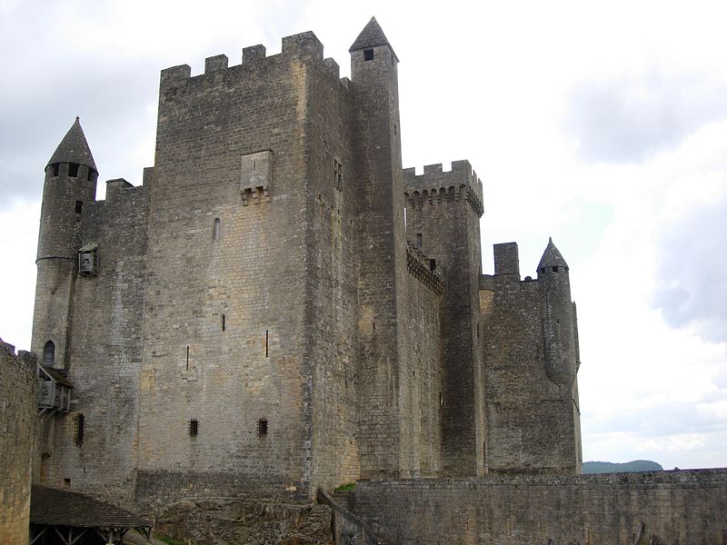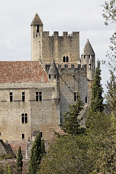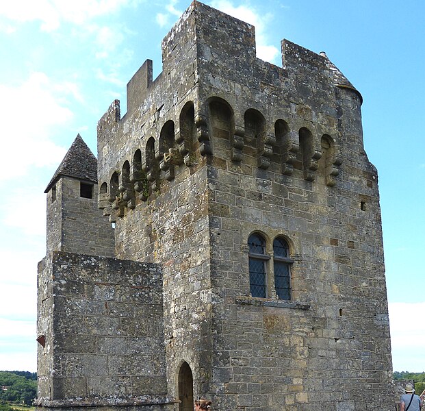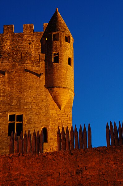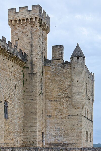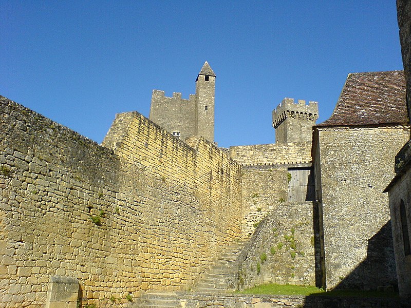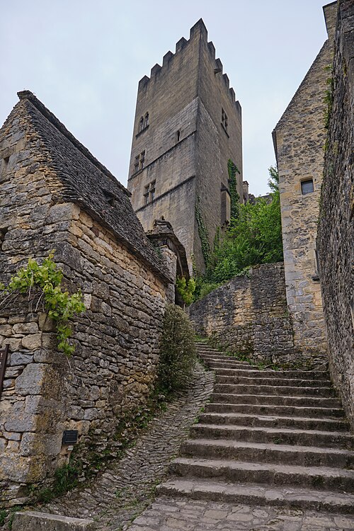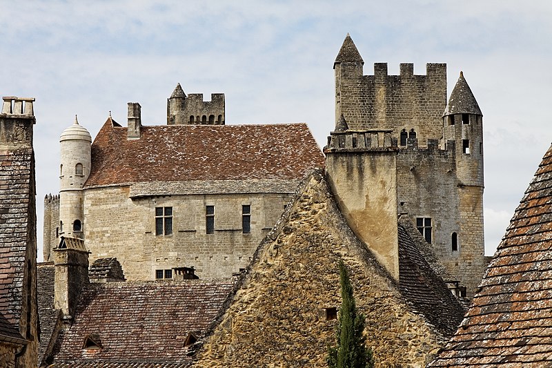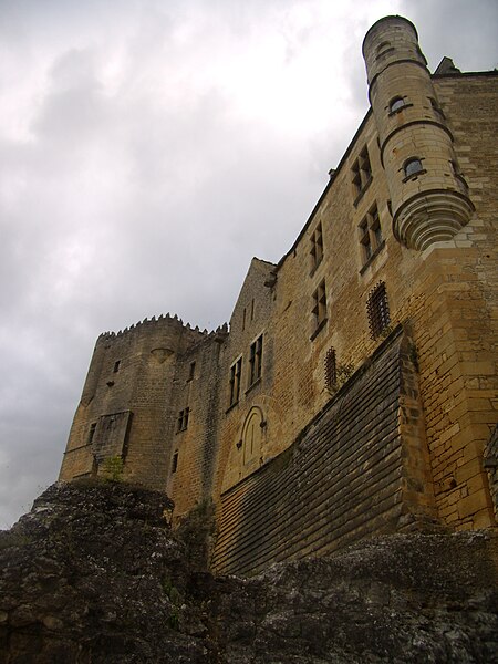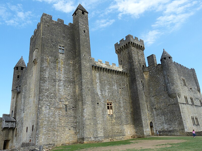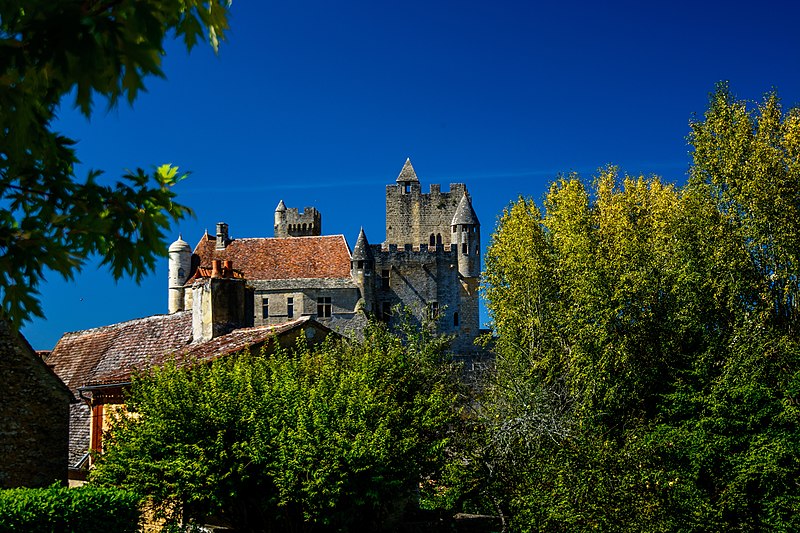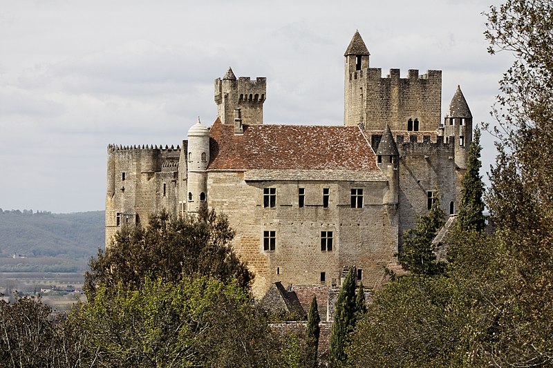 Le château de Beynac, perché sur un éperon calcaire dominant la Dordogne à Beynac‑et‑Cazenac, est classé monument historique et figure parmi les mieux conservés du Périgord noir. Le site a probablement été occupé dès le haut Moyen Âge et les seigneurs de Beynac sont attestés à la fin du XIe siècle ; le château lui‑même a été bâti dès le XIIe siècle par les barons de Beynac pour verrouiller la vallée. Au début du XIIe siècle, Simon de Montfort fit détruire des parties du château, puis la seigneurie devint fief du comte de Toulouse en 1238 ; par le traité de Brétigny, Beynac passa sous domination anglaise avant de se rallier à Charles V en 1368. Après la mort d'Adhémar de Beynac, Richard Cœur de Lion offrit la seigneurie à Mercadier, qui fut assassiné en 1200, et la baronnie revint ensuite à la famille d'origine ; la châtellenie fut divisée à partir de 1241 entre deux branches qui ne se réunirent qu'en 1379. Pendant la guerre de Cent Ans, la forteresse constituait l'une des places fortes françaises face aux possessions anglaises de l'autre rive, où se dressait notamment le château de Castelnaud. Extérieurement, le château a conservé son organisation médiévale : il occupe un vaste quadrilatère irrégulier bordant le roc, avec au nord‑ouest un donjon carré crénelé flanqué d'une tourelle d'escalier. Un mur de courtine à mâchicoulis relie ce donjon à une tour et à un bastion méridional qui protégeait les faces ouest et sud ; ce bastion est coiffé d'un crénelage et de deux tourelles cylindriques d'angle. Les corps de logis se développent sur les faces sud et est et ont été remaniés aux XVIe et XVIIe siècles, avec l'ajout d'une tourelle en encorbellement et d'un escalier de plan carré desservant des appartements. La face nord est fermée par un mur de courtine crénelé, renforcé à l'un de ses angles par une tourelle en encorbellement. Une cour intérieure éclaire deux escaliers : l'un dessert le donjon et les salles de défense, l'autre, construit au XVIIe siècle, conduit aux appartements ornés de boiseries, de poutres sculptées et de peintures d'entrelacs et de rinceaux. Deux pièces présentent un décor peint du XVIIe siècle, et la salle dite des États du Périgord conserve une cheminée Renaissance richement sculptée ainsi qu'un oratoire peint au XVe siècle. Aux abords se trouvent la poterne, des tourelles défensives, des bâtiments de communs reliés aux terrasses et l'église du bourg. Sous le château, un bâtiment rectangulaire de deux étages sur rez‑de‑chaussée, formé de deux grandes salles et accessible par une porte à linteau droit côté ouest, a été interprété tantôt comme abbaye ou prieuré, tantôt plus vraisemblablement comme l'ancien présidial ; la qualité de la maçonnerie du second étage laisse supposer une salle d'apparat. Le château, protégé côté plateau par une double enceinte et bâti sur un surplomb culminant à pic, a fait l'objet de restaurations au XXe siècle après son achat en 1962 par Lucien Grosso, qui, aidé de Denise Grosso, entreprit sa remise en état ; le couple légua ensuite le domaine à Albéric de Montgolfier. Classé par arrêté en 1944, le site accueille un public nombreux et a reçu 125 000 visiteurs en 2022. Le château a enfin servi de décor à de nombreux films et séries, parmi lesquels Le Capitan, Ever After (À tout jamais), Le Chocolat et The Last Duel.