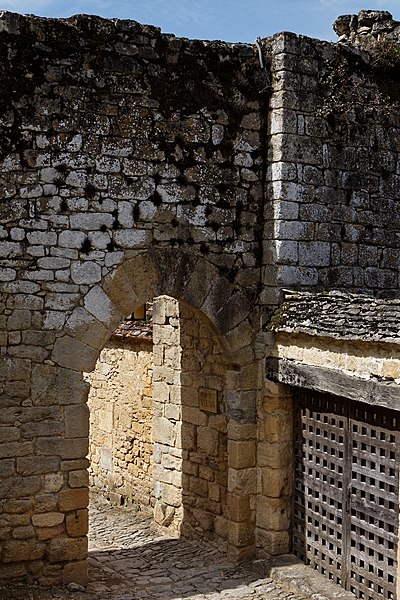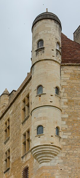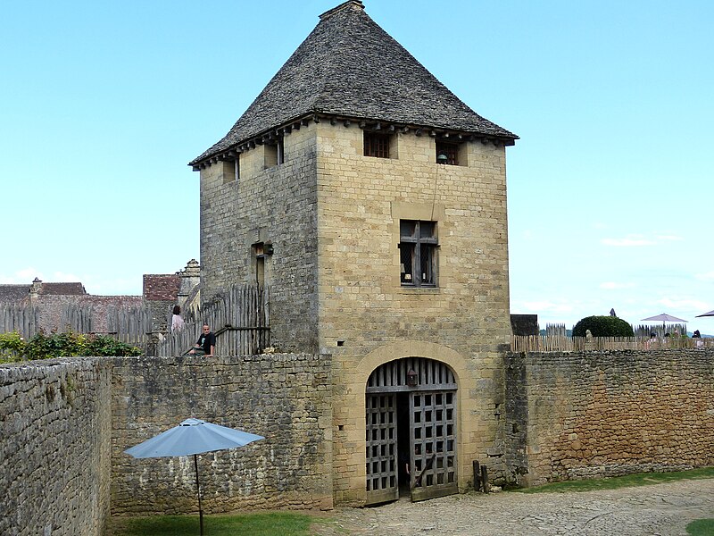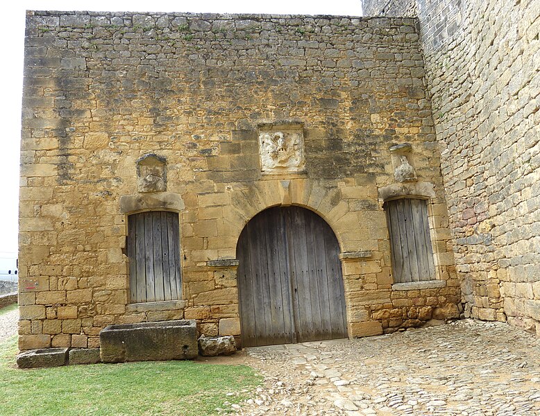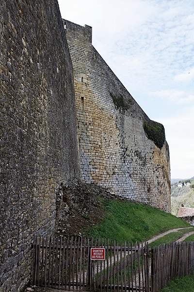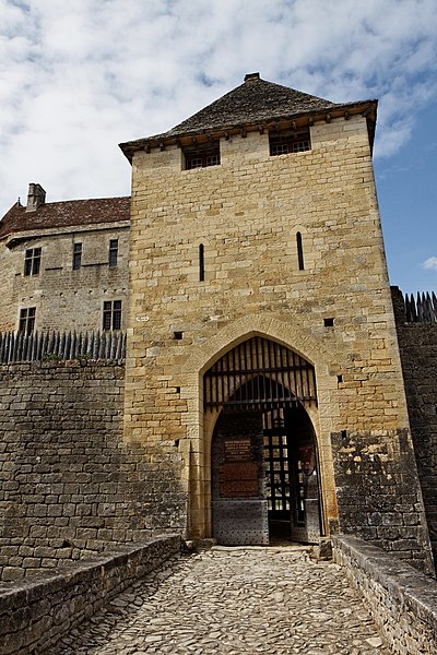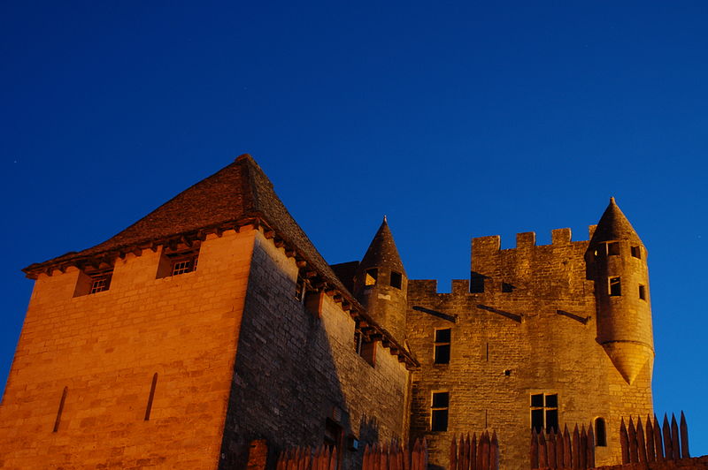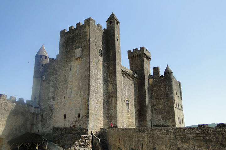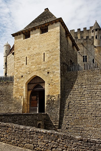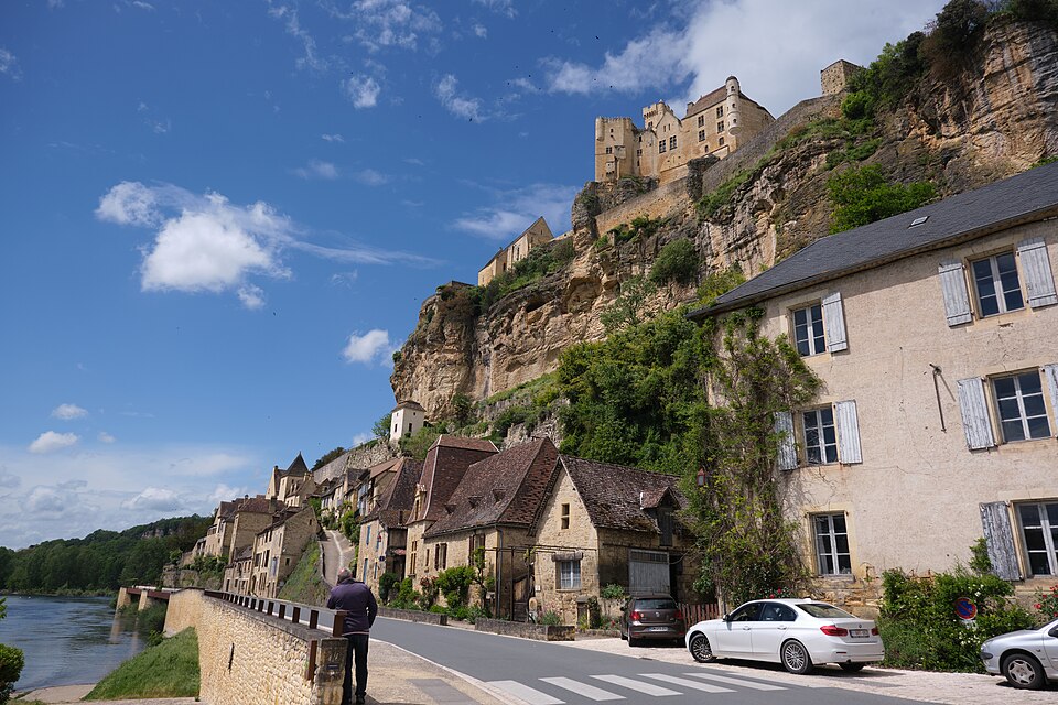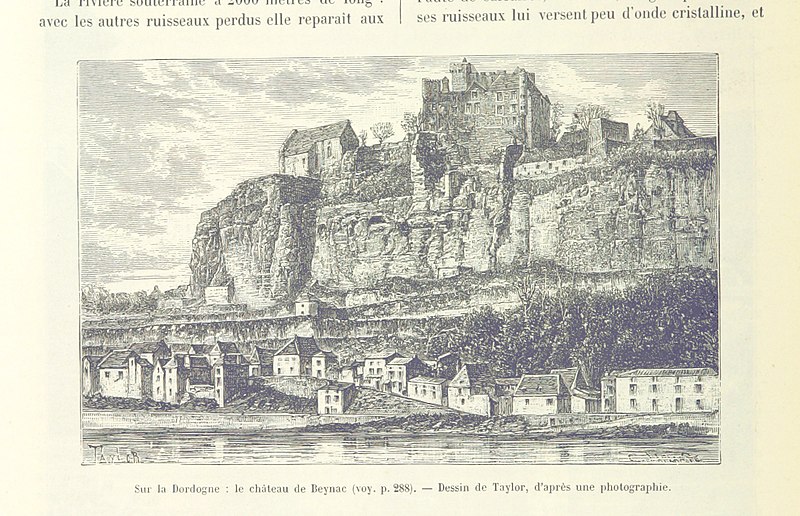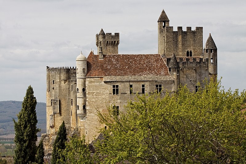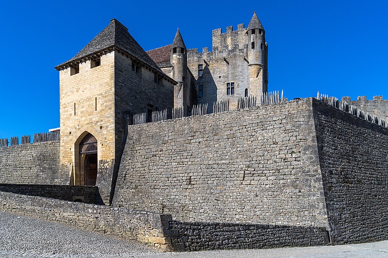 Le château de Beynac, perché sur un éperon calcaire dominant la Dordogne à Beynac‑et‑Cazenac, est classé monument historique et figure parmi les mieux conservés du Périgord noir. Le site a probablement été occupé dès le haut Moyen Âge et les seigneurs de Beynac sont attestés à la fin du XIe siècle ; le château lui‑même a été bâti dès le XIIe siècle par les barons de Beynac pour verrouiller la vallée. Au début du XIIe siècle, Simon de Montfort fit détruire des parties du château, puis la seigneurie devint fief du comte de Toulouse en 1238 ; par le traité de Brétigny, Beynac passa sous domination anglaise avant de se rallier à Charles V en 1368. Après la mort d'Adhémar de Beynac, Richard Cœur de Lion offrit la seigneurie à Mercadier, qui fut assassiné en 1200, et la baronnie revint ensuite à la famille d'origine ; la châtellenie fut divisée à partir de 1241 entre deux branches qui ne se réunirent qu'en 1379. Pendant la guerre de Cent Ans, la forteresse constituait l'une des places fortes françaises face aux possessions anglaises de l'autre rive, où se dressait notamment le château de Castelnaud. Extérieurement, le château a conservé son organisation médiévale : il occupe un vaste quadrilatère irrégulier bordant le roc, avec au nord‑ouest un donjon carré crénelé flanqué d'une tourelle d'escalier. Un mur de courtine à mâchicoulis relie ce donjon à une tour et à un bastion méridional qui protégeait les faces ouest et sud ; ce bastion est coiffé d'un crénelage et de deux tourelles cylindriques d'angle. Les corps de logis se développent sur les faces sud et est et ont été remaniés aux XVIe et XVIIe siècles, avec l'ajout d'une tourelle en encorbellement et d'un escalier de plan carré desservant des appartements. La face nord est fermée par un mur de courtine crénelé, renforcé à l'un de ses angles par une tourelle en encorbellement. Une cour intérieure éclaire deux escaliers : l'un dessert le donjon et les salles de défense, l'autre, construit au XVIIe siècle, conduit aux appartements ornés de boiseries, de poutres sculptées et de peintures d'entrelacs et de rinceaux. Deux pièces présentent un décor peint du XVIIe siècle, et la salle dite des États du Périgord conserve une cheminée Renaissance richement sculptée ainsi qu'un oratoire peint au XVe siècle. Aux abords se trouvent la poterne, des tourelles défensives, des bâtiments de communs reliés aux terrasses et l'église du bourg. Sous le château, un bâtiment rectangulaire de deux étages sur rez‑de‑chaussée, formé de deux grandes salles et accessible par une porte à linteau droit côté ouest, a été interprété tantôt comme abbaye ou prieuré, tantôt plus vraisemblablement comme l'ancien présidial ; la qualité de la maçonnerie du second étage laisse supposer une salle d'apparat. Le château, protégé côté plateau par une double enceinte et bâti sur un surplomb culminant à pic, a fait l'objet de restaurations au XXe siècle après son achat en 1962 par Lucien Grosso, qui, aidé de Denise Grosso, entreprit sa remise en état ; le couple légua ensuite le domaine à Albéric de Montgolfier. Classé par arrêté en 1944, le site accueille un public nombreux et a reçu 125 000 visiteurs en 2022. Le château a enfin servi de décor à de nombreux films et séries, parmi lesquels Le Capitan, Ever After (À tout jamais), Le Chocolat et The Last Duel.