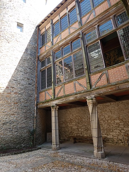 Le château de Bonneval, situé à Coussac-Bonneval (Haute-Vienne), remonte à la fin du XIIIe ou au début du XIVe siècle. Une pierre datée de 930, enchâssée dans la maçonnerie de la tour d'entrée, atteste l'existence d'une forteresse antérieure. L'édifice actuel est probablement l'œuvre de Jean Ier, seigneur de Bonneval. Le plan est sensiblement carré et chaque angle est pourvu d'une tour de défense ; l'habitation, qui s'étend sur deux côtés, ouvre ses fenêtres sur la cour intérieure. Des aménagements et adjonctions furent réalisés à la fin du XVe siècle, notamment les colonnes torsadées qui entourent la cour. Les combles sont couverts d'une charpente en carènes renversées de la fin du XVe siècle. Des embellissements ont été apportés au début du XVIIe siècle. Après 1765, l'aile sud‑ouest fut reconstruite et l'intérieur du château modifié ; la façade sud‑ouest entre les deux tours perdit alors son caractère médiéval, ayant été entièrement remaniée vers 1780. À l'inverse, la façade sud‑est a conservé son aspect primitif de la fin du XIIIe ou du début du XIVe siècle ; le système de défense et la toiture sont restés intacts. Au XIXe siècle, les salons intérieurs furent décorés, les abords transformés et une galerie vitrée d'étage, portée par les colonnes du rez‑de‑chaussée, fut édifiée. Le monument fit l'objet d'une restauration en 1771‑1772 dirigée par l'architecte Broussaud, puis d'une autre intervention en 1900 dans la cour de style Renaissance. Le château est partiellement inscrit au titre des monuments historiques par arrêté du 24 août 1960. Il est resté dans la même famille depuis sa construction, soit près de trente générations, et est associé à la famille de Claude‑Alexandre de Bonneval (1675‑1747), qui, sans avoir été propriétaire, devint pacha après son passage au service de l'Empire ottoman.