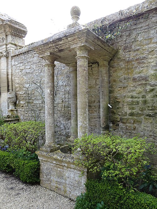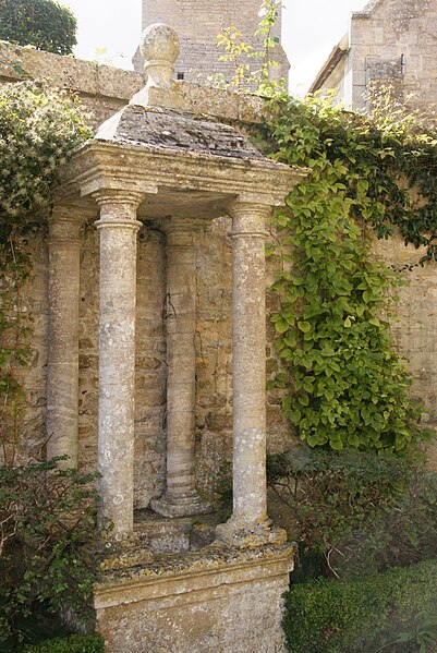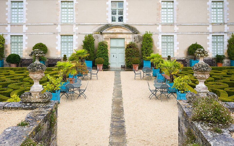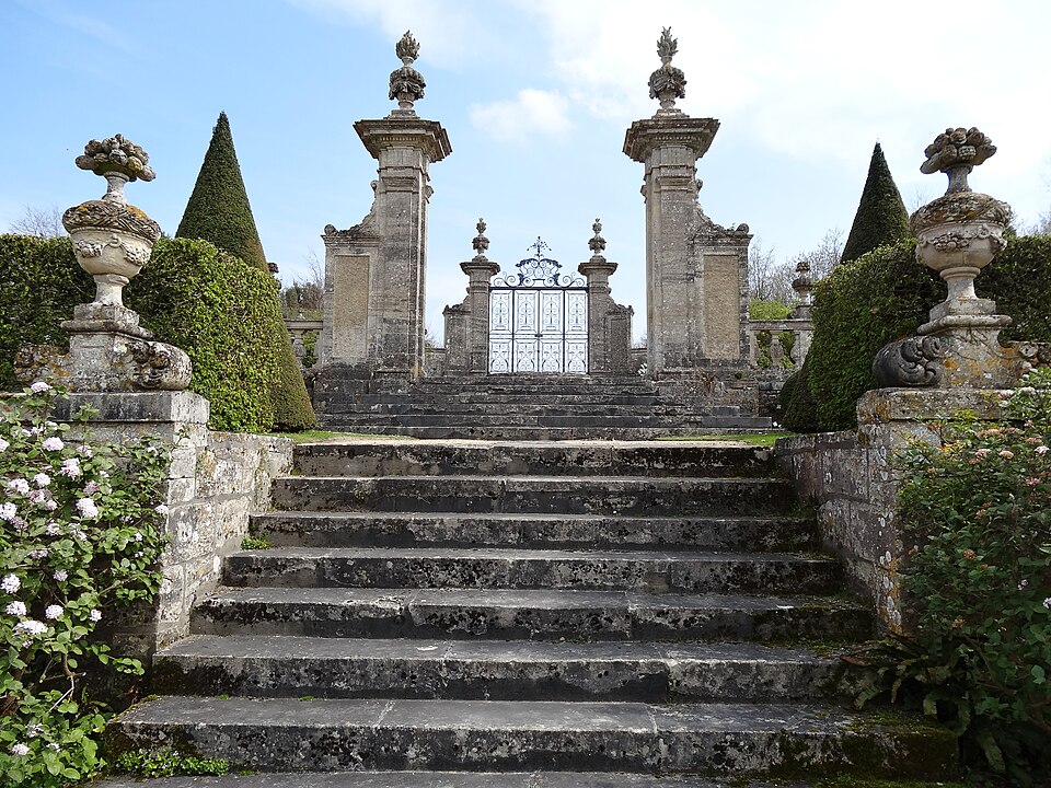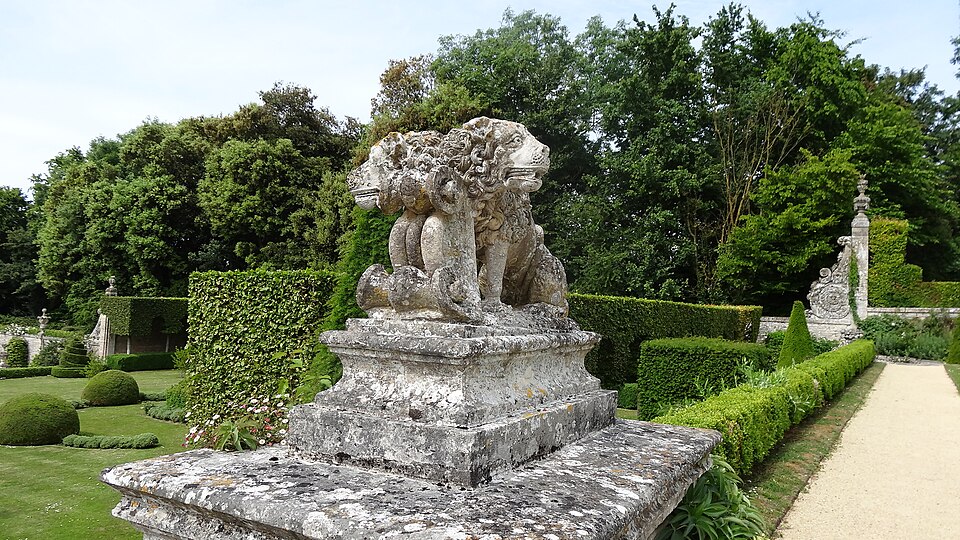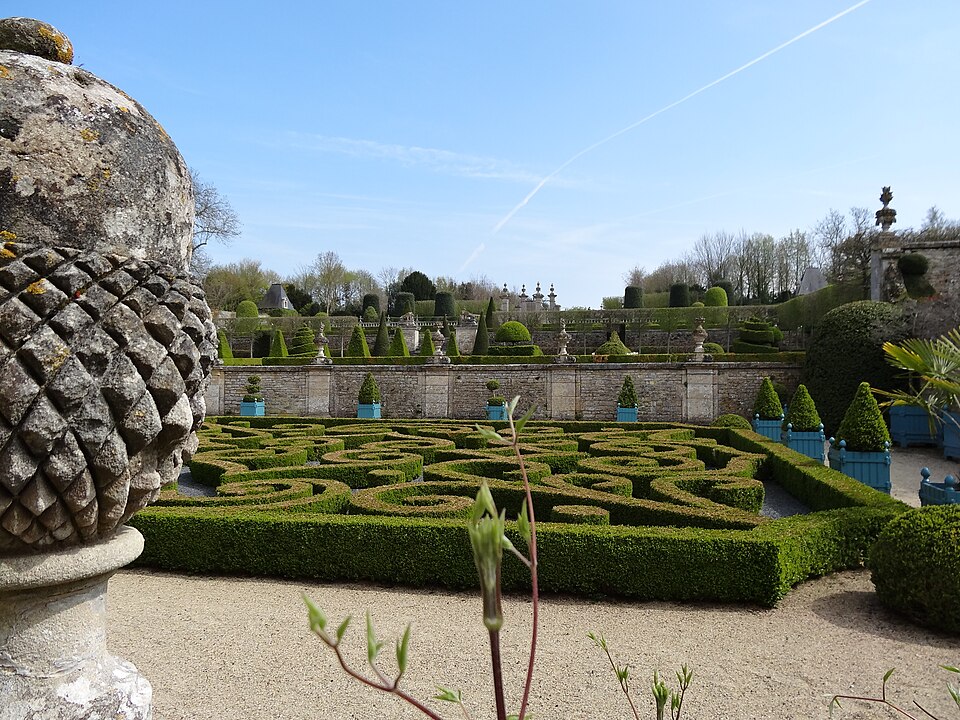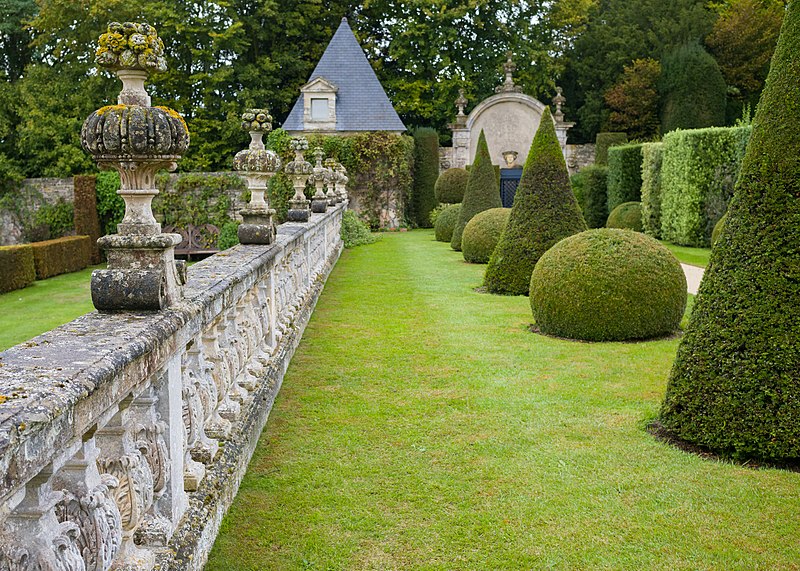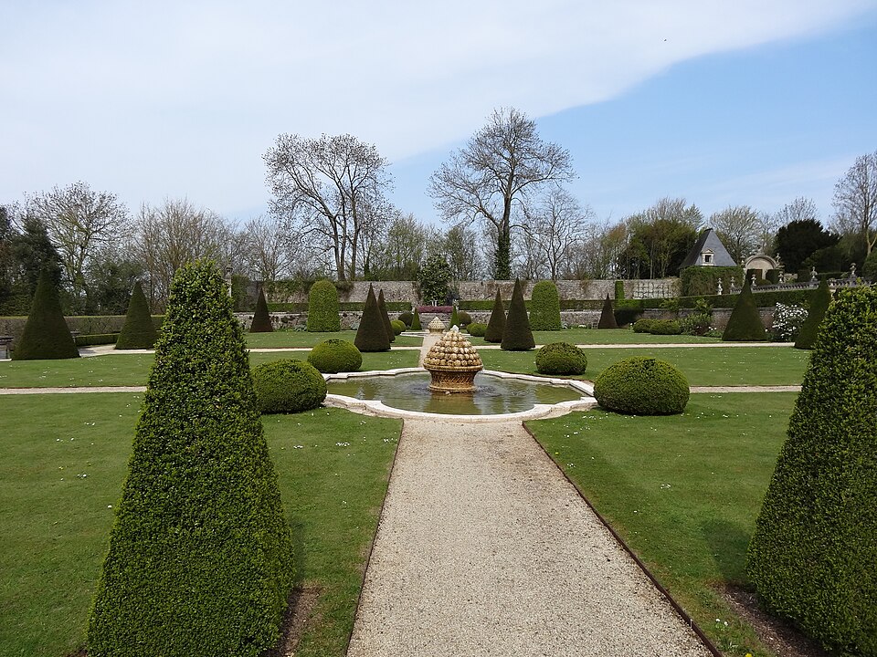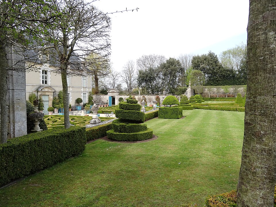 Le jardin mêle influences médiévales et Renaissance italienne tout en annonçant le jardin classique français ; longtemps attribué à Mansart, il est l'un des rares exemples de ce type en France. Quatre terrasses successives, bordées de murets et de balustrades à l'italienne, s'élèvent derrière la maison au-dessus de parterres de broderies ; deux bassins ornés de sculptures d'artichauts occupent la deuxième terrasse. La rigueur de la composition est tempérée par la variété des topiaires et la profusion d'ornements – grands vases, lions et autres sculptures –, tandis que deux pavillons du XVIIIe siècle ponctuent symétriquement l'extrémité du jardin. Onze escaliers de pierre mènent jusqu'à une grille en fer forgé qui se détache sur le ciel ; cette grille, très semblable à celle du château de Carrouges, est attribuée à Isaac Geslin ou à un de ses élèves. L'église Notre-Dame, du XIVe siècle, est attenante et accessible par une petite porte ; à quelques mètres se trouve un bassin dont l'eau était, selon la légende, réputée guérir les yeux au Moyen Âge. Le jardin bénéficie du label « Jardin remarquable » et est ouvert à la visite sous conditions.